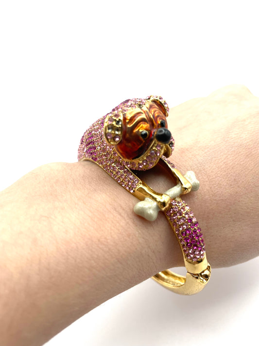 Gold Tone Pink Pave Rhinestones and Enamel Bulldog Hinged Bangle Bracelet Gorgeous