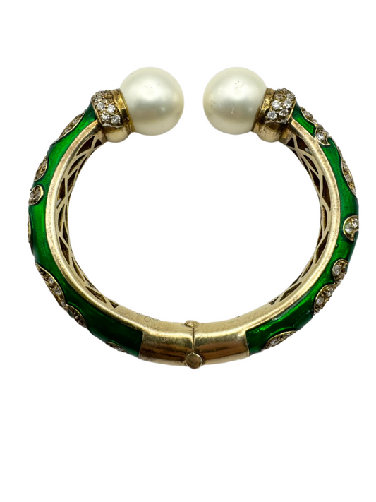 Signed LBC 925 Vermeil Faux Pearl Rhinestone Enamel Clamper Statement Bracelet
