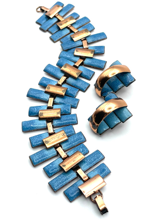 Vintage Matisse Copper and Robin Egg Blue Enamel Earrings and Bracelet Set
