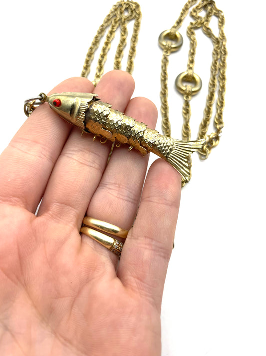 Vintage Monet Gold Tone Articulated Fish Pendant Necklace