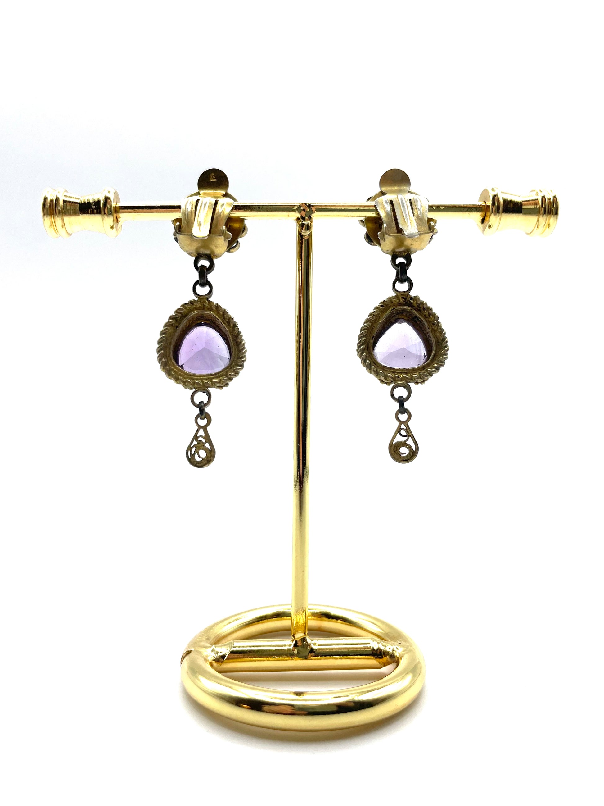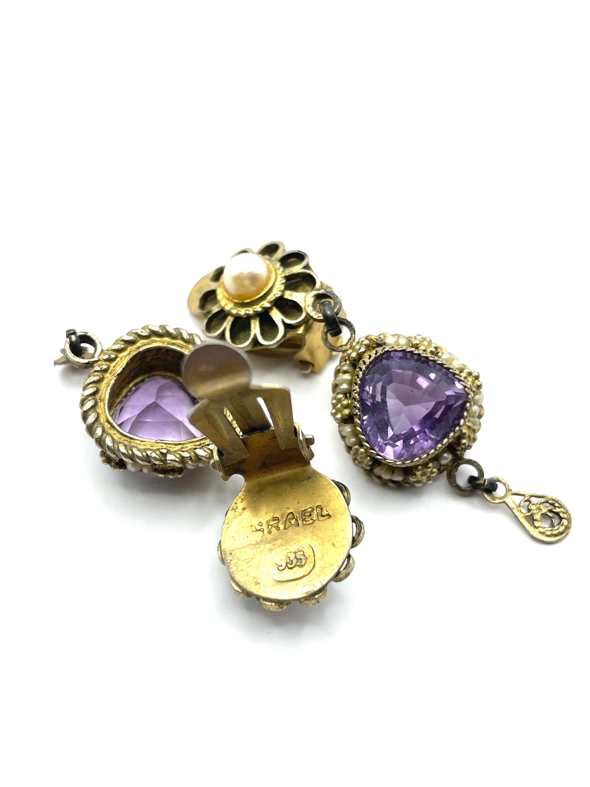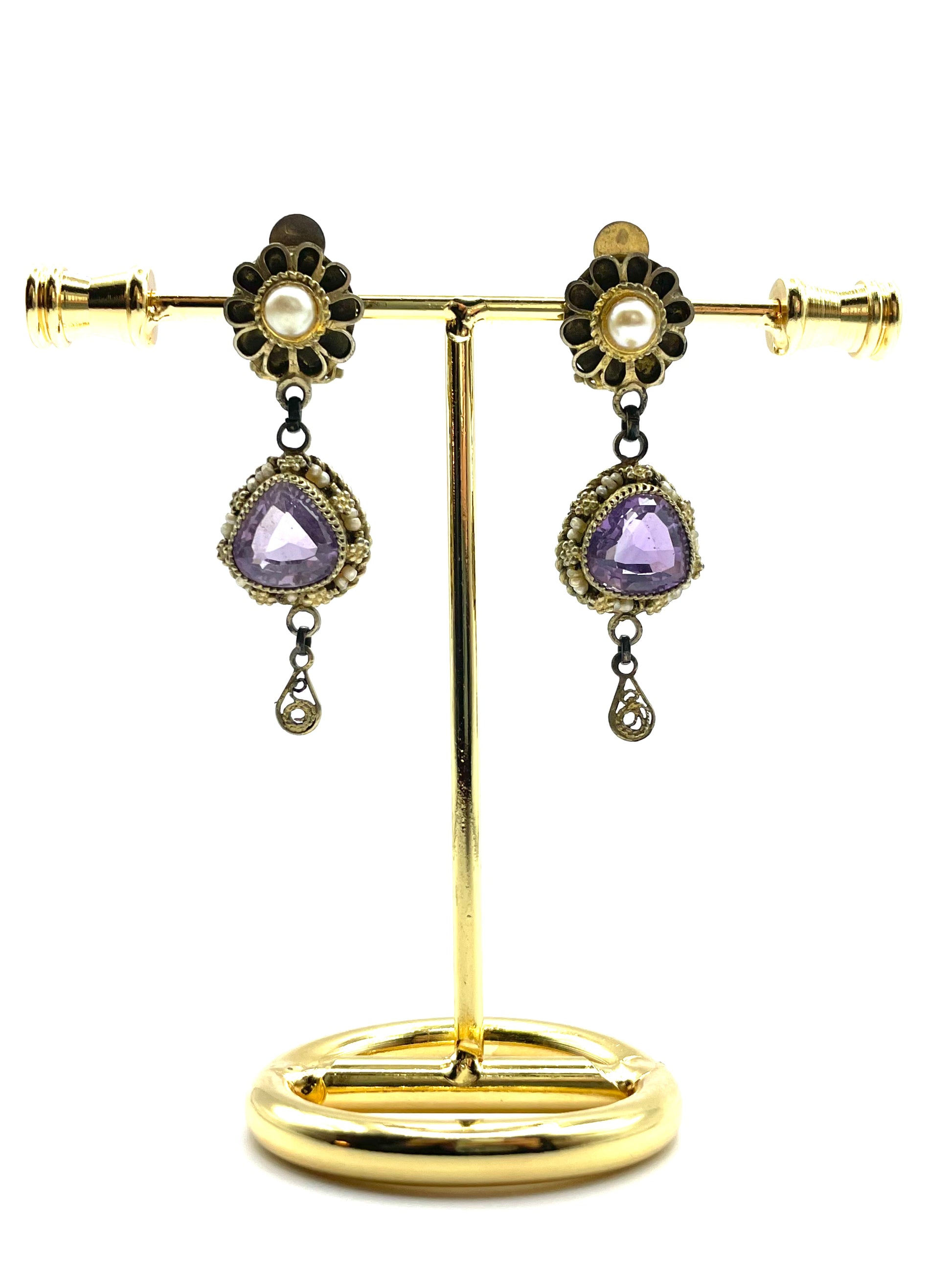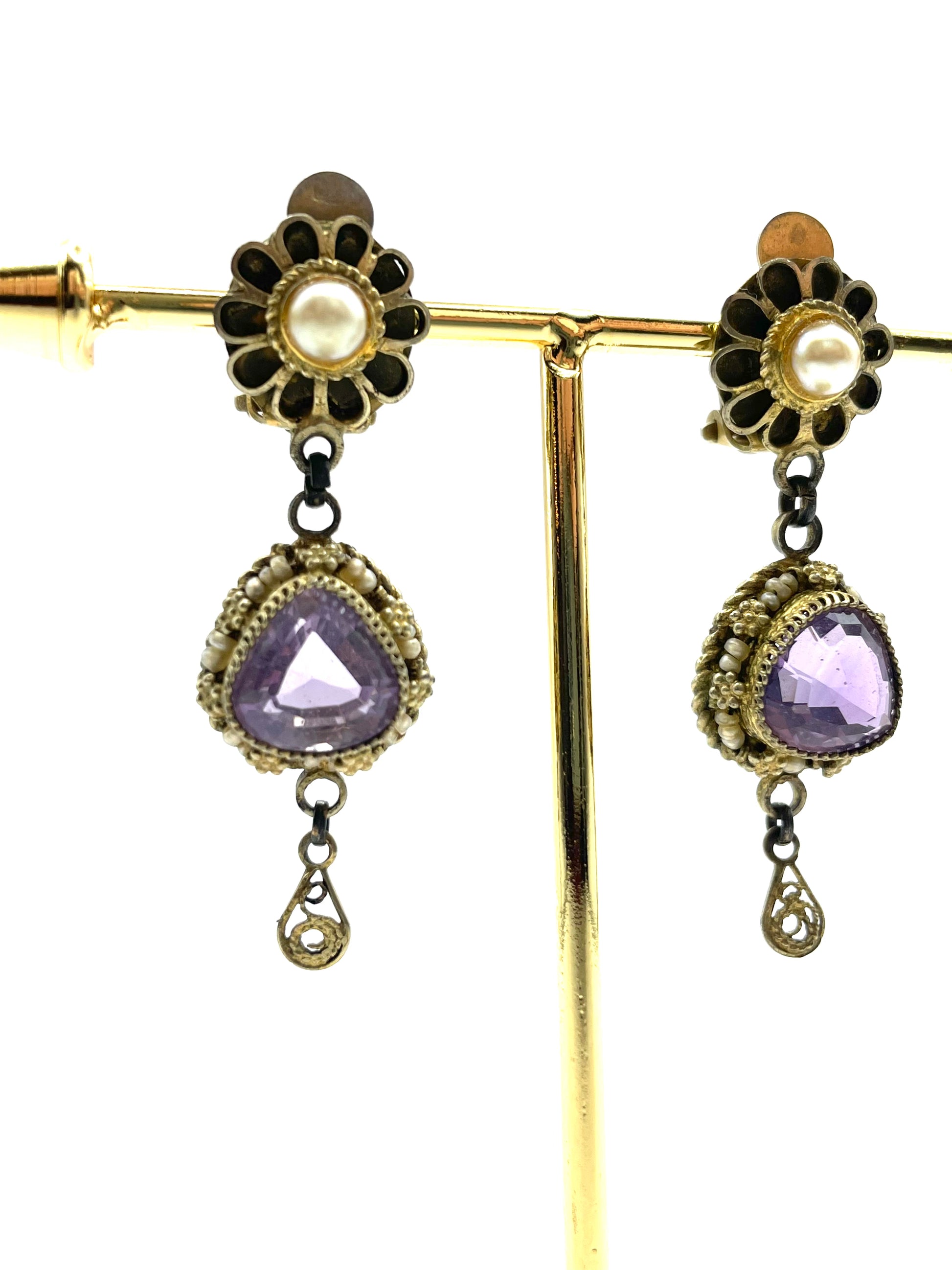 Beautiful handmade vintage signed 'Israel 935', filigree with pearls clip-on earrings. Teardrop shape beautiful trillion-cut purple rhinestone, pearl on the center on top.