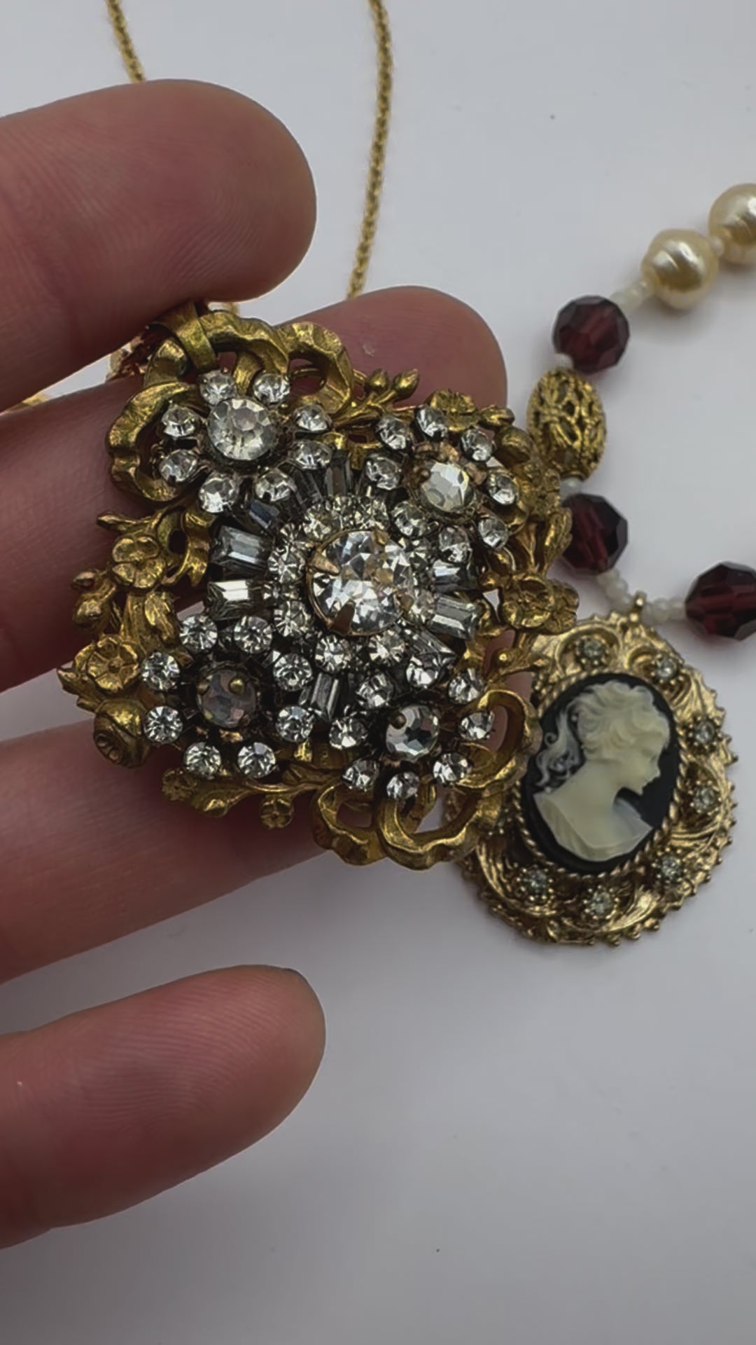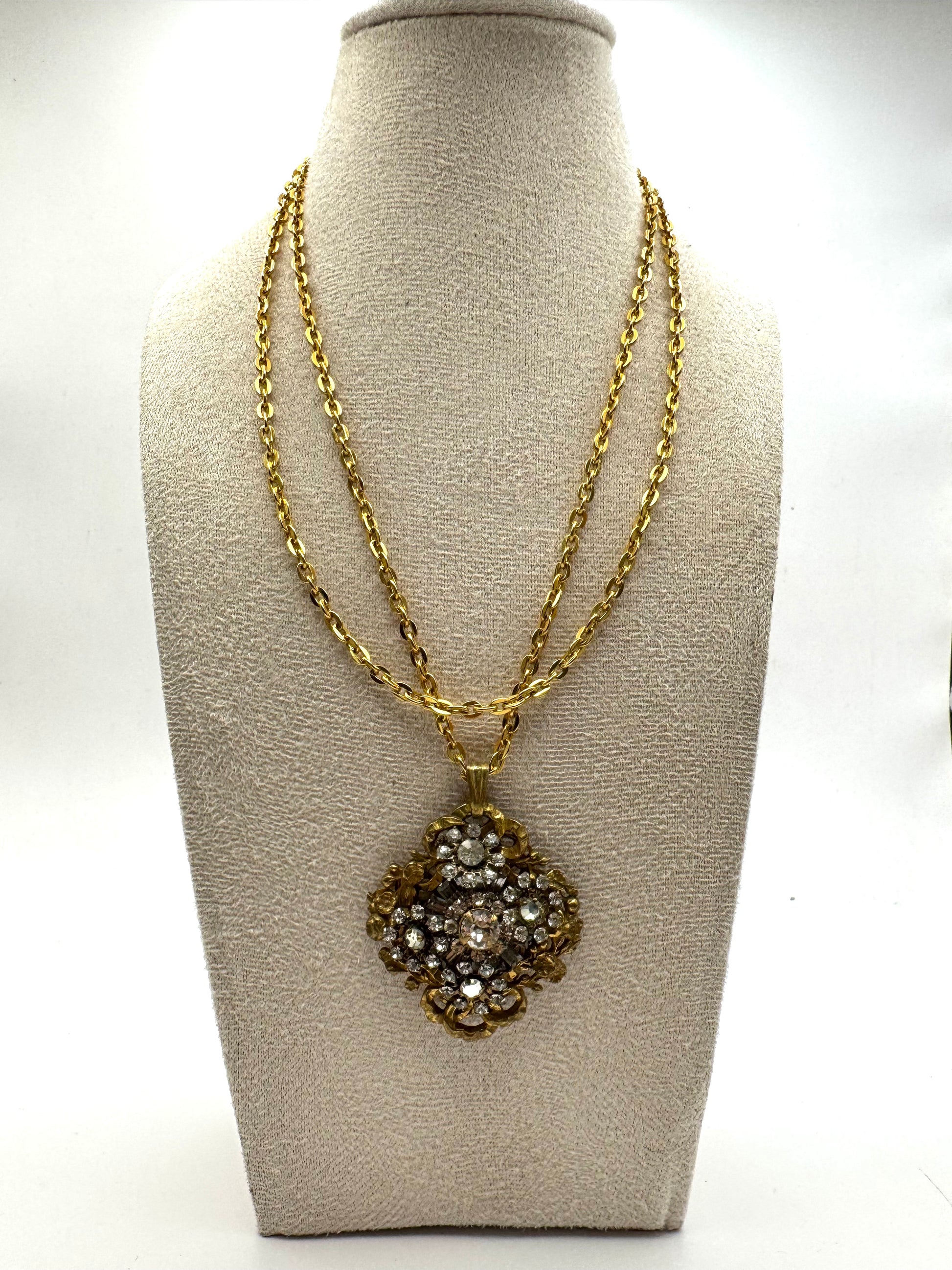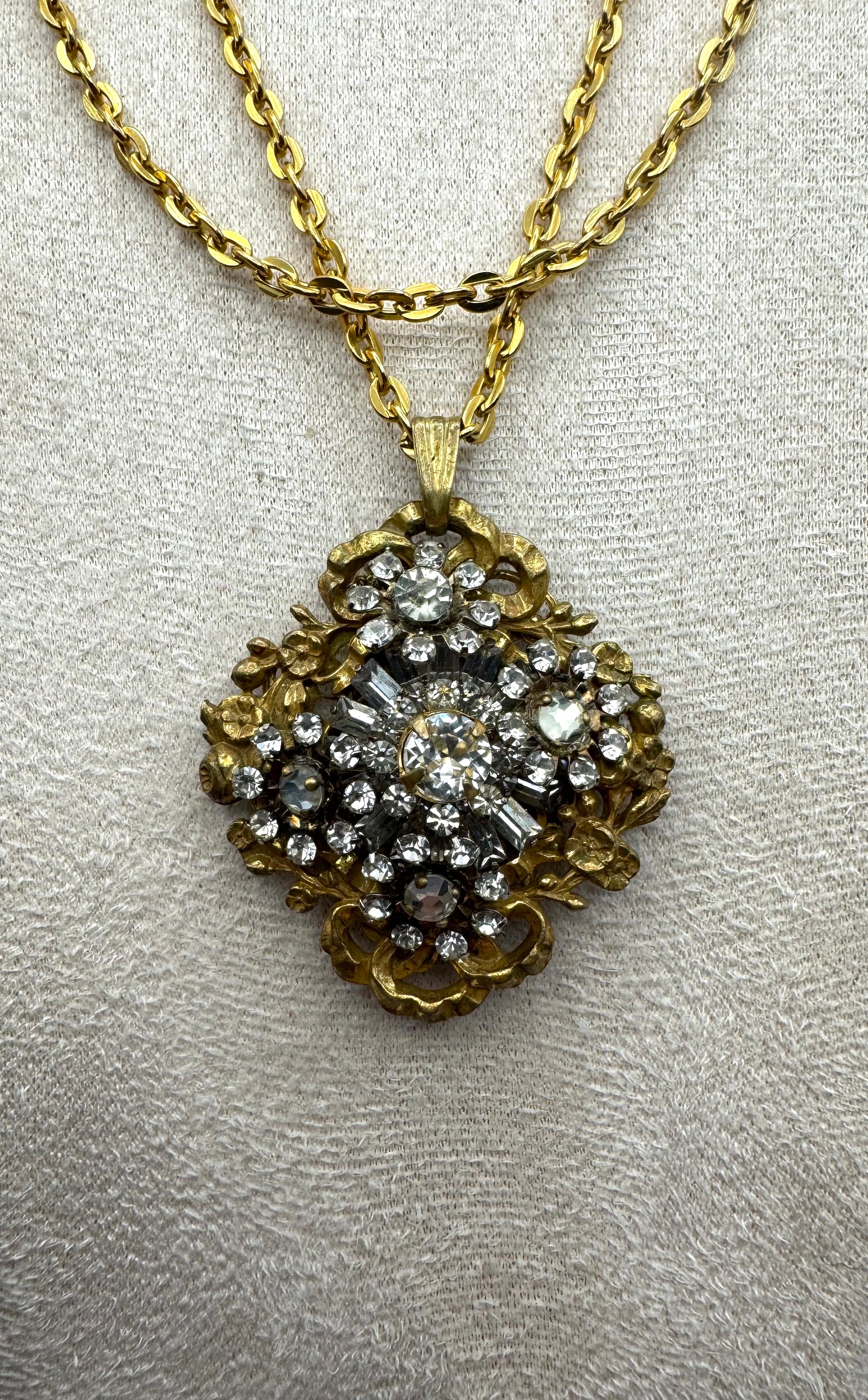 A Miriam Haskell 1950s classic gilt pendant. 2" long, 1 1/2" wide, featuring baguette and round crystal stones forming a floral shape, with prong-set stones in a stunning gilt Miriam design. The topmost stone has come loose from its prongs but remains securely in place. The four corner floral motif crystals have a movable design. The chain is not an original Miriam Haskell piece. The 15" gold-plated chain can be comfortably worn as a double strand, complementing the design beautifully. Available at a price no Miriam collector would want to miss.