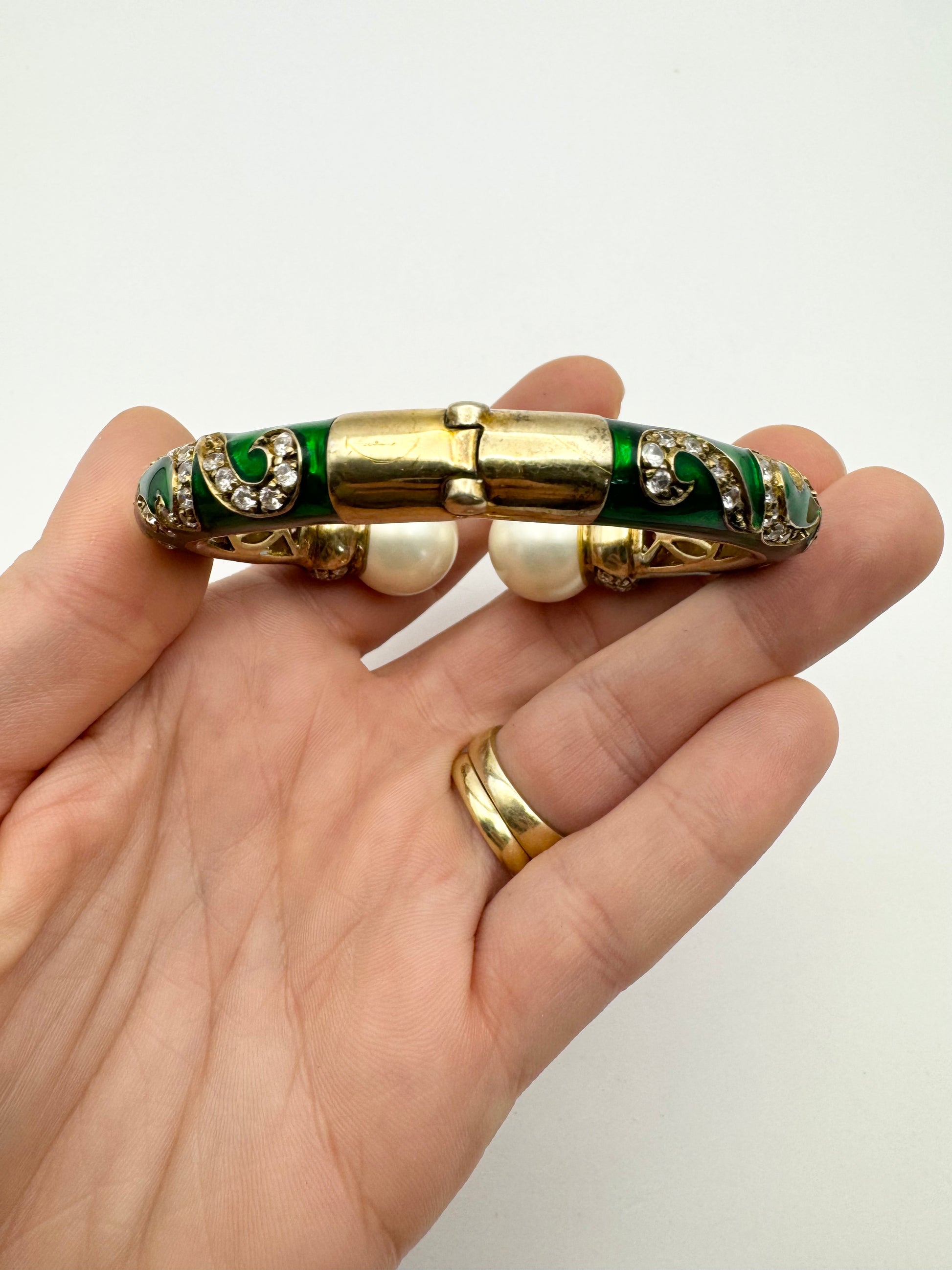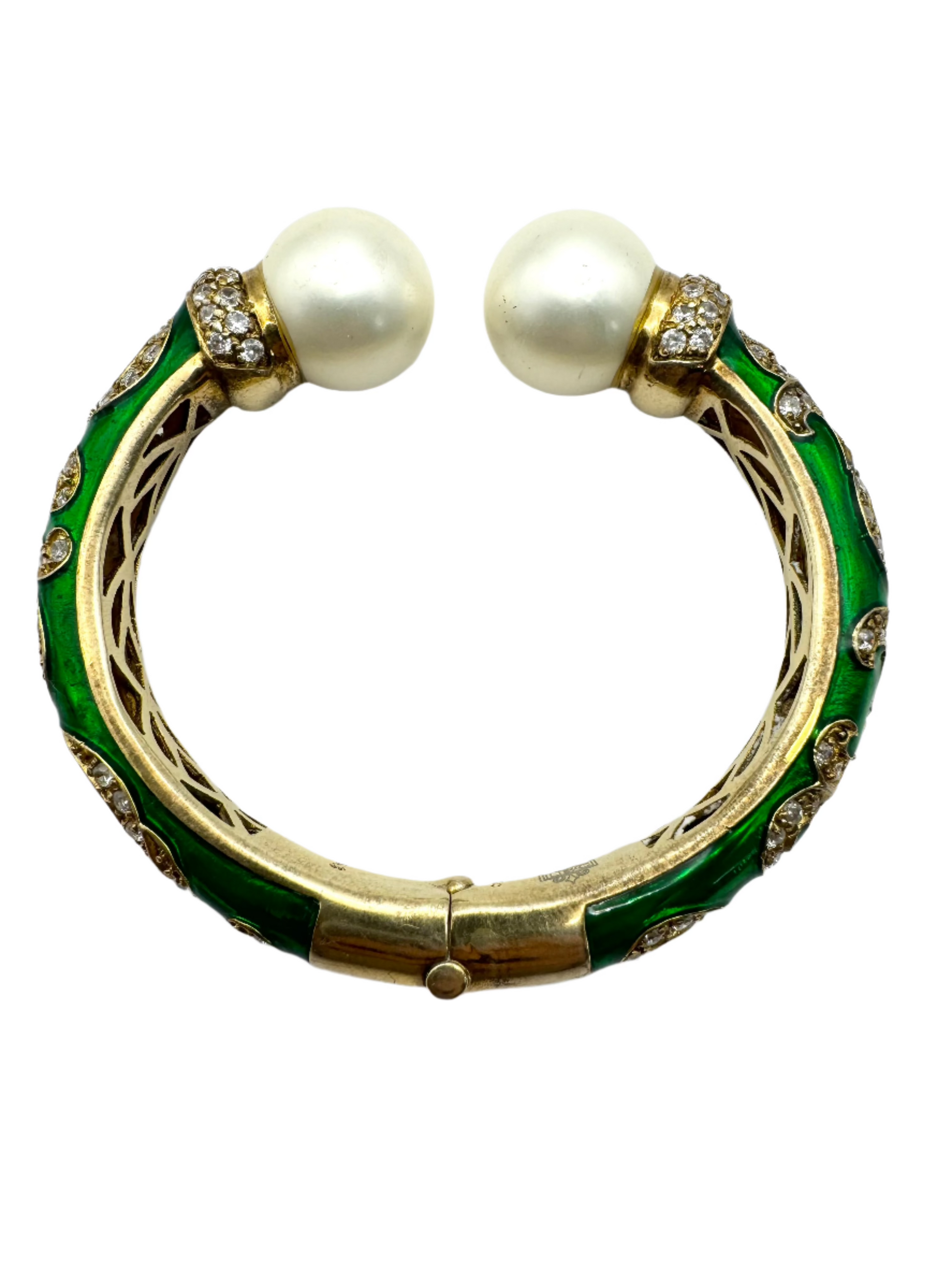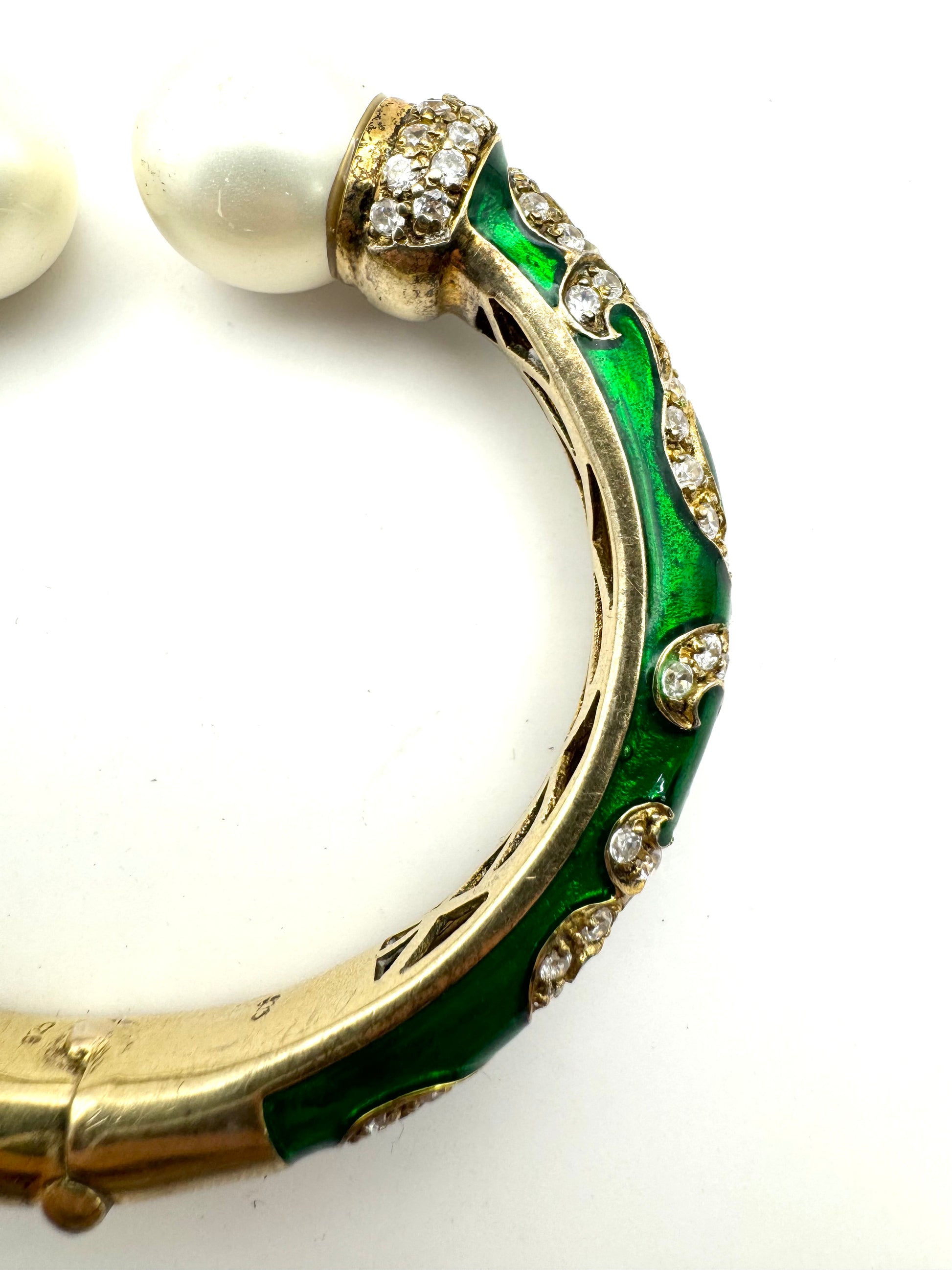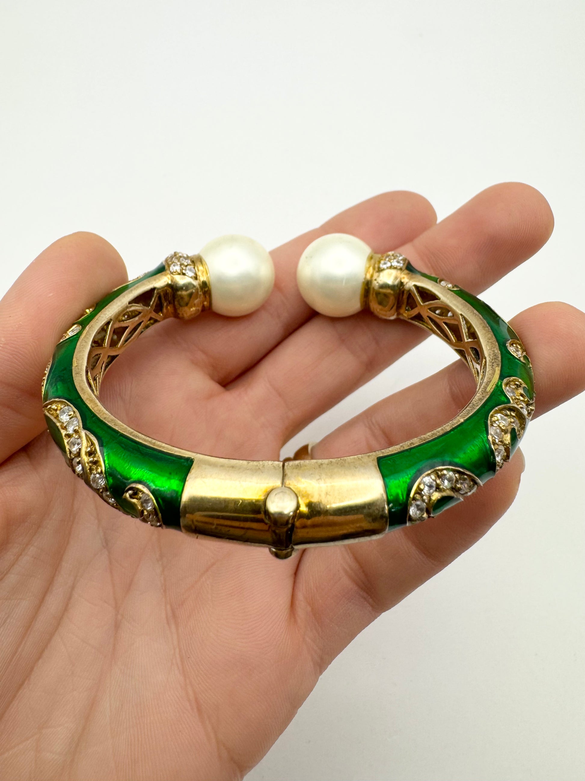 Signed LBC 925 Vermeil Faux Pearl Rhinestone Enamel Clamper Statement Bracelet