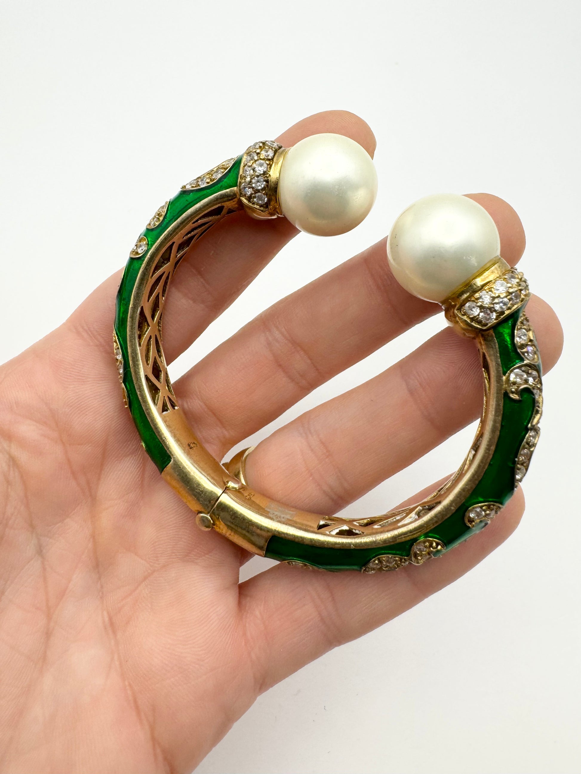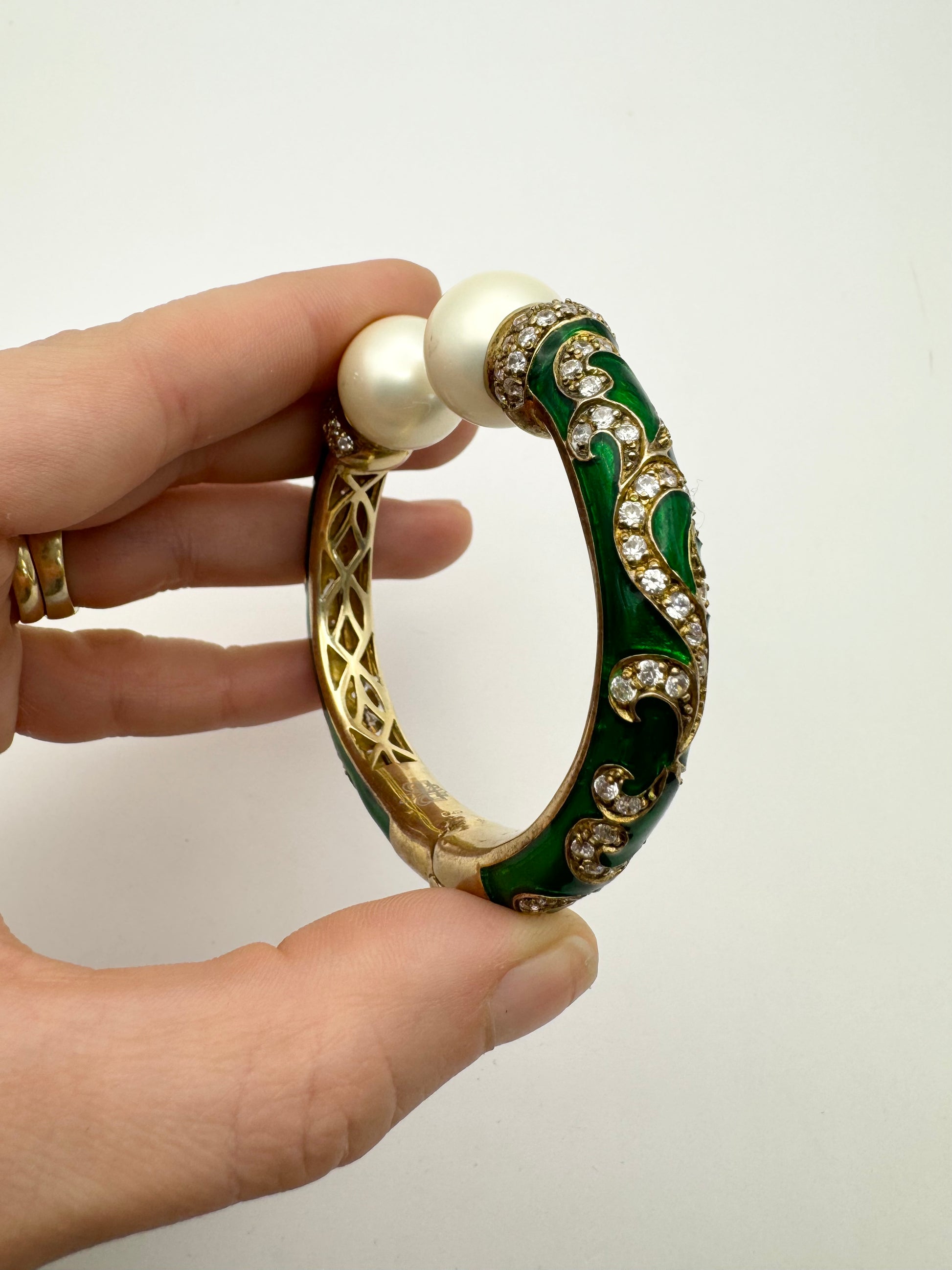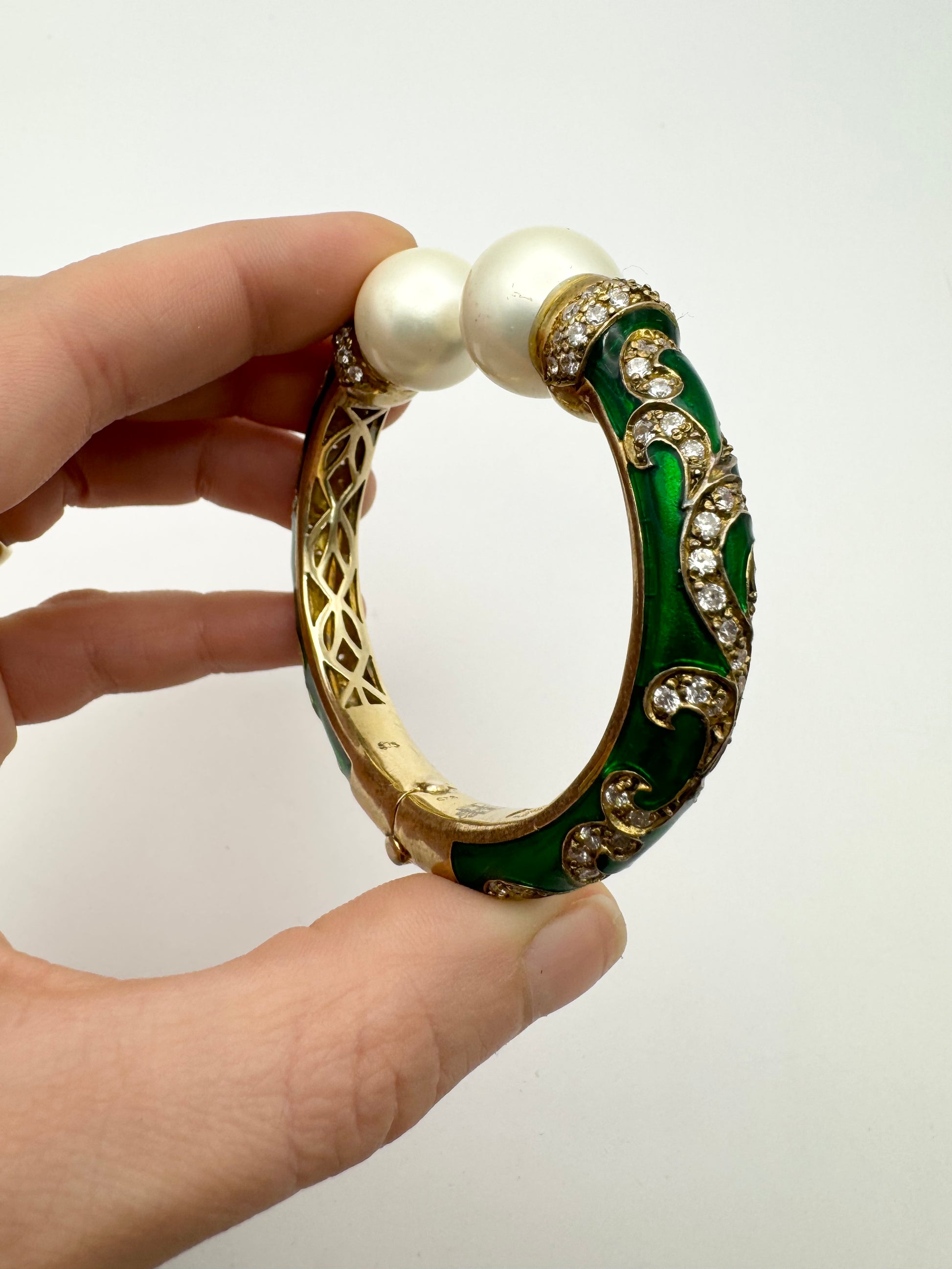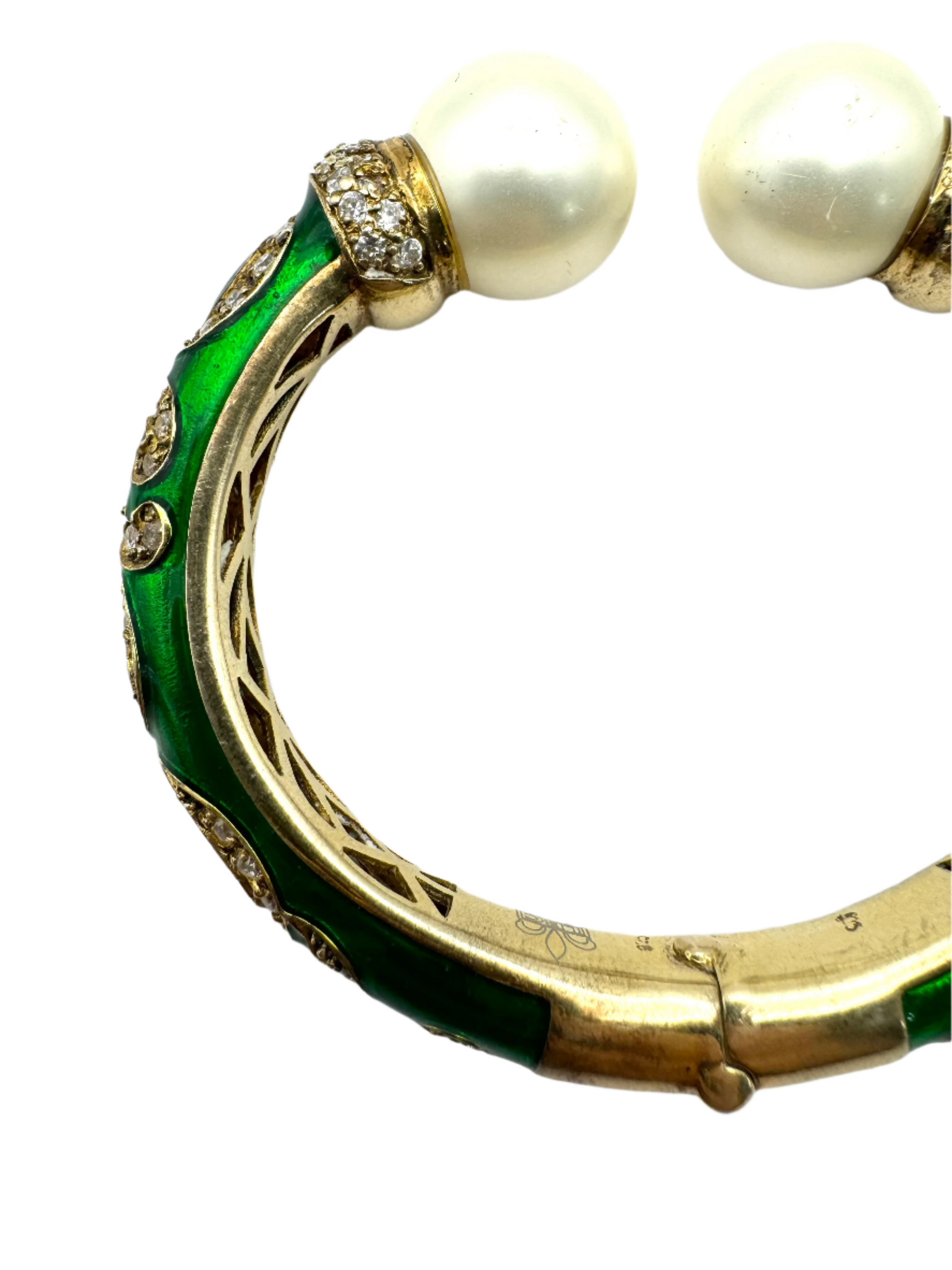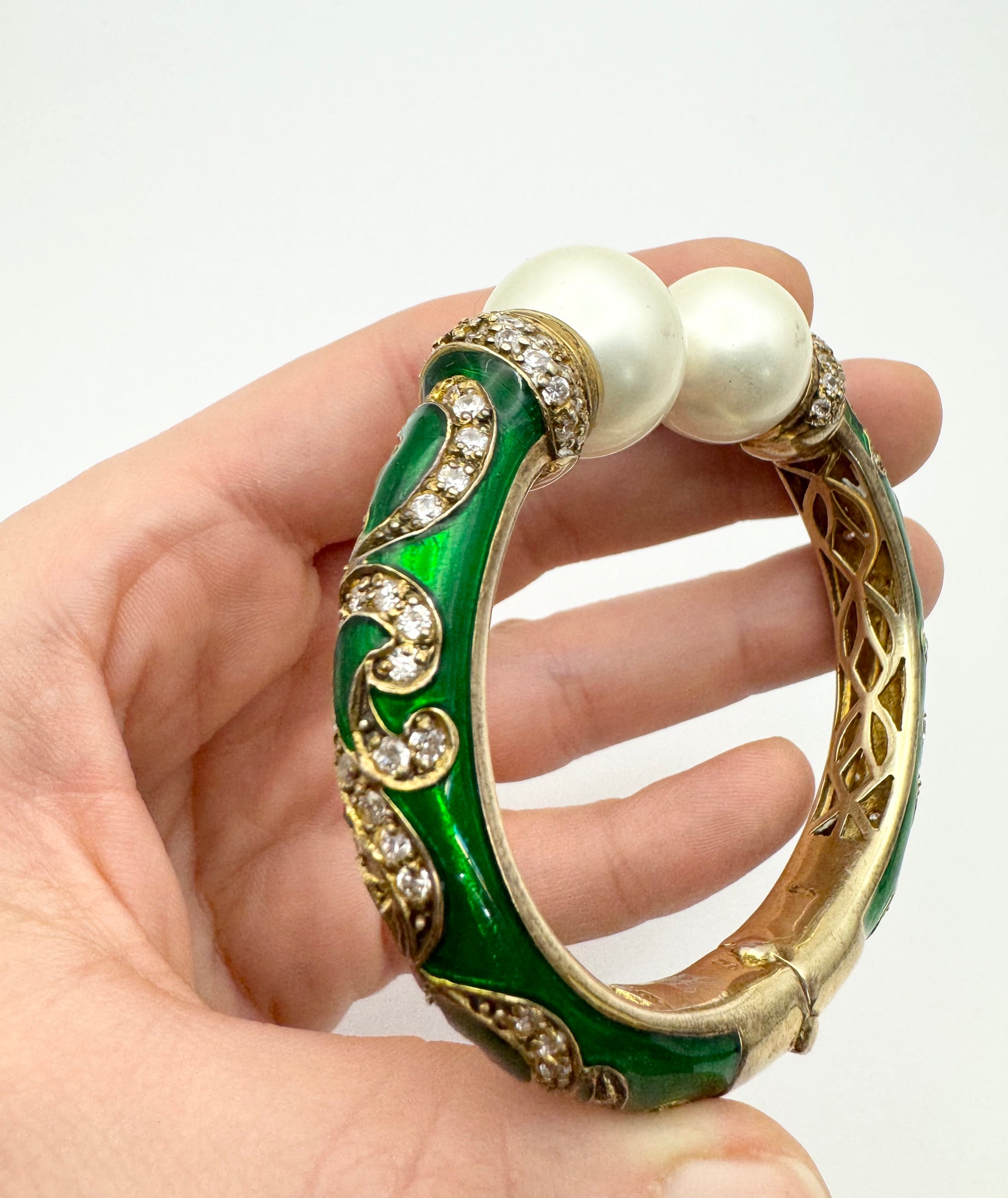 Signed LBC 925 Vermeil Faux Pearl Rhinestone Enamel Clamper Statement Bracelet