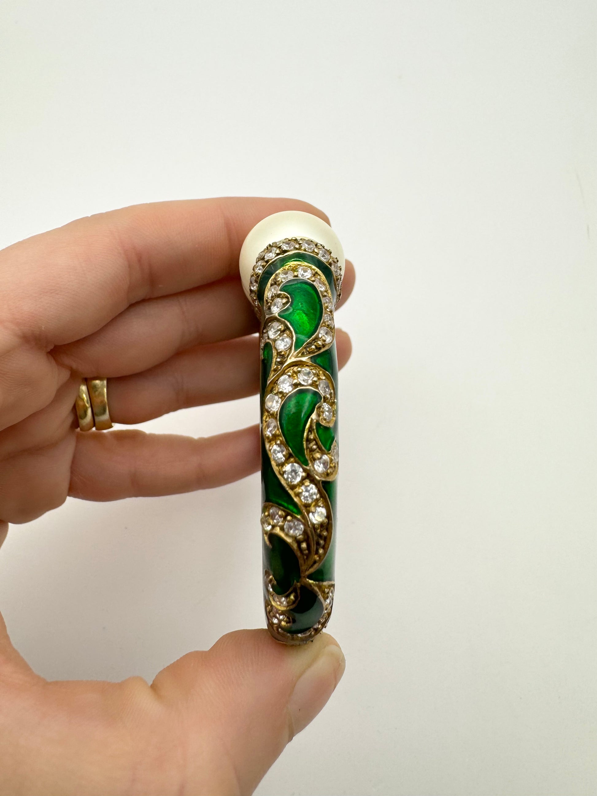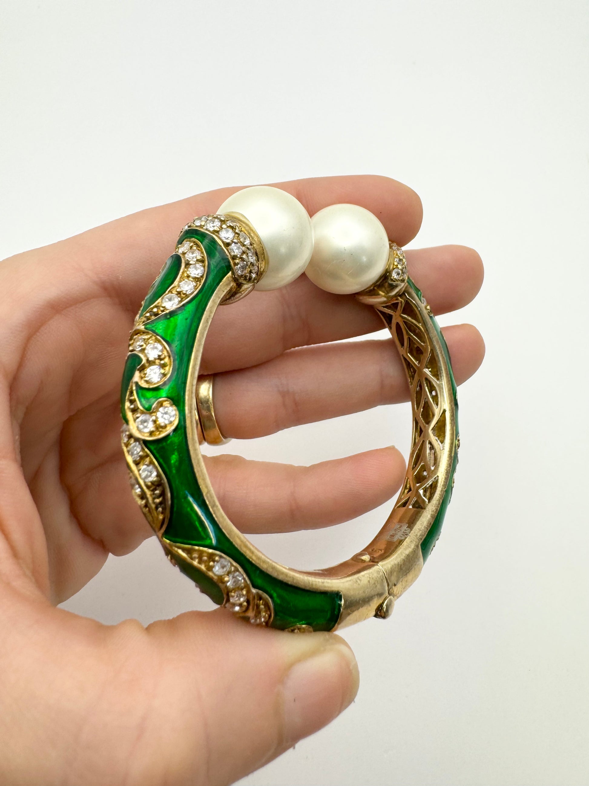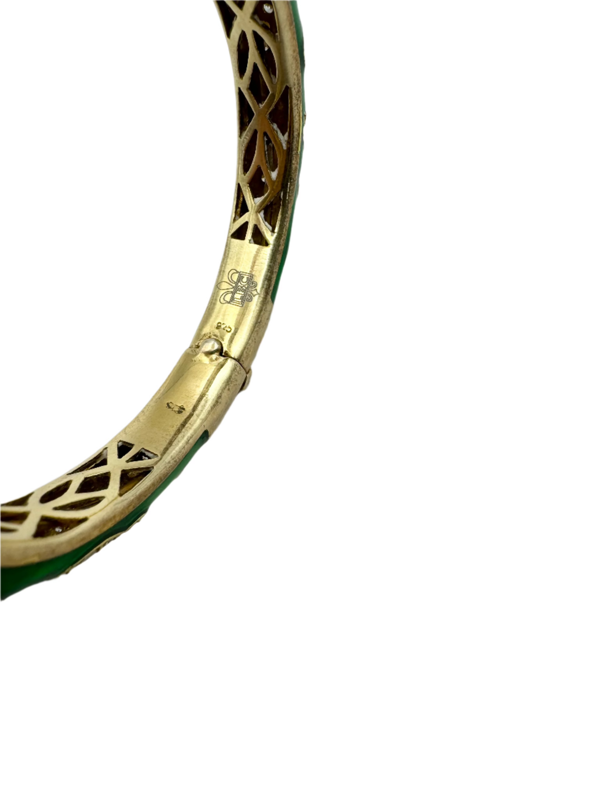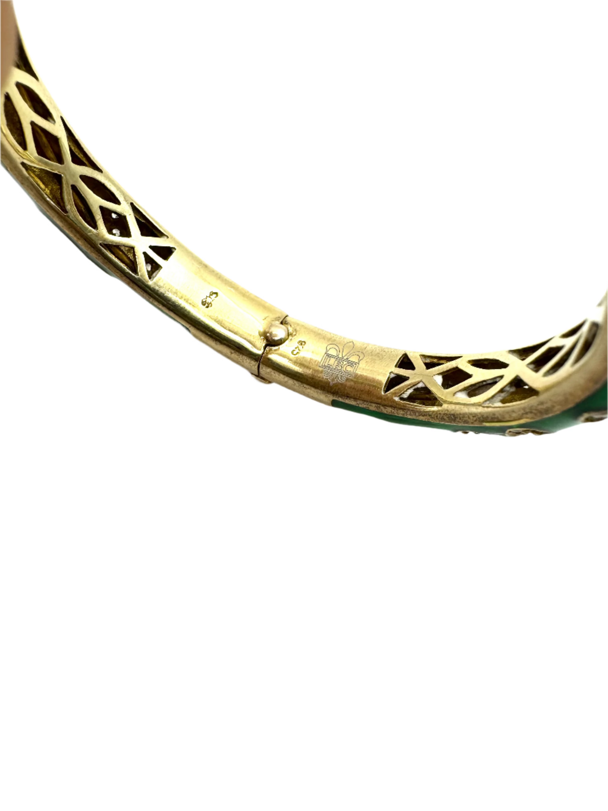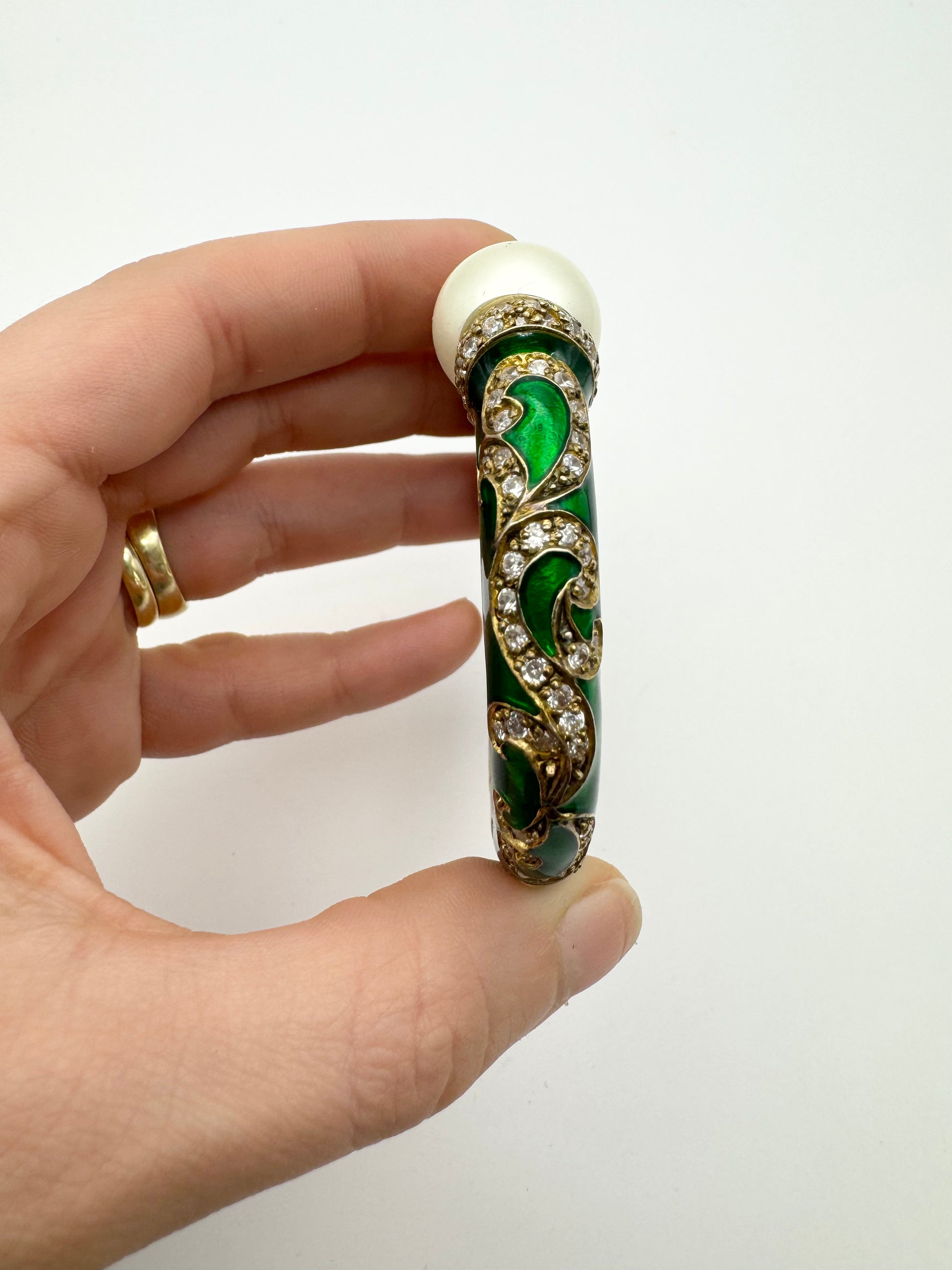 The stunning clamper bracelet you see here is stamped with 'LBC' and '925' on the fleur-de-lis vermeil design. The floral pattern is adorned with rhinestones on emerald green enamel, which is in flawless condition with no chips. All stones are intact, and I tried to capture small scratches on the faux pearls in the photos. I don’t believe these minor imperfections detract from the bracelet's beauty. Please take a close look at the photos. The inside of the bracelet is designed to allow the skin to breathe comfortably. The hinge opens and closes as smoothly as it did on day one. This is truly a breathtaking statement piece. Below, you’ll find the specifications for this piece.