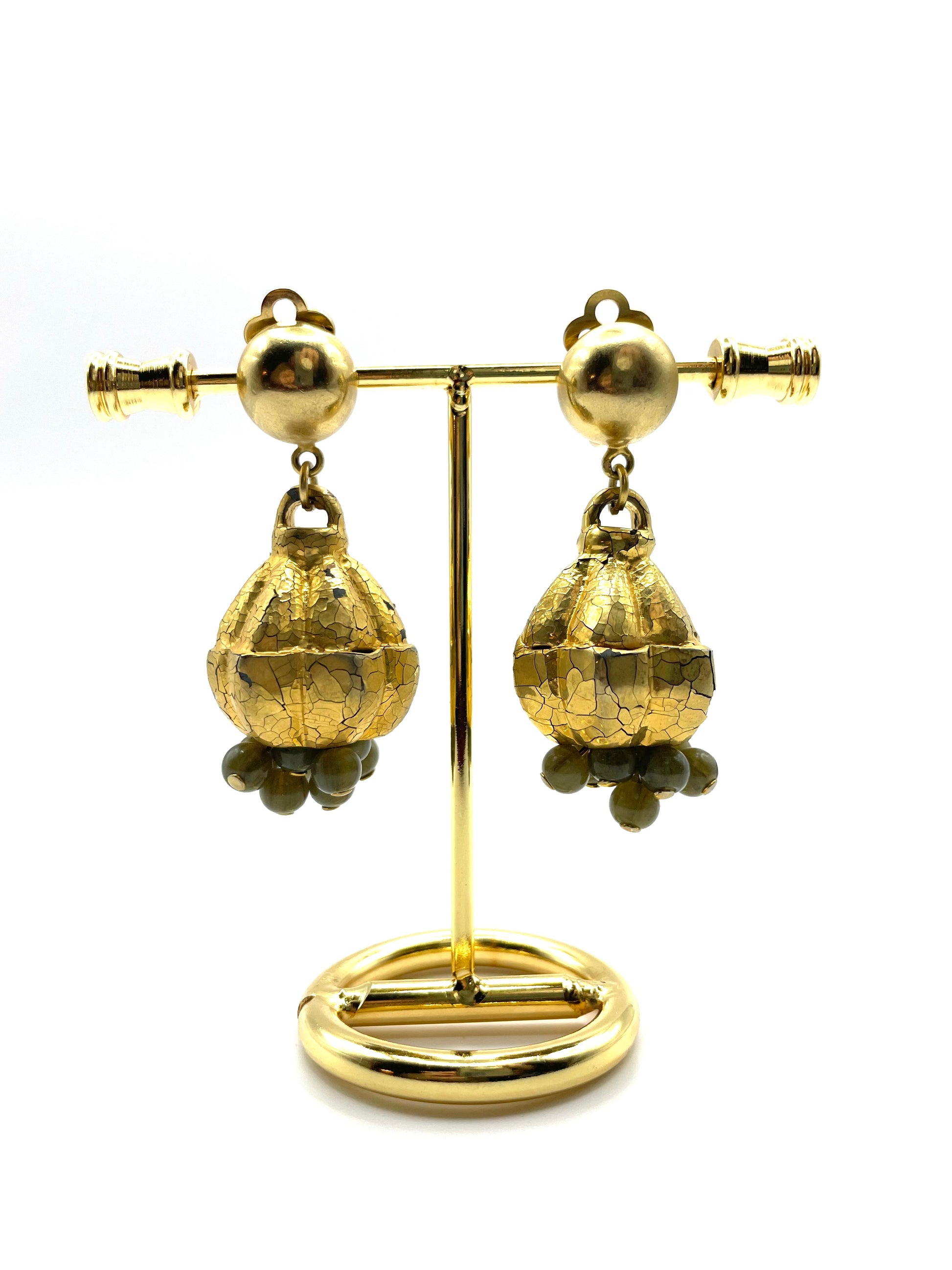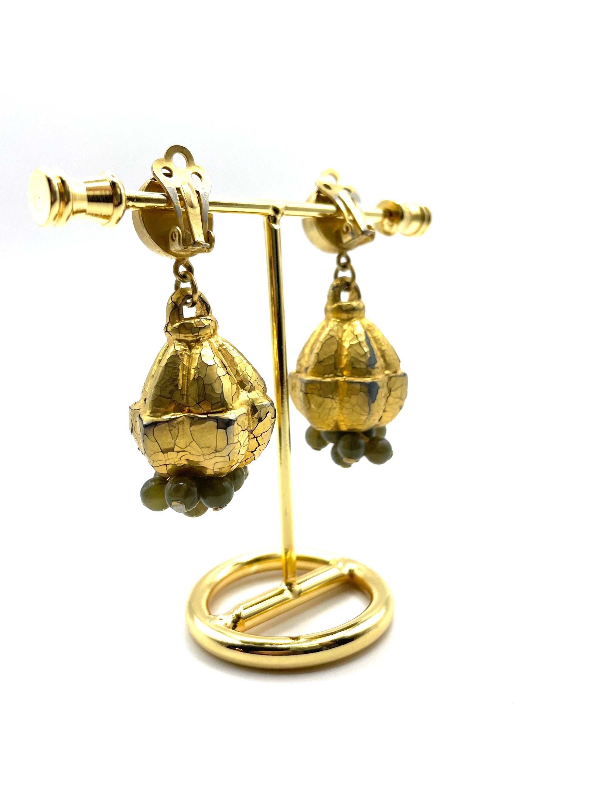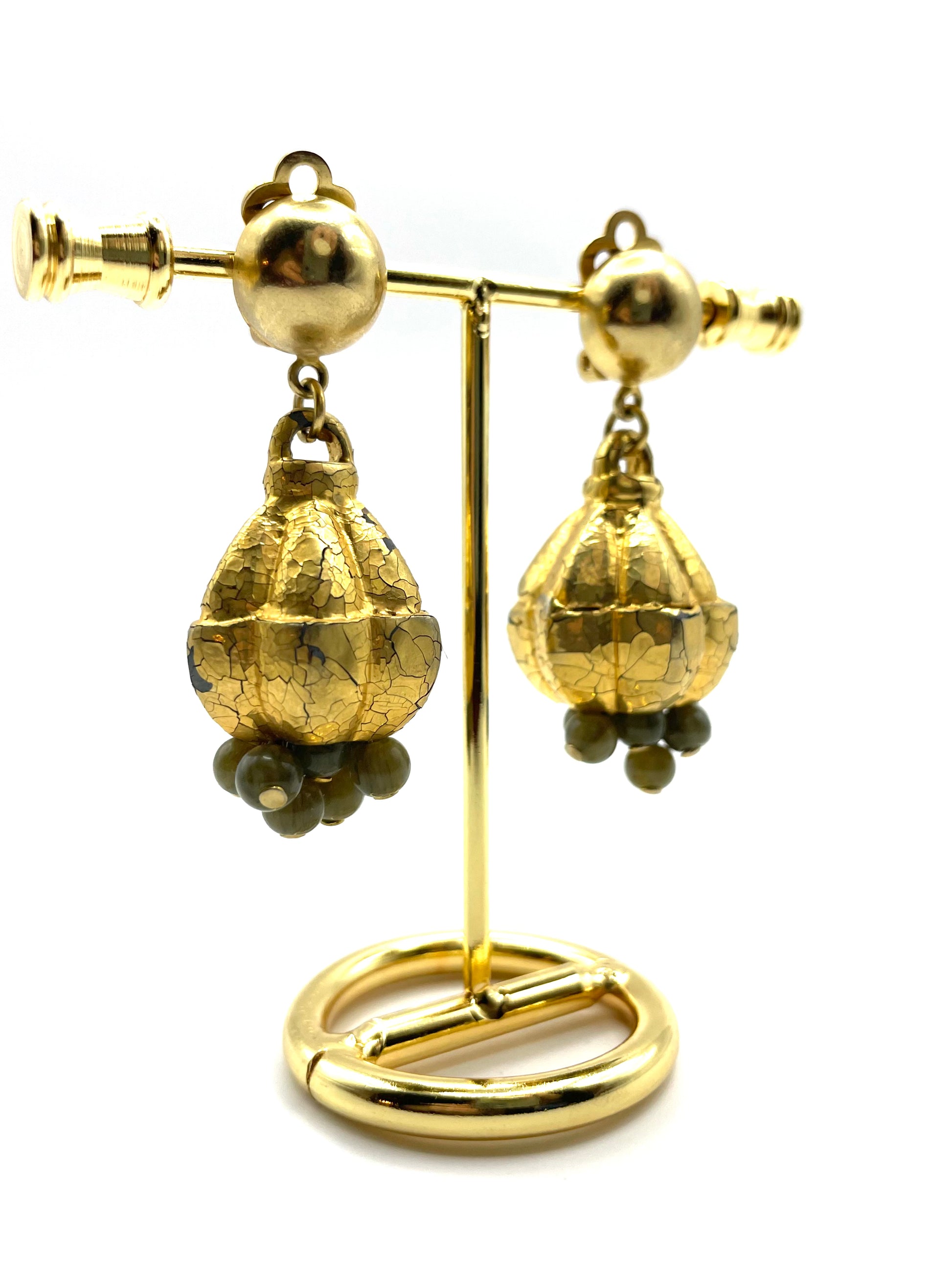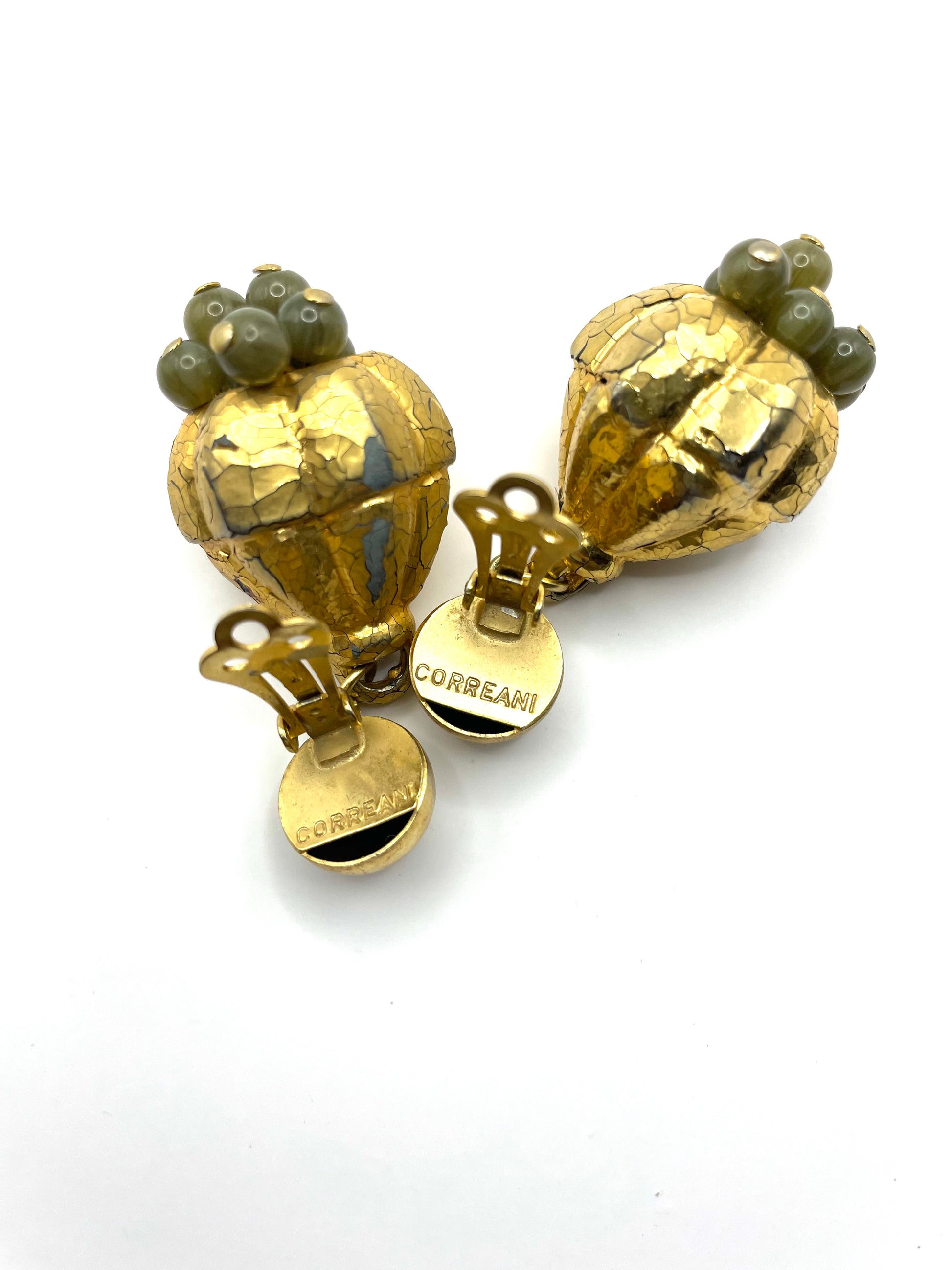 Vintage Ugo Correani Goldtone Clip on Dangle Earrings Green Cluster of Beads on Bottom