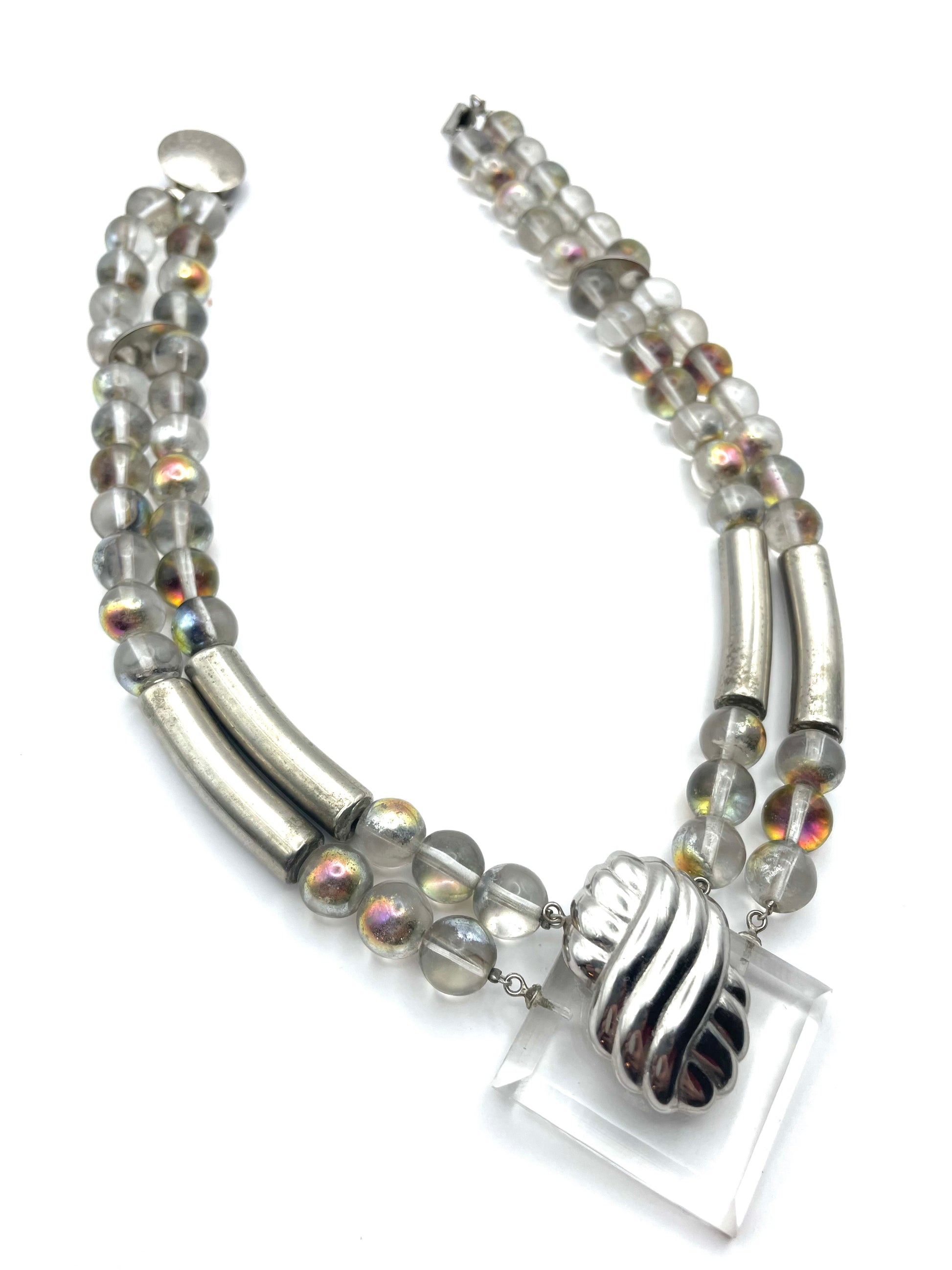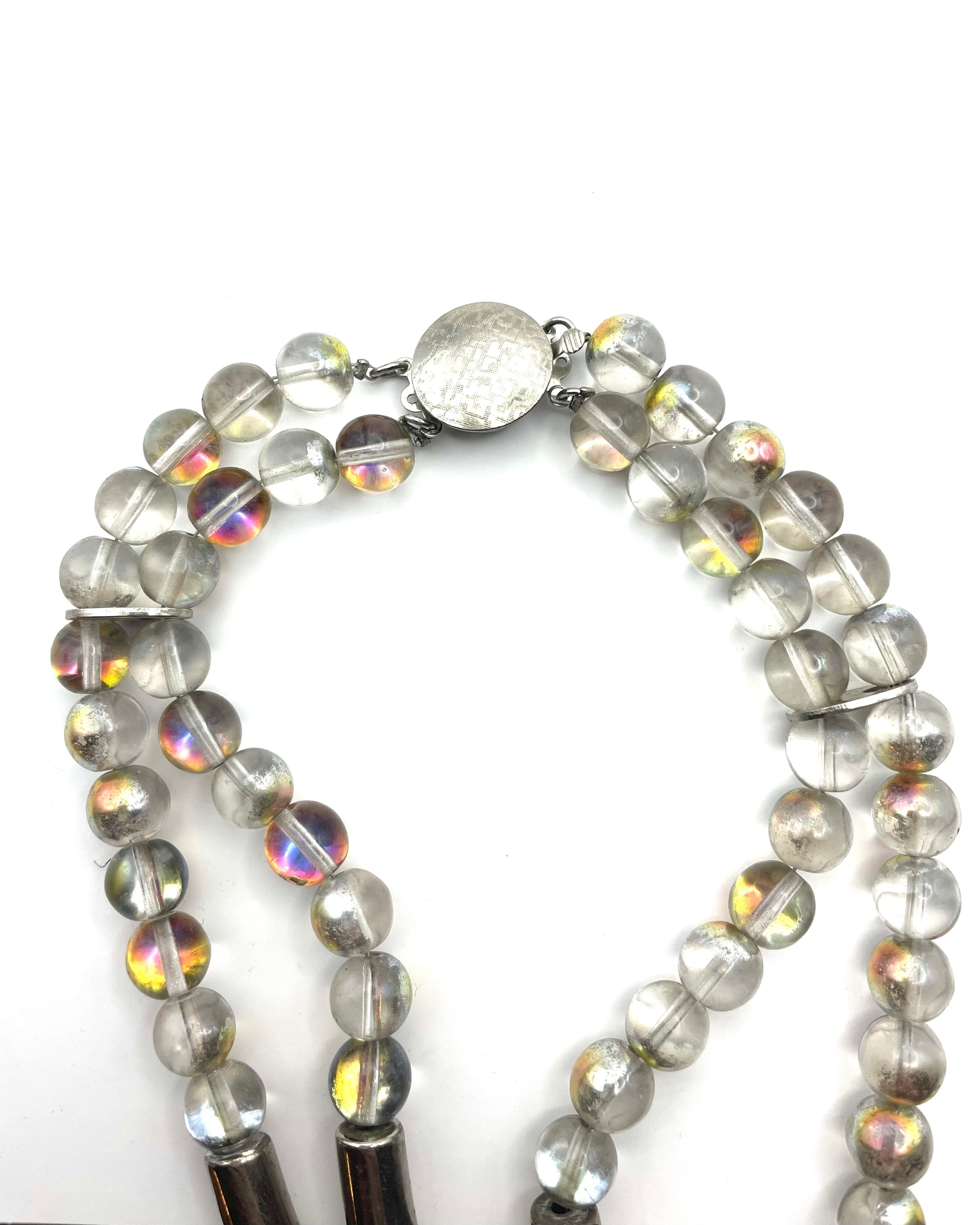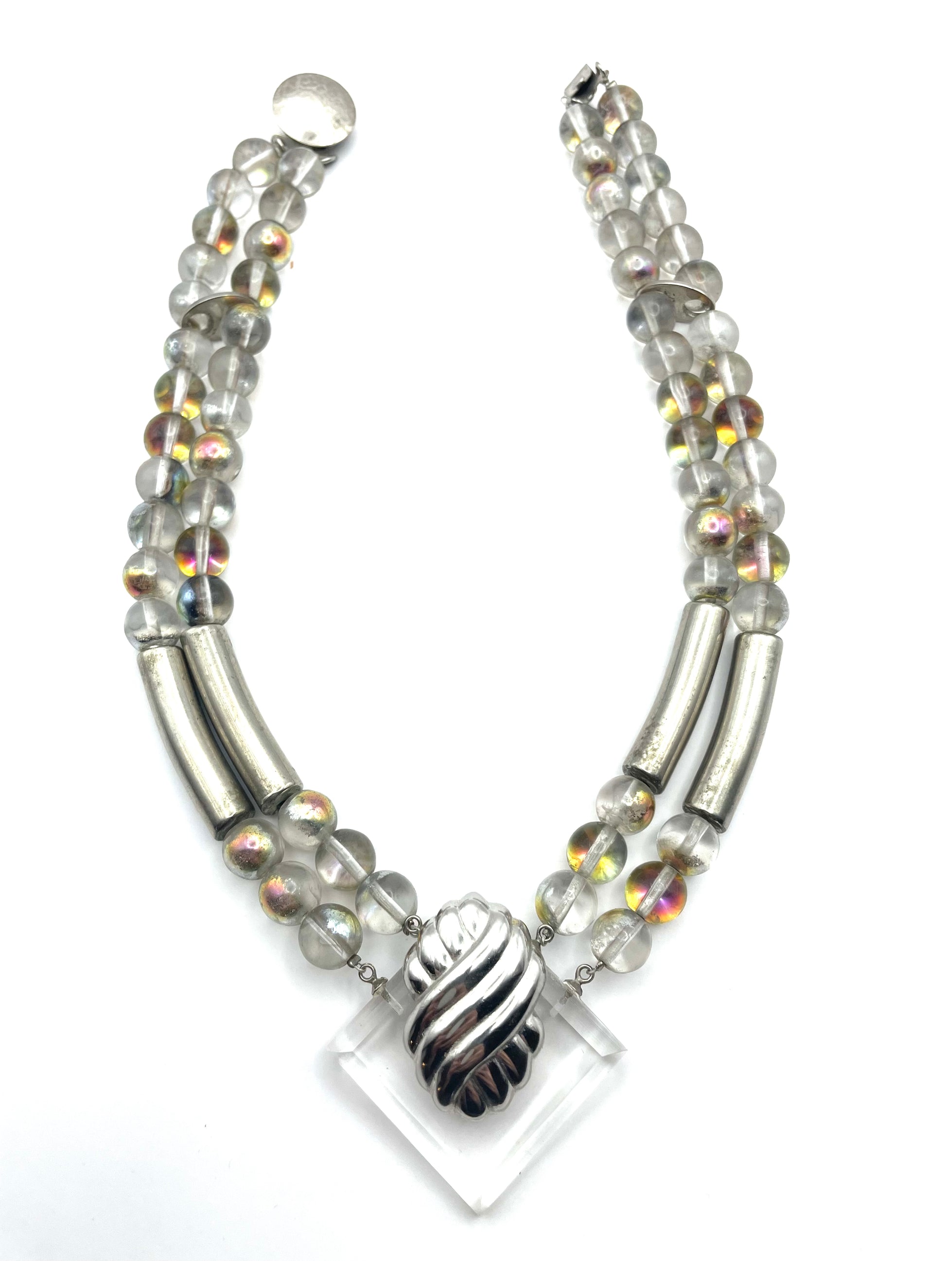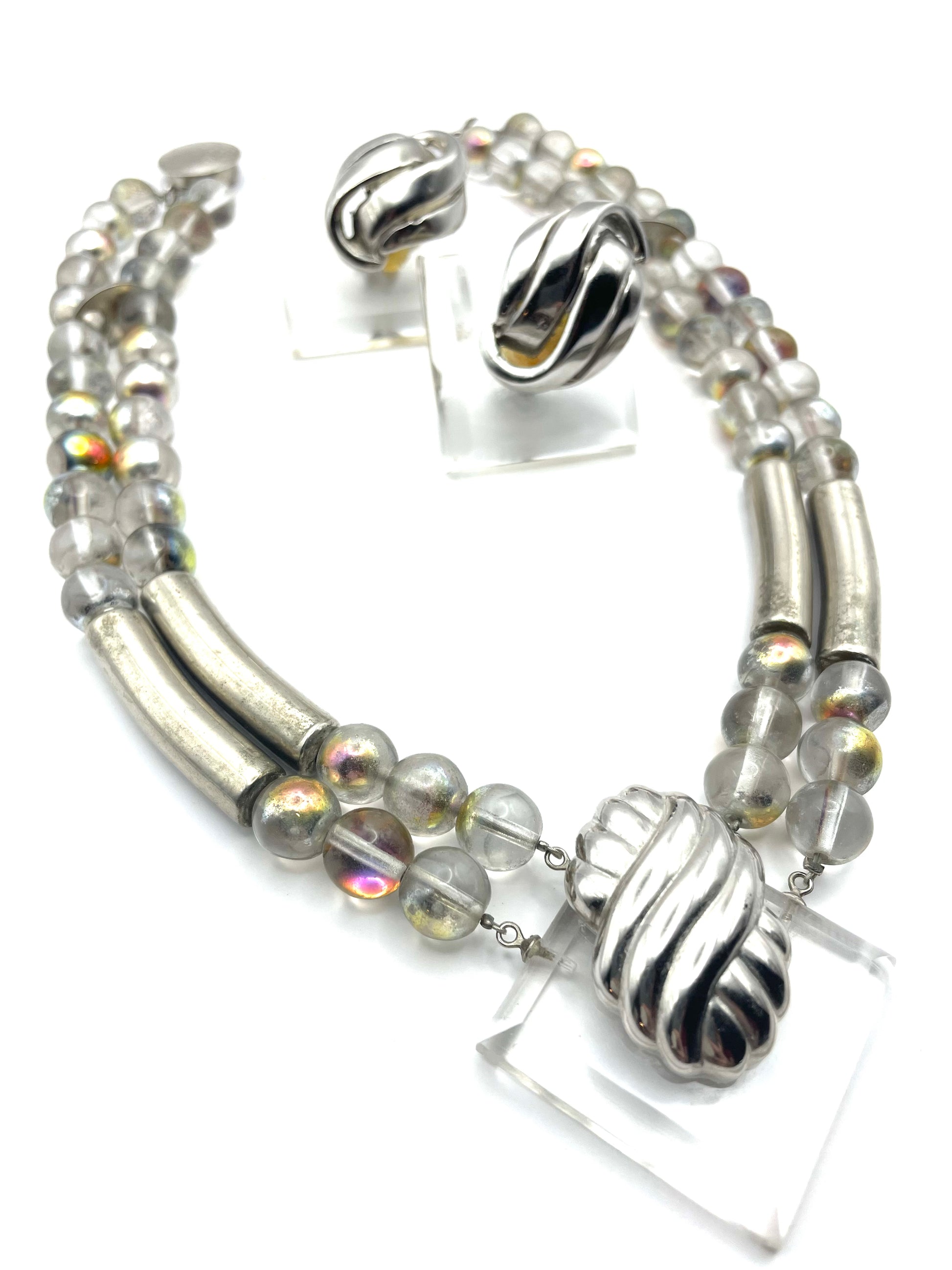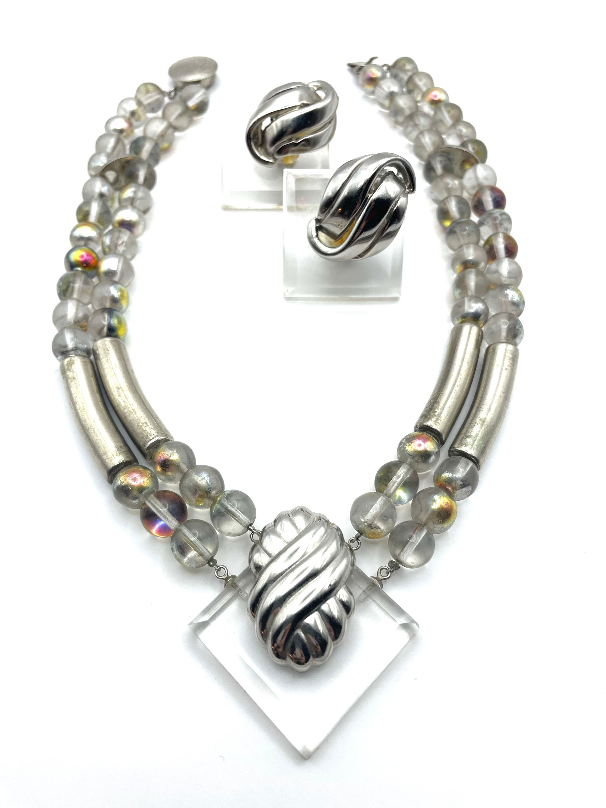 One of a kind, modernist set that you don't see it every day. Clear beads coated with iridescent color, separated with silver tone details. Lucide square piece is placed in the middle of the necklace with matching clip-on earrings. Apparently, one of the earrings has been restored before. But overall it has lost nothing of its dazzling allure.