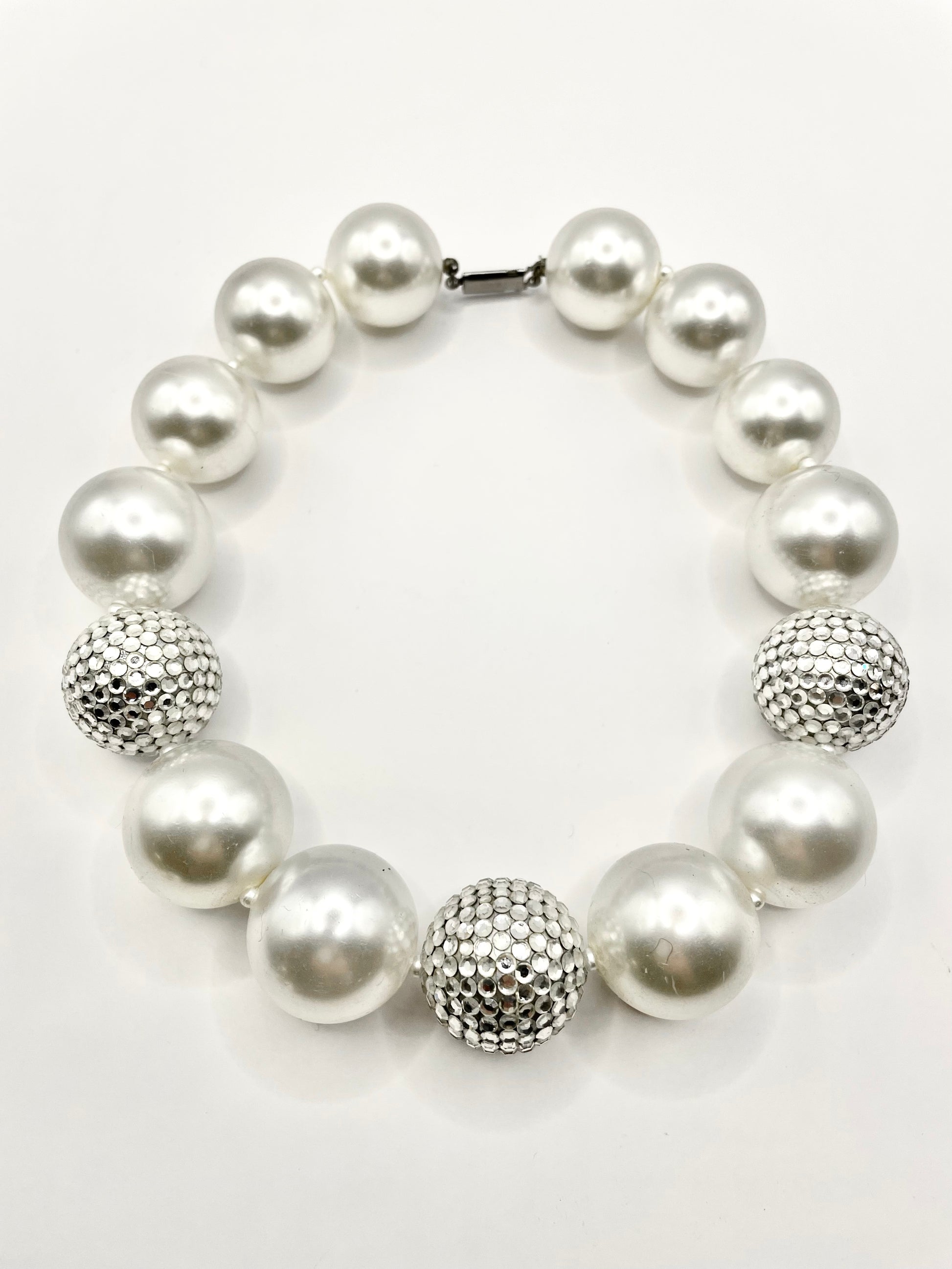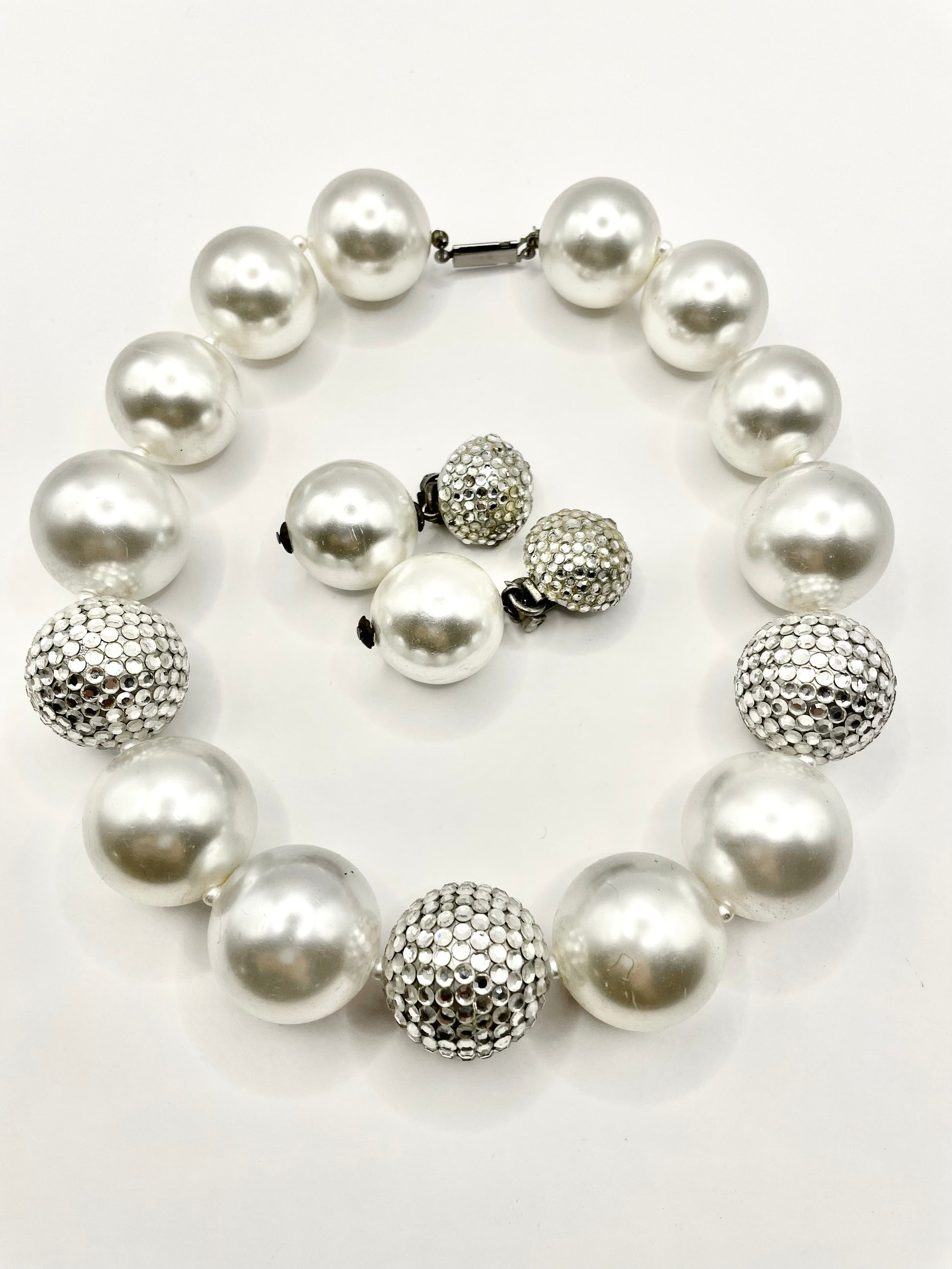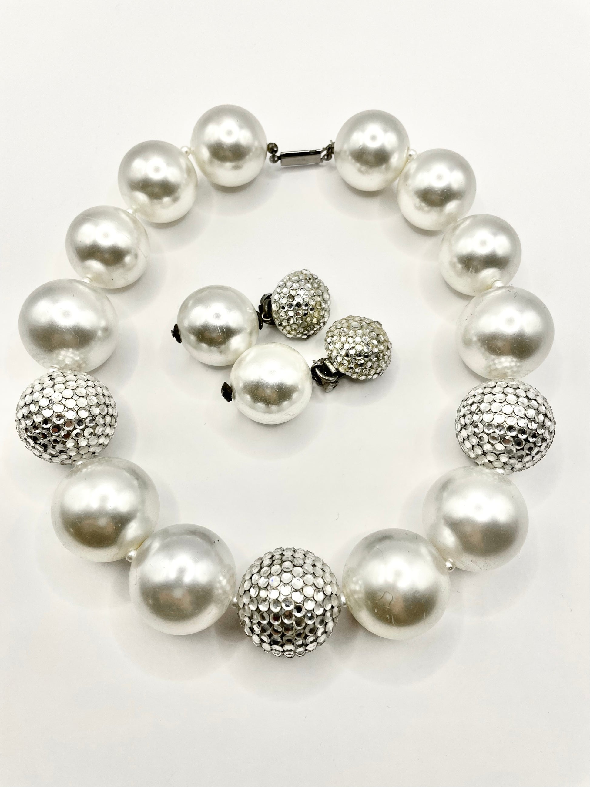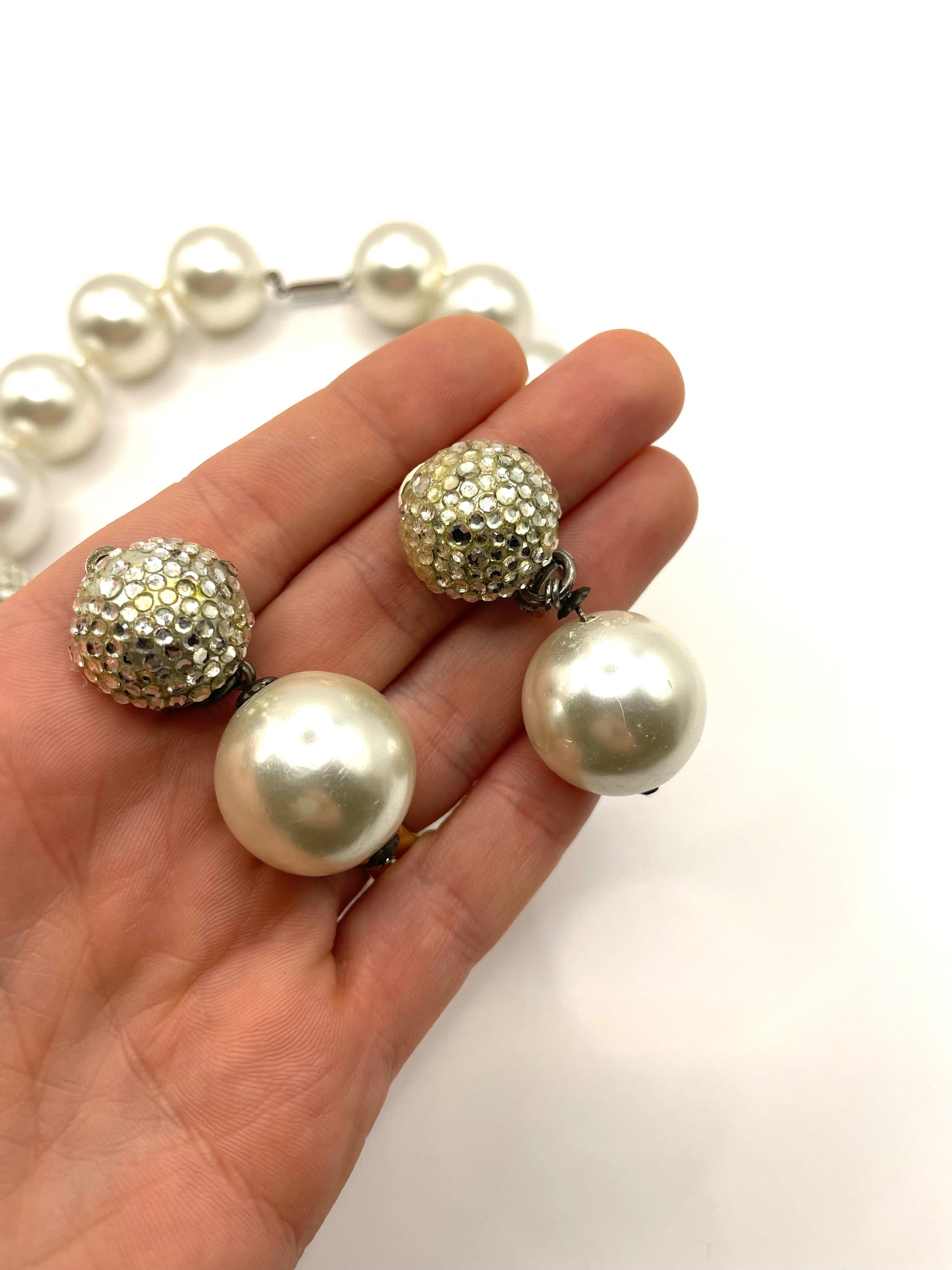 Vintage 1980s Chunky Choker Faux Pearl & Clipon Dangle Earring Set Christal Domes