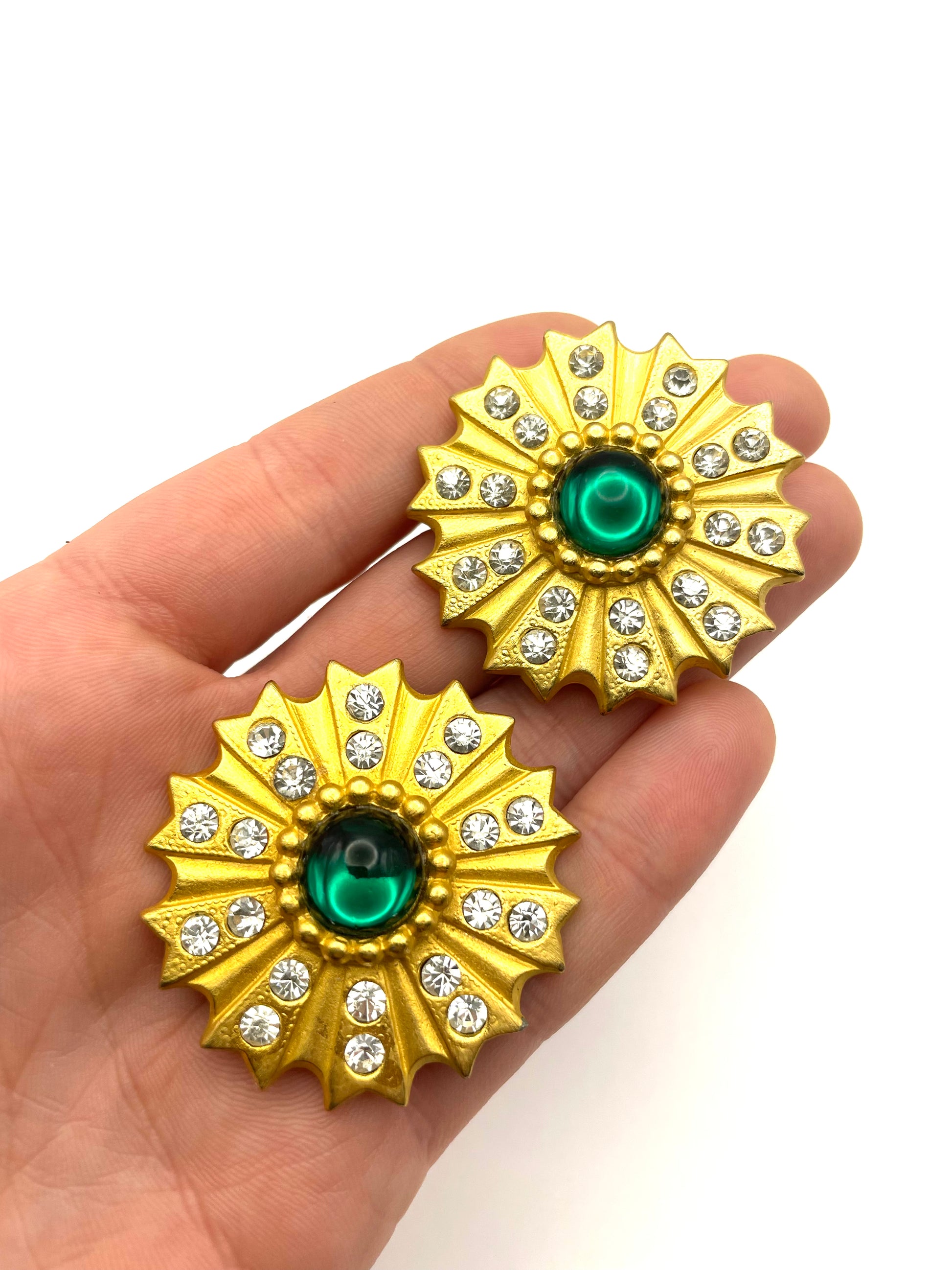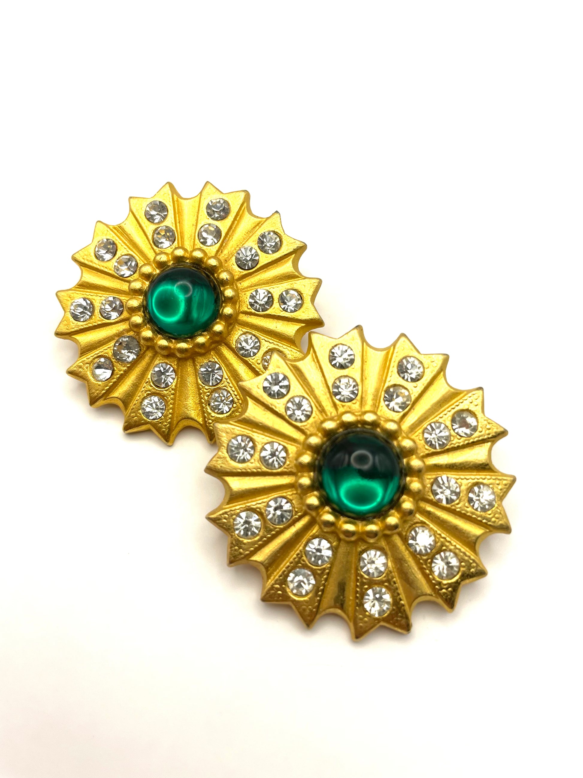 Vintage David Dubin NR Gold Tone Green Lucite Cabachon Rhinestones Clip On Earrings