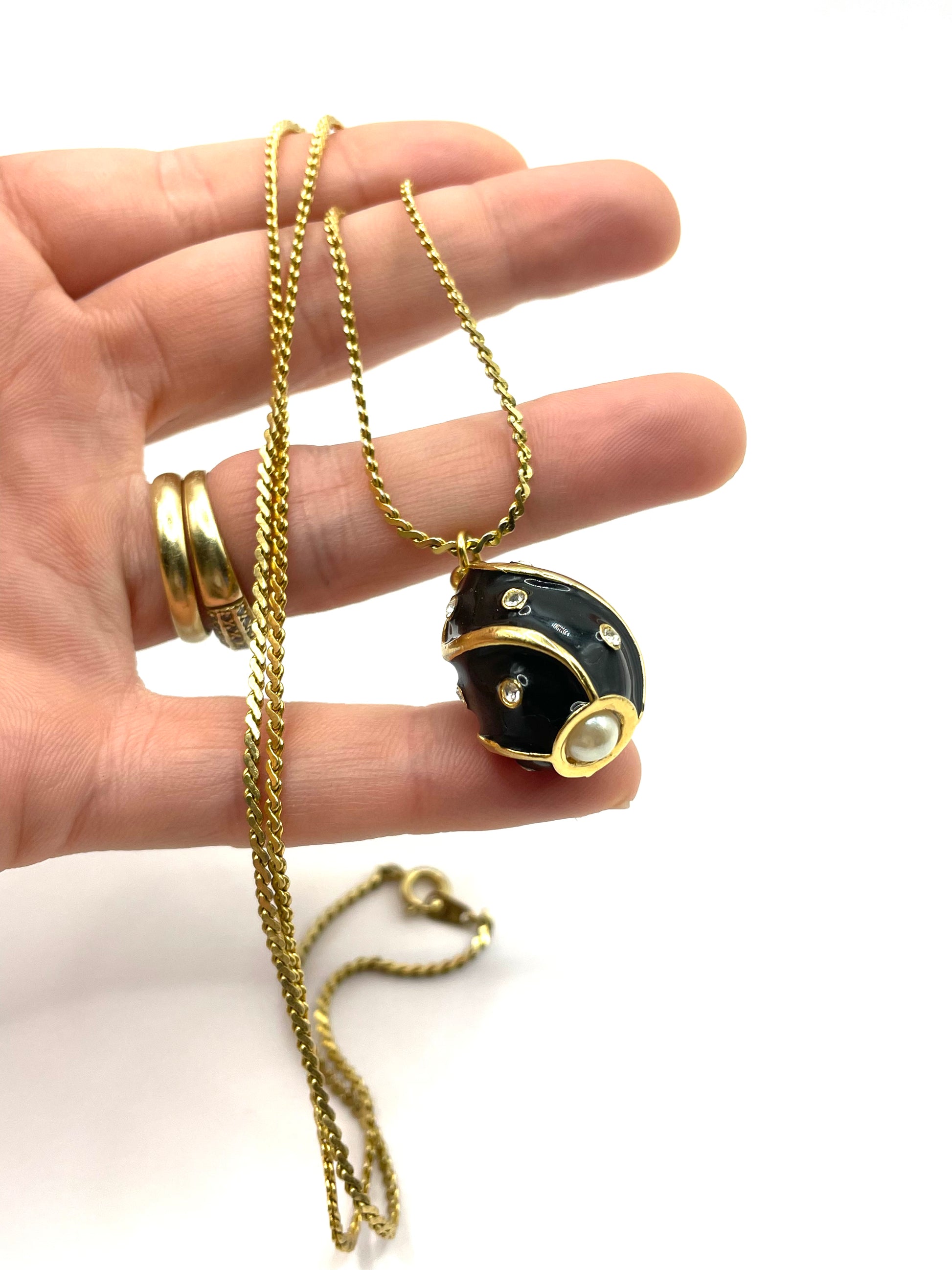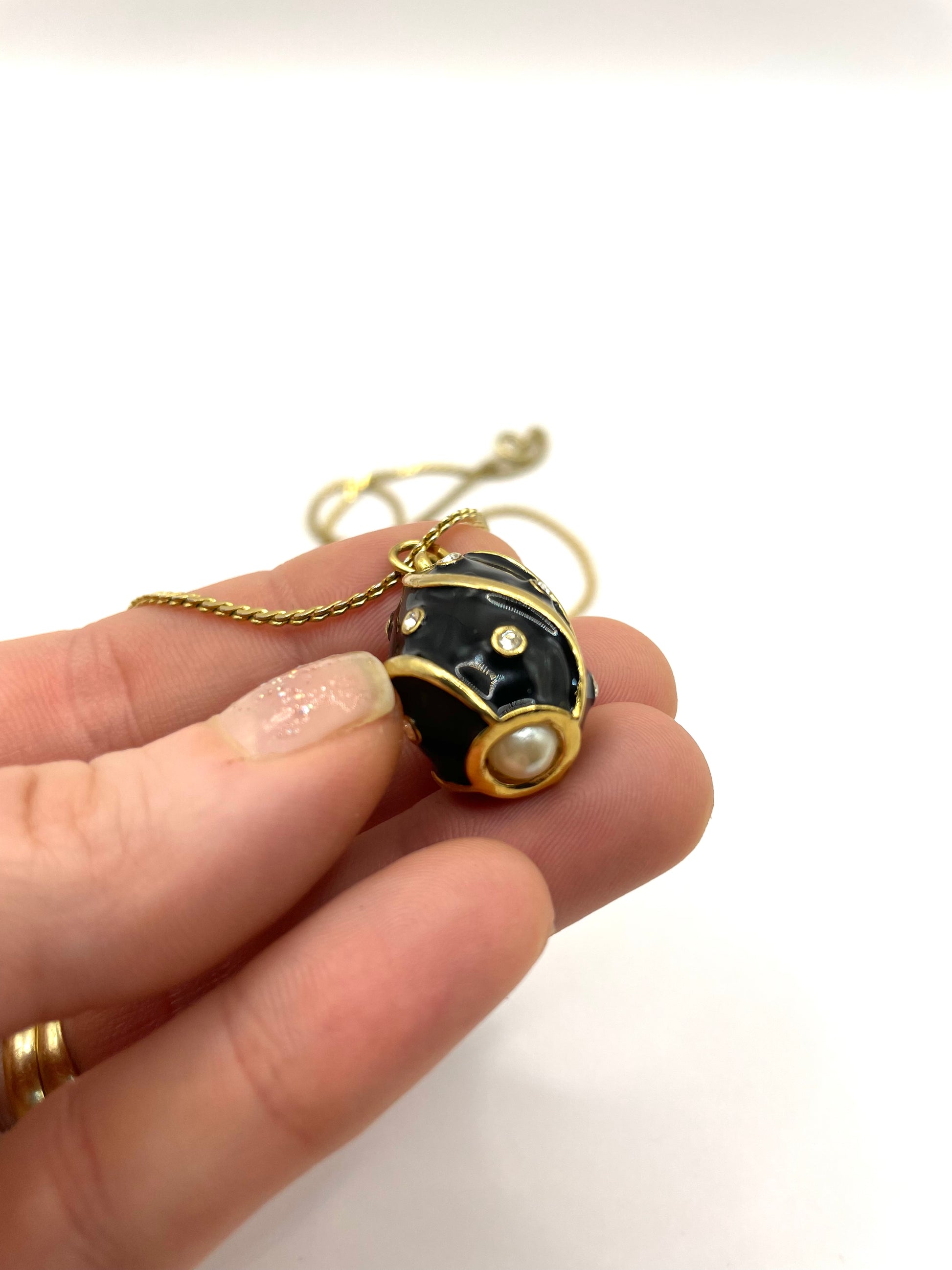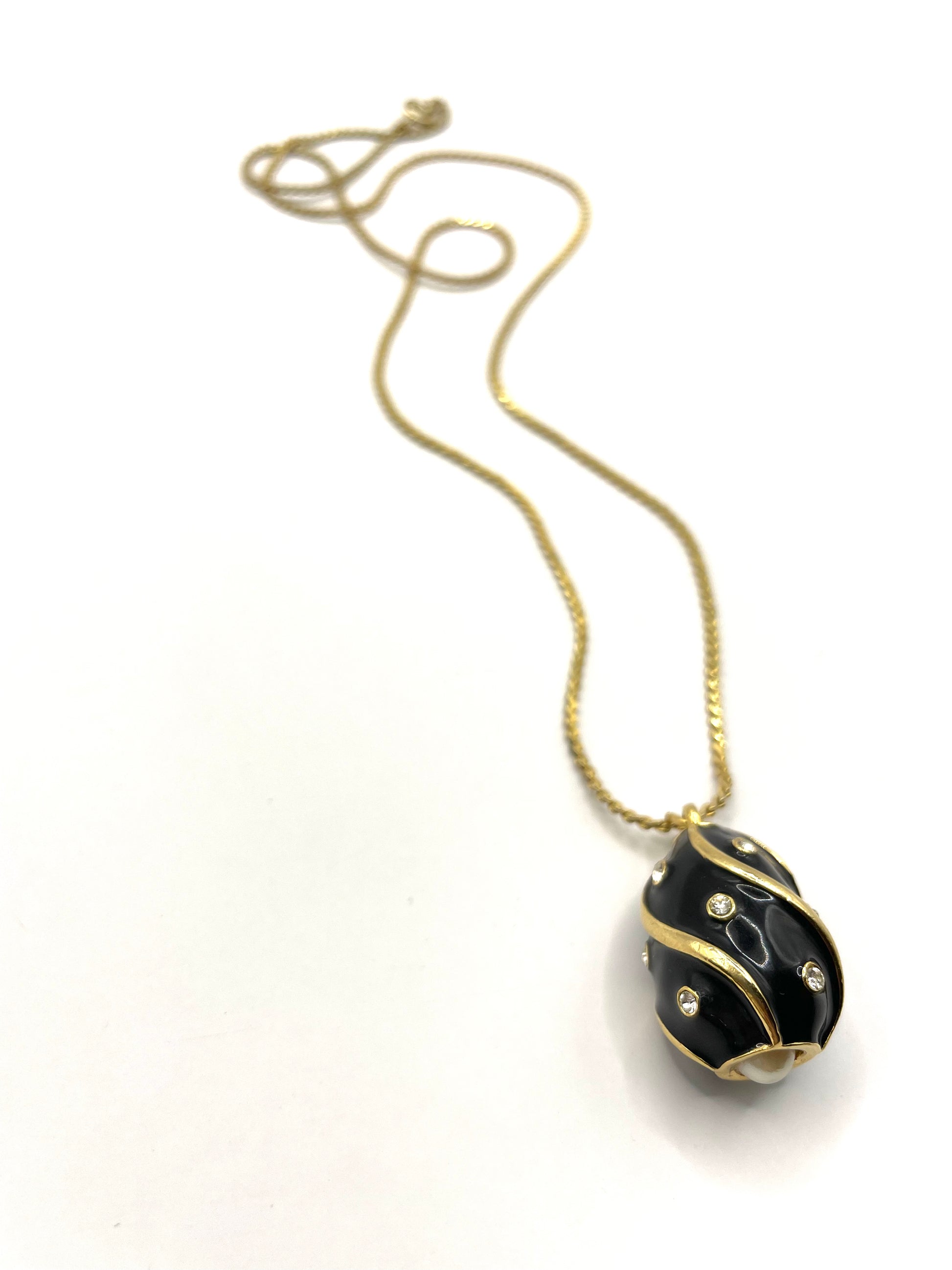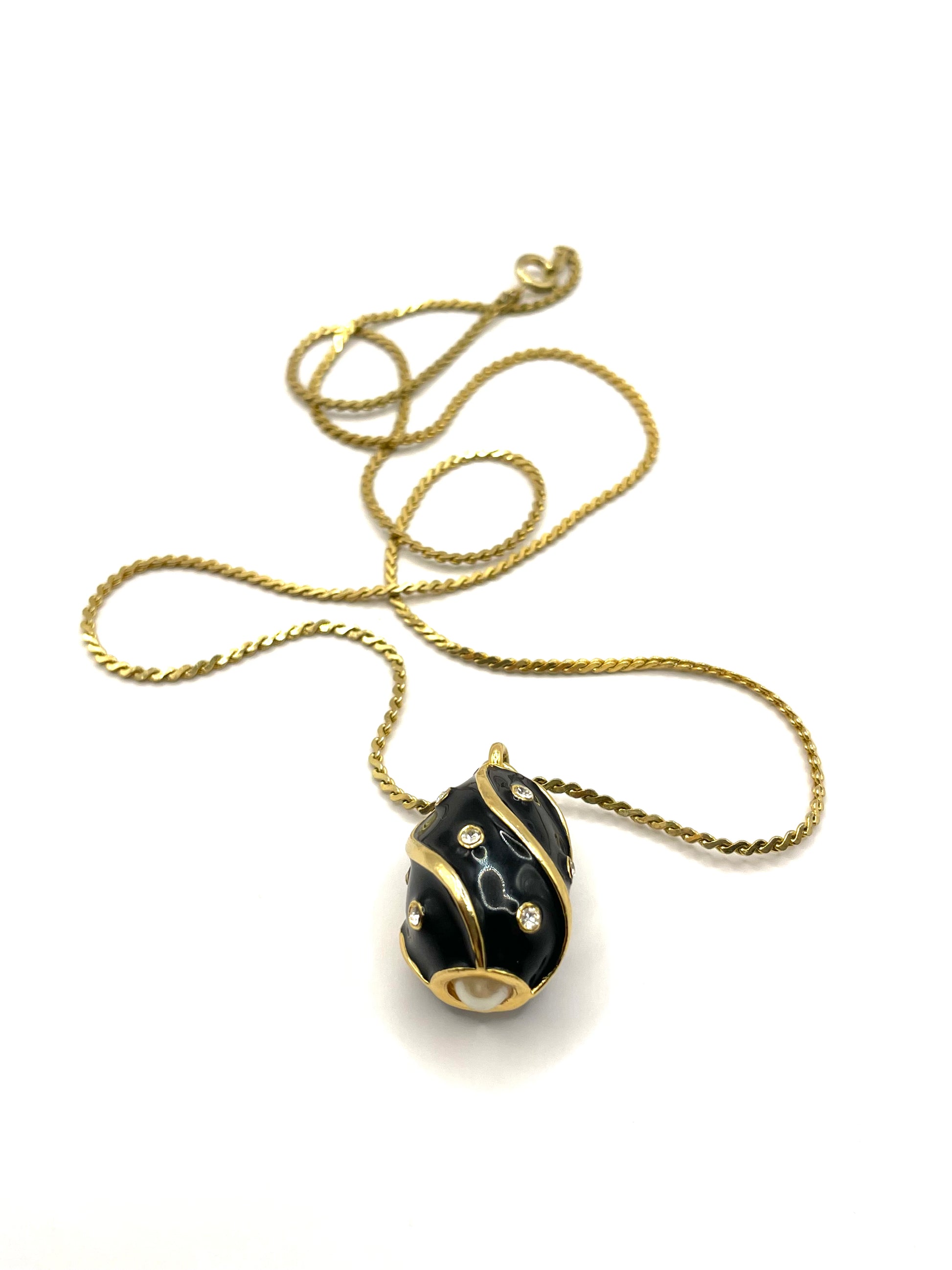 Vintage Egg Shape Enamel Rhinestone Pearl Pendant Necklace