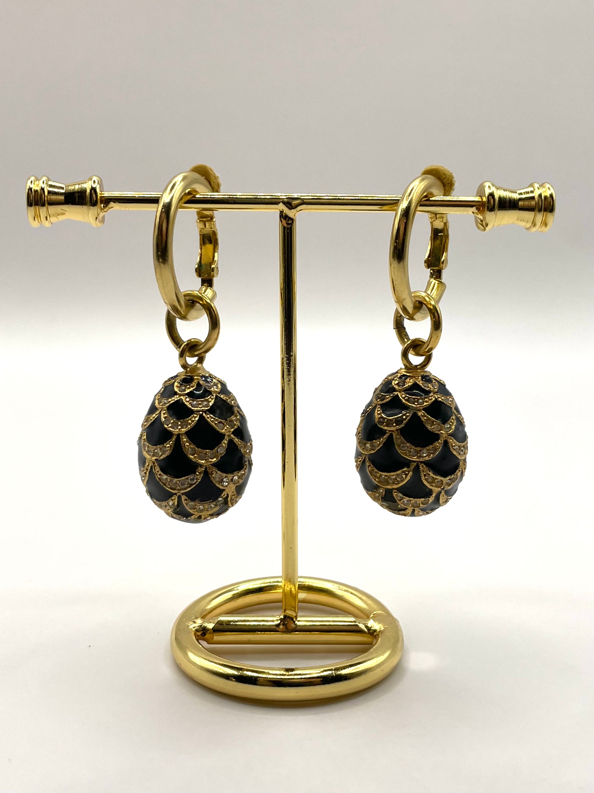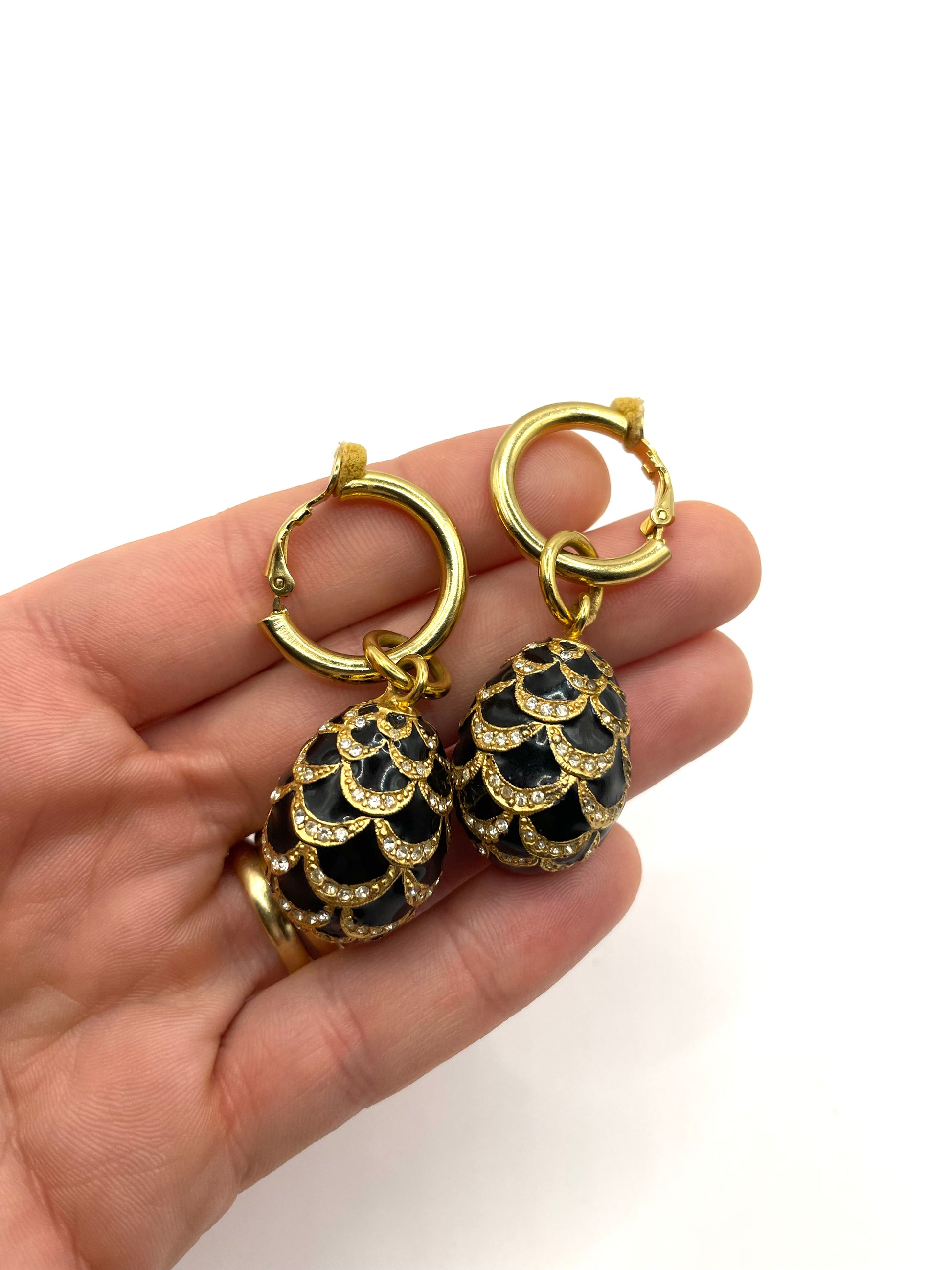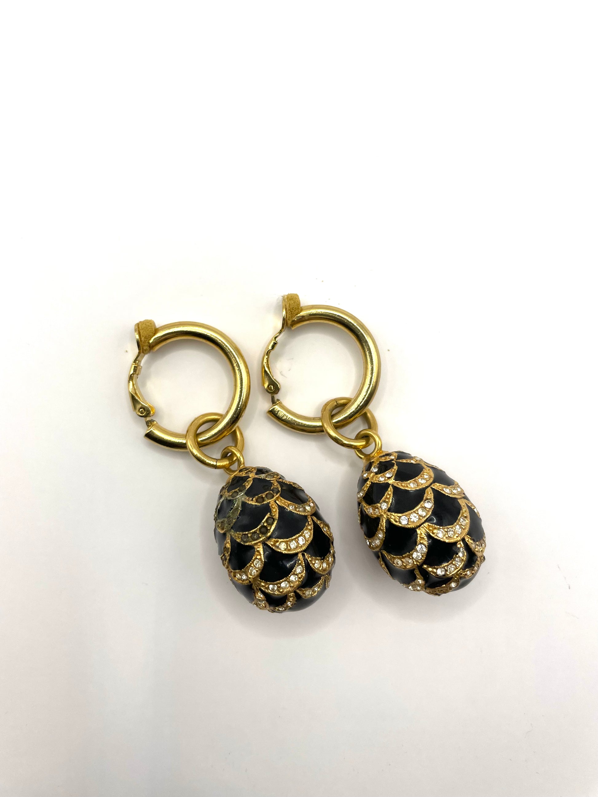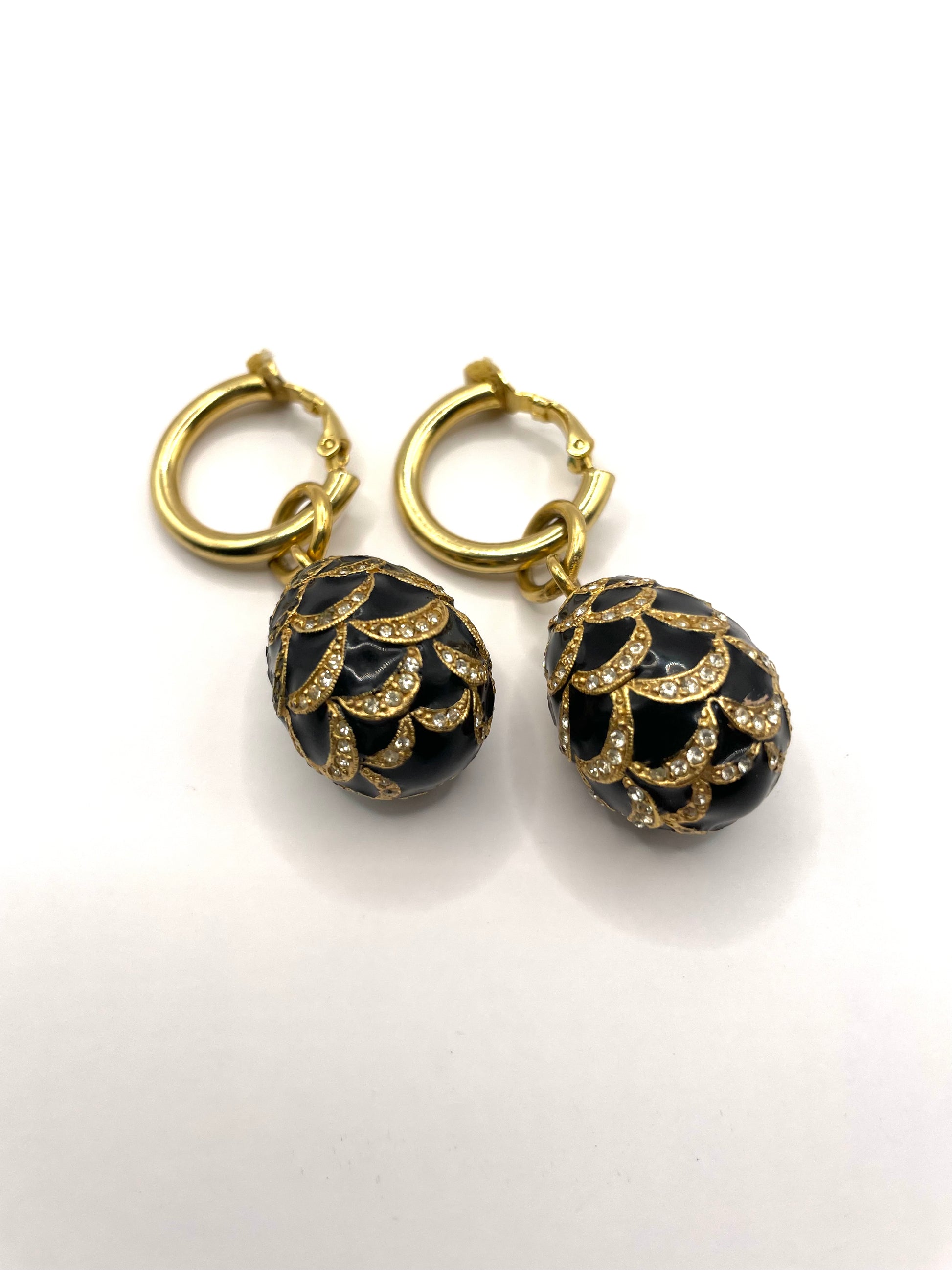 Vintage Faberge Egg Black Enamel Clear Rhinestone Dangle Clip on Earrings