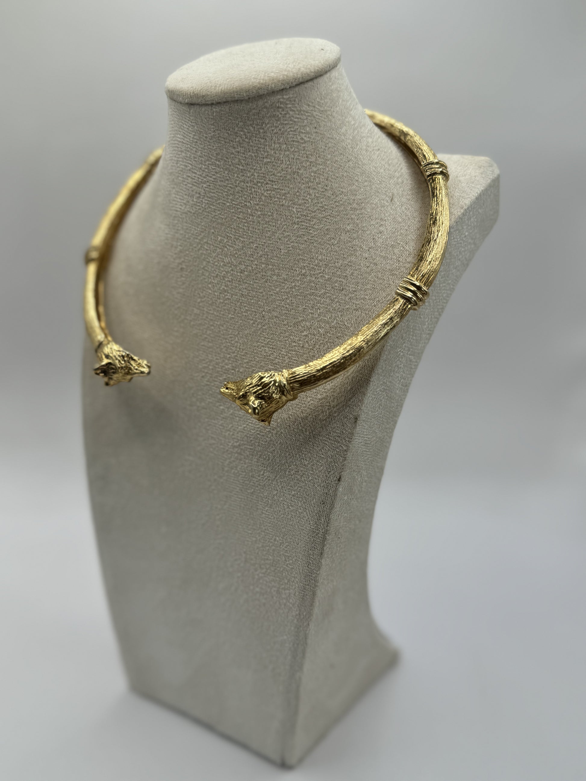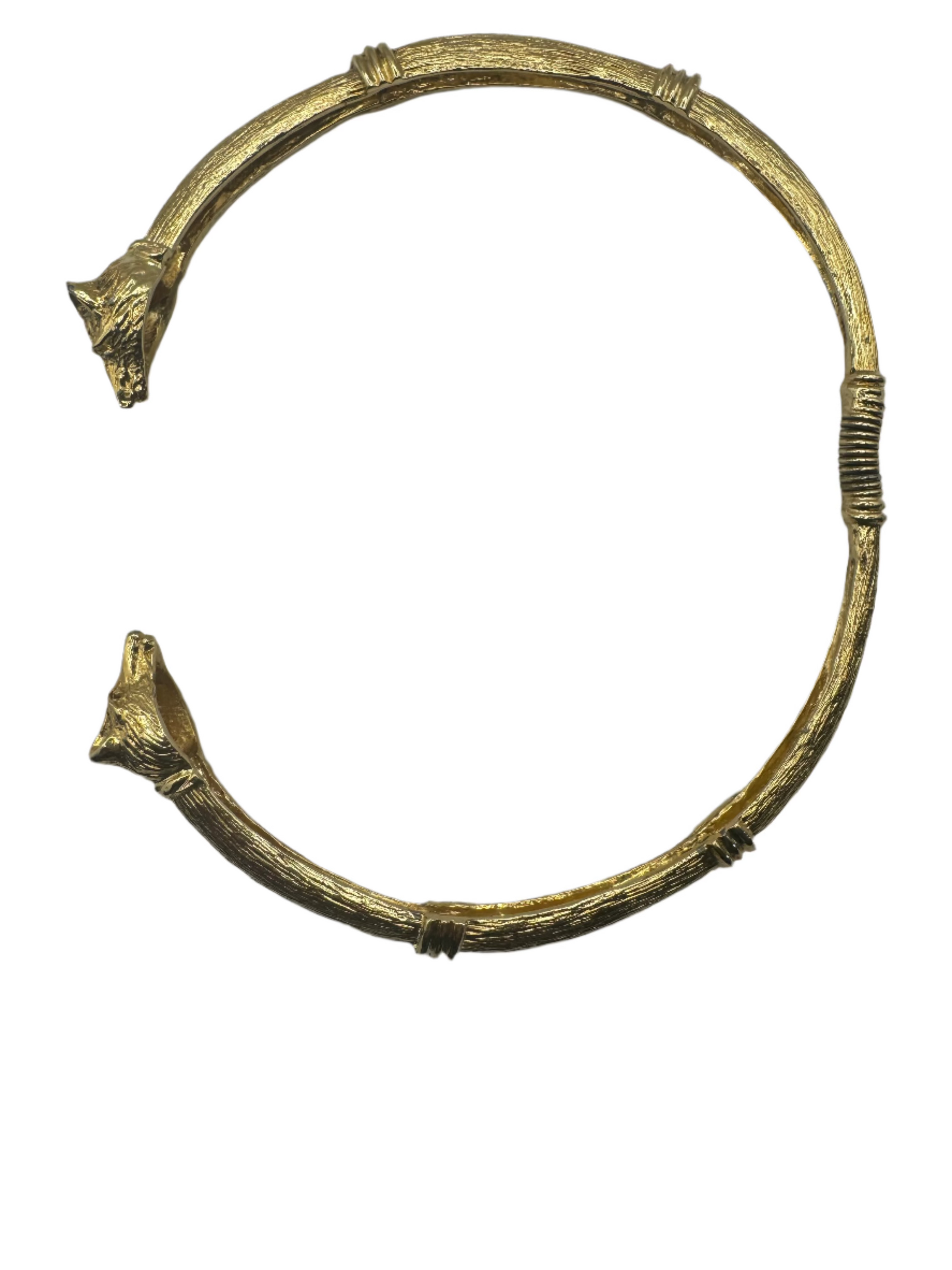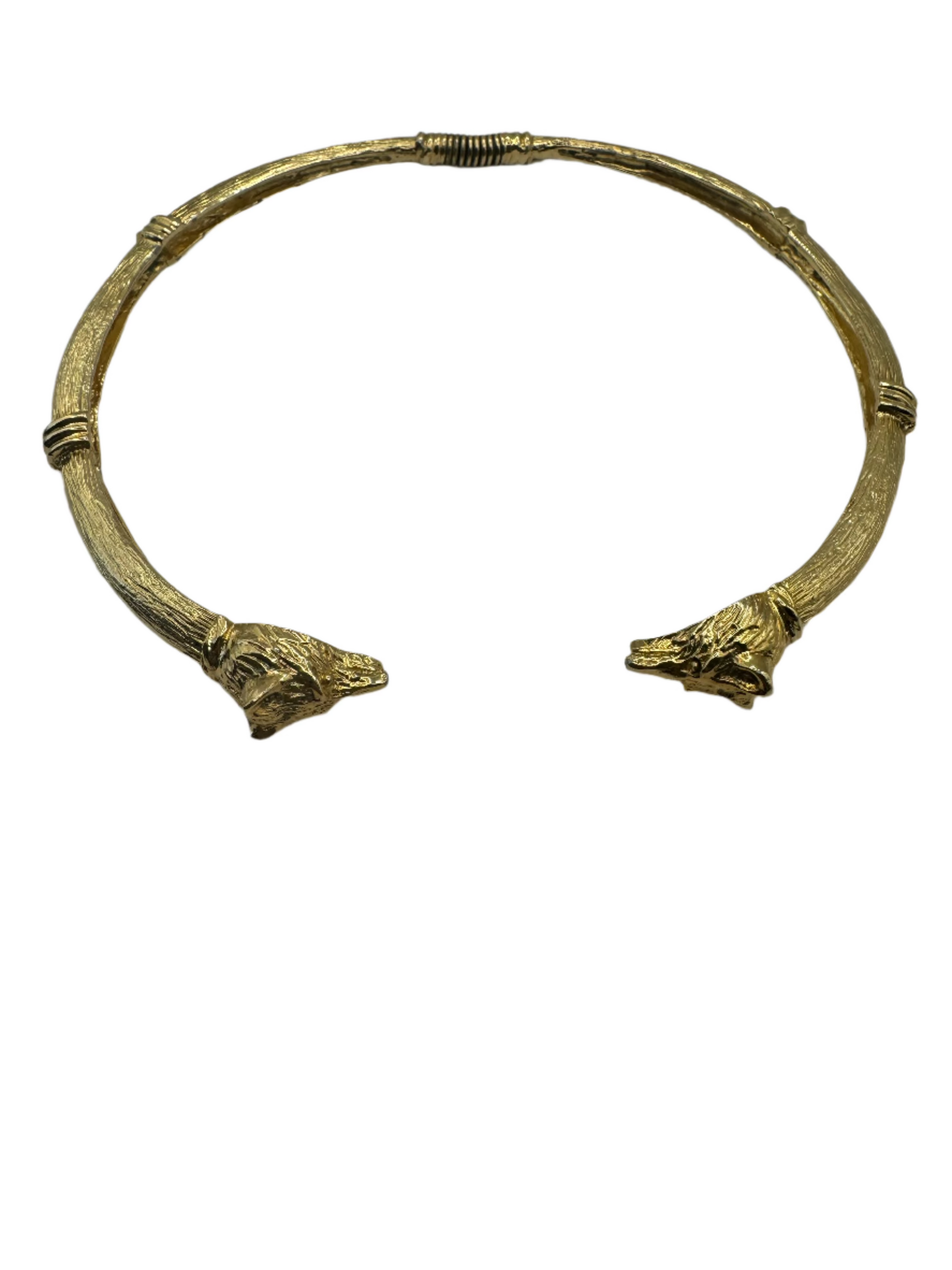 Gold-tone choker necklace with a spring-opening design. The necklace features stunning fox head details at both ends, which align perfectly at the center when worn. The spring mechanism allows for easy wear and creates a seamless, integrated design. It comfortably fits necks of all sizes and is an undeniably cool and stylish piece. I’ve tried to capture all the details in the photos. The necklace is in very good vintage condition. Diameter at the widest point without stretching the spring: 5 1/2 inches.