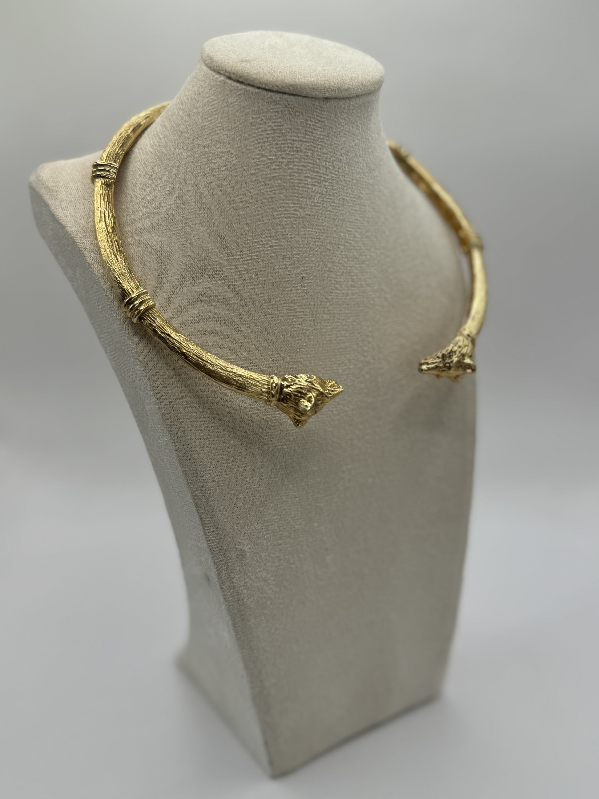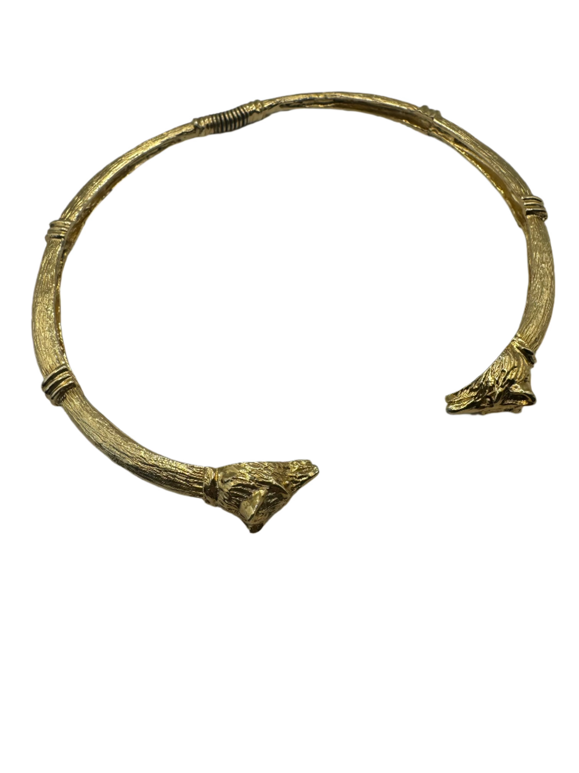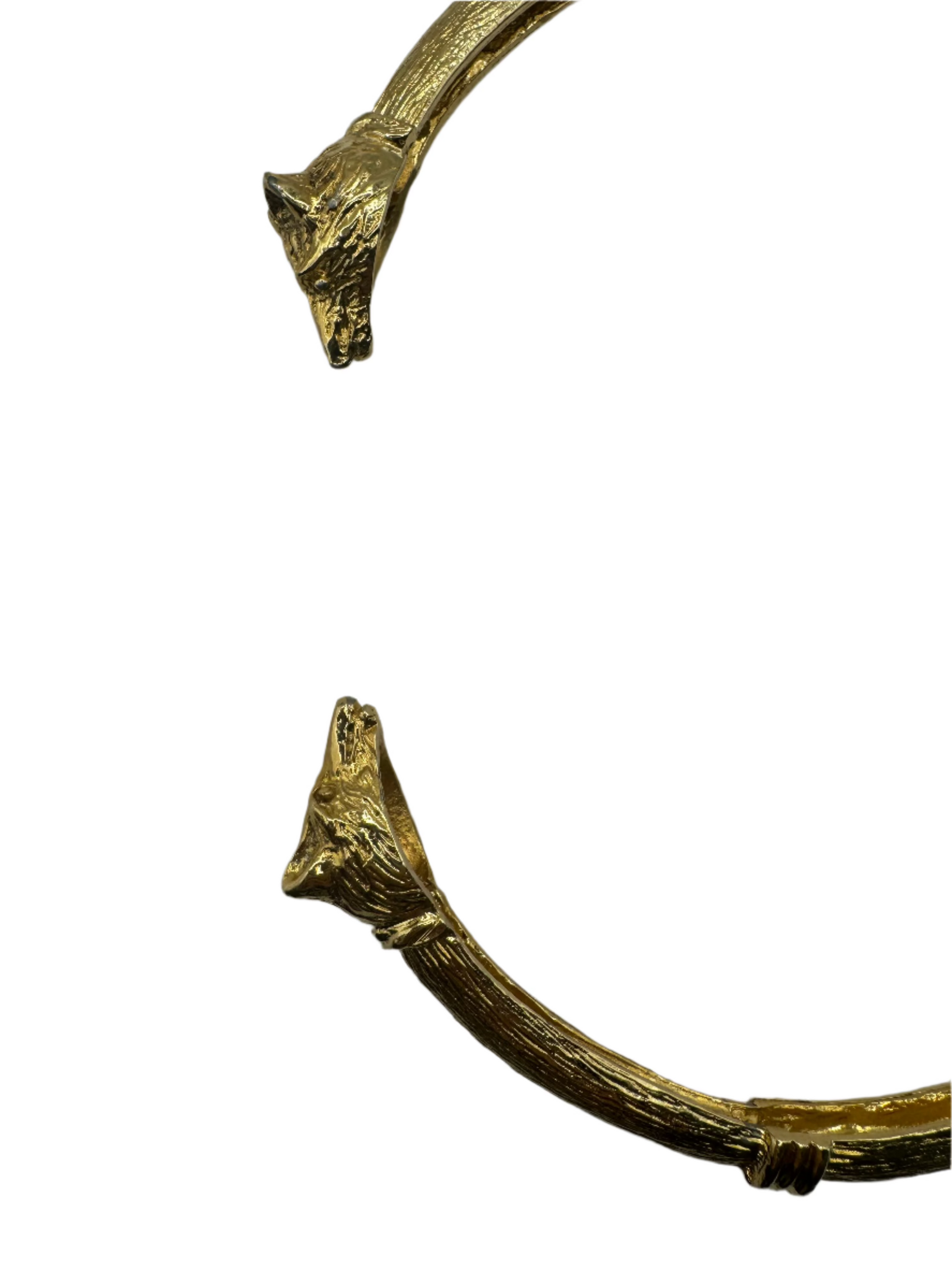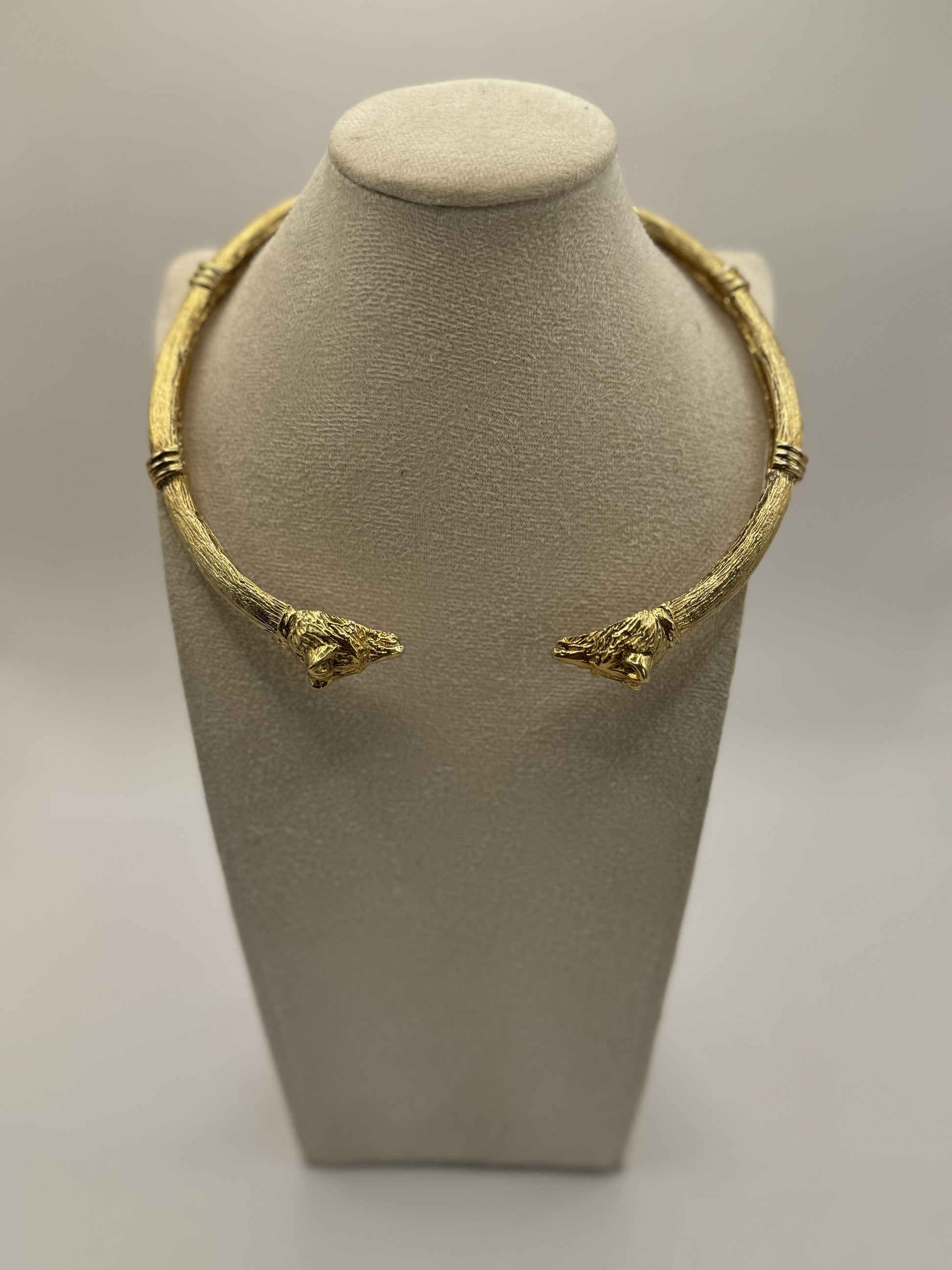 Gold-tone choker necklace with a spring-opening design. The necklace features stunning fox head details at both ends, which align perfectly at the center when worn. The spring mechanism allows for easy wear and creates a seamless, integrated design. It comfortably fits necks of all sizes and is an undeniably cool and stylish piece. I’ve tried to capture all the details in the photos. The necklace is in very good vintage condition. Diameter at the widest point without stretching the spring: 5 1/2 inches.