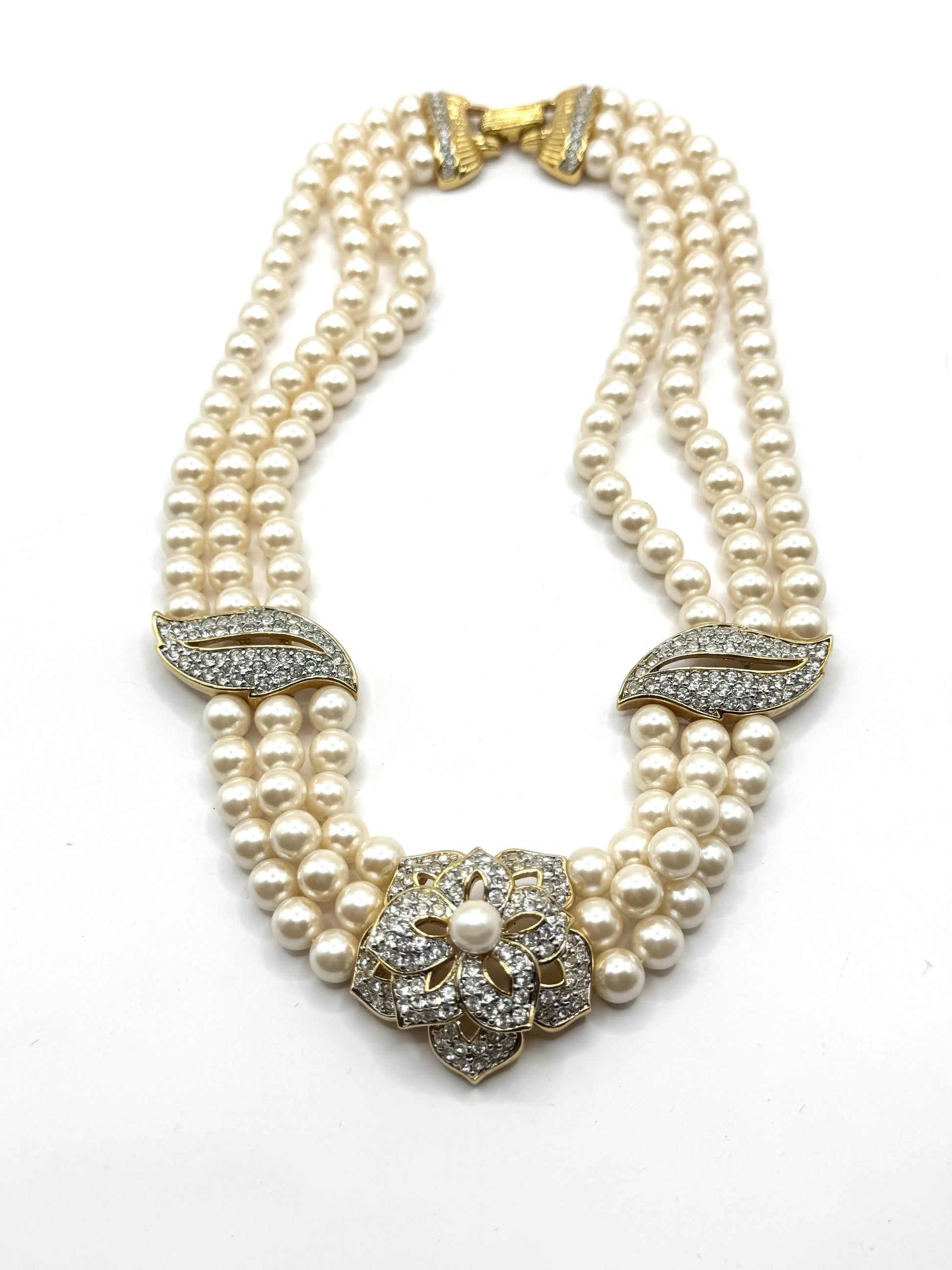 This stunning 3-strand pearl necklace from the Franklin Mint Joan Collins Collection is a timeless statement of glamour and sophistication. Designed to capture the essence of vintage Hollywood luxury, the necklace features: