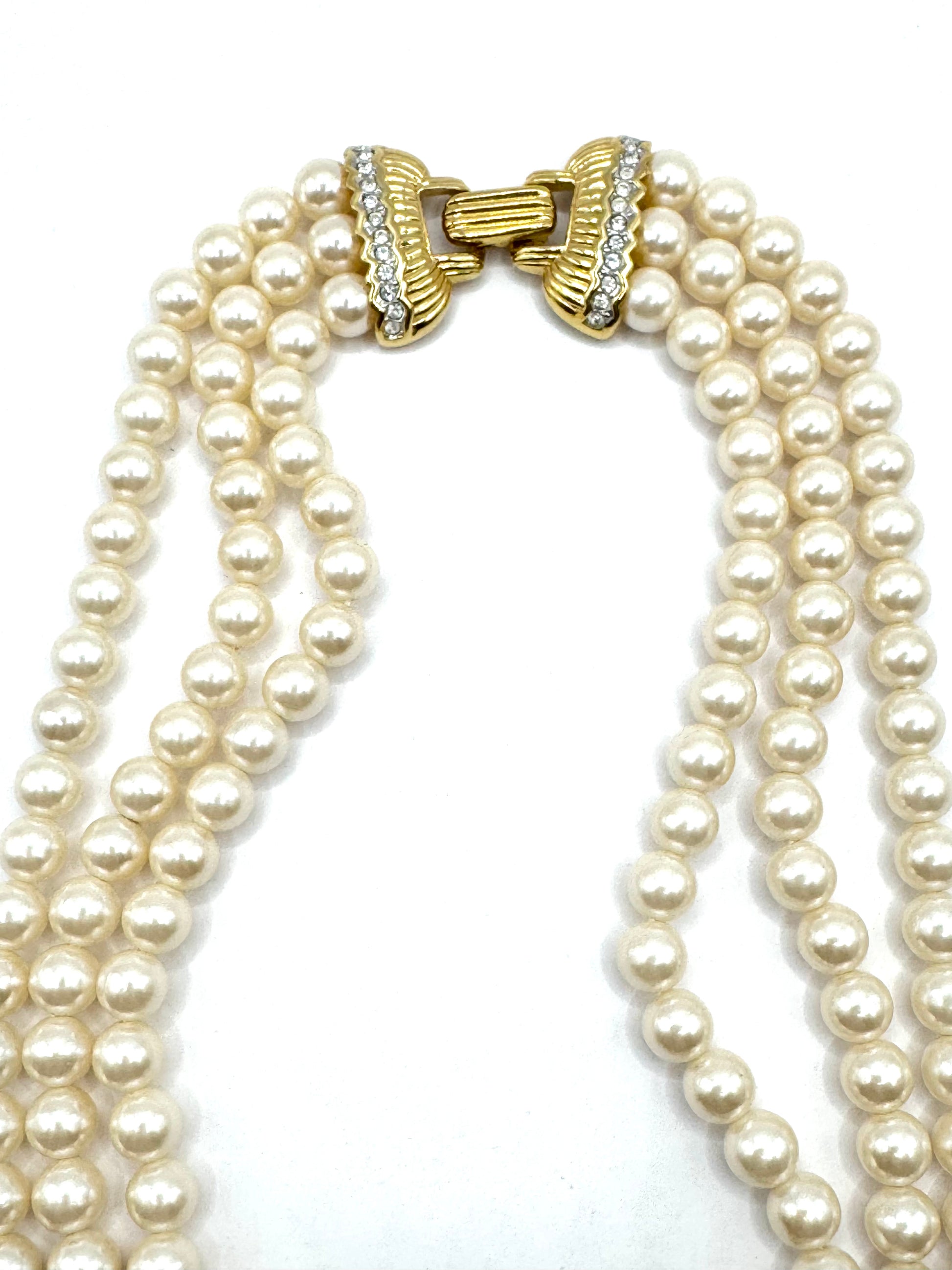 - Three strands of luminous faux pearls, perfectly graduated to create an elegant, layered effect.