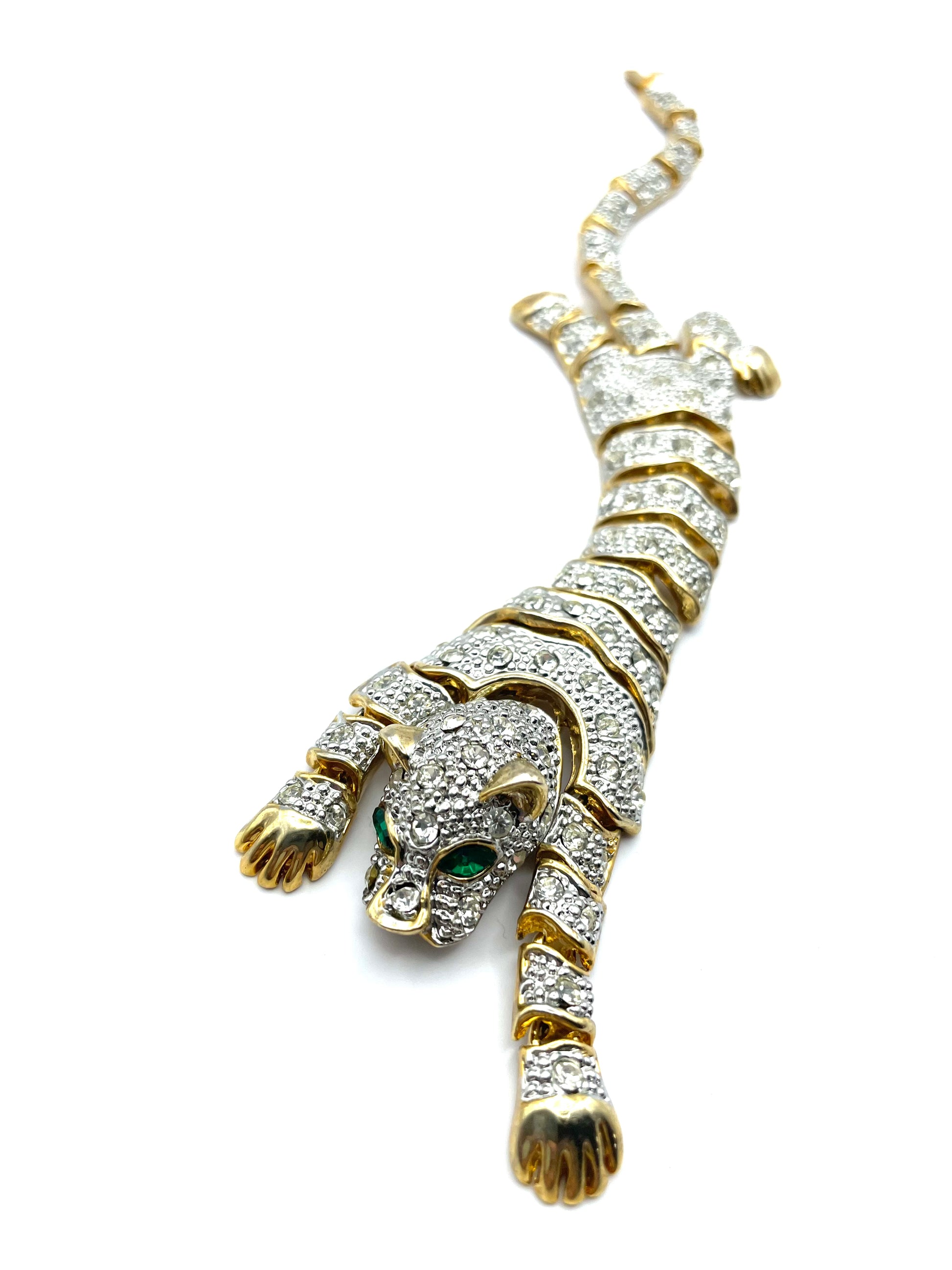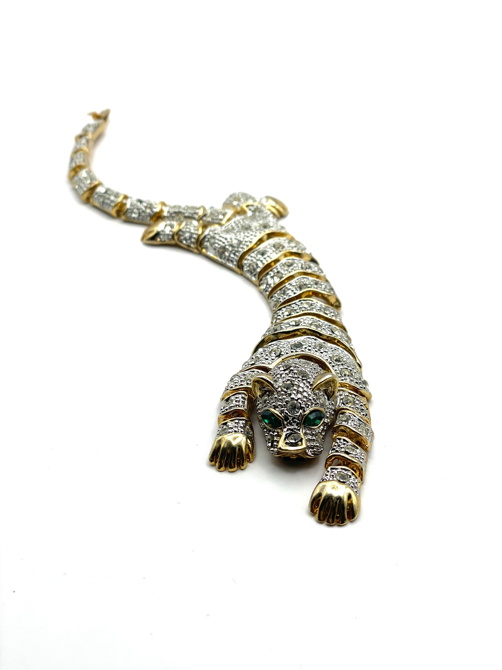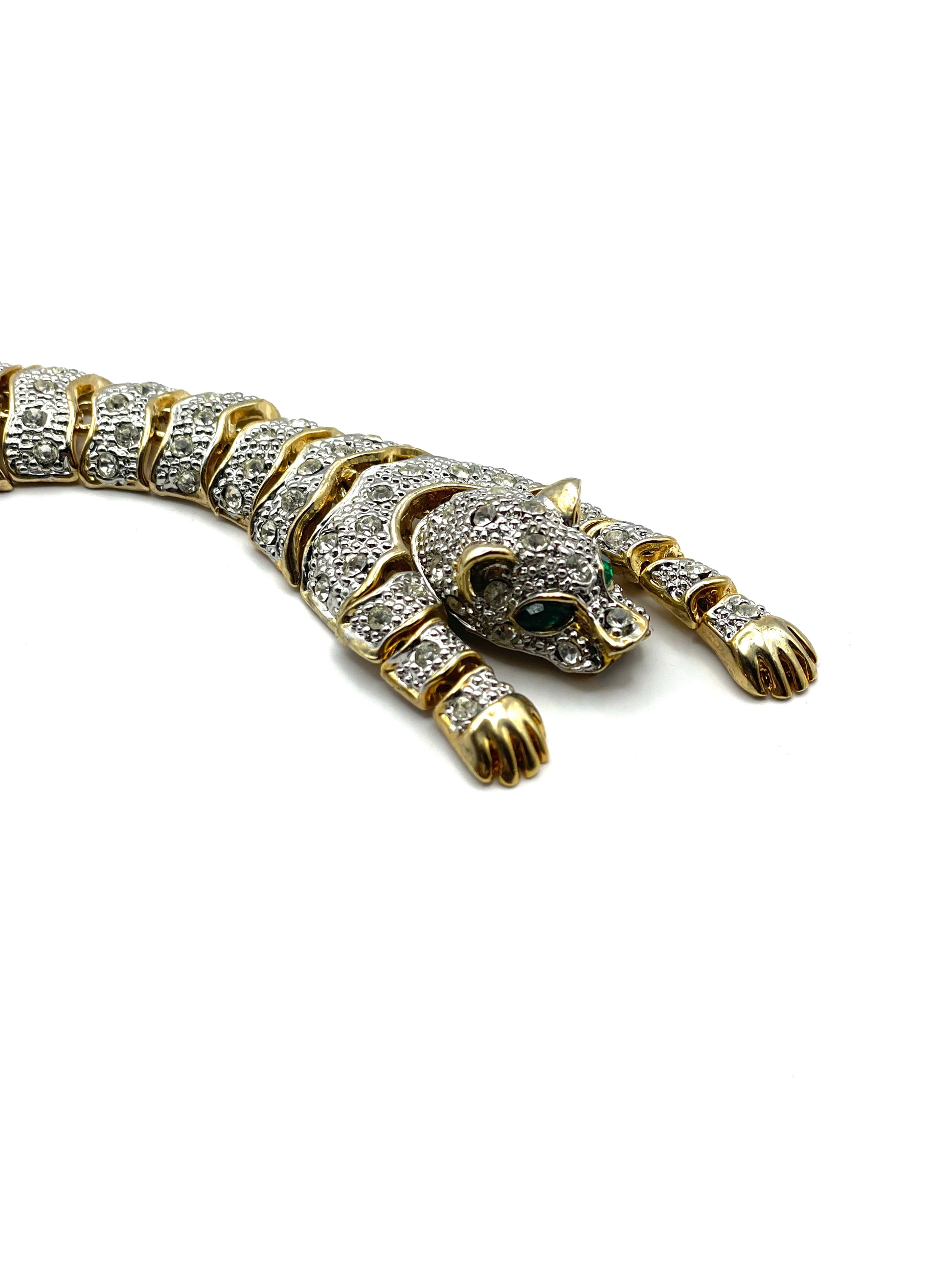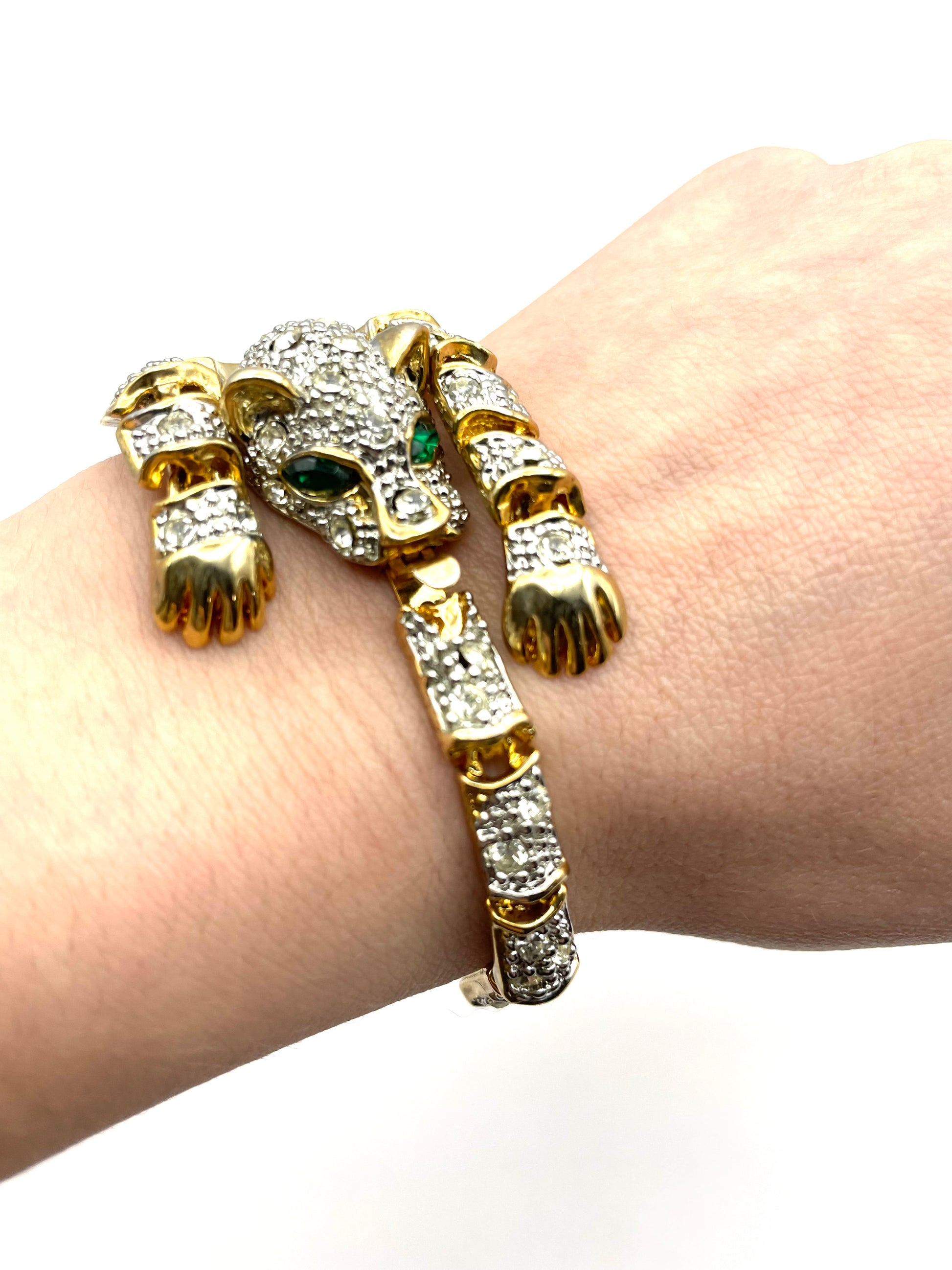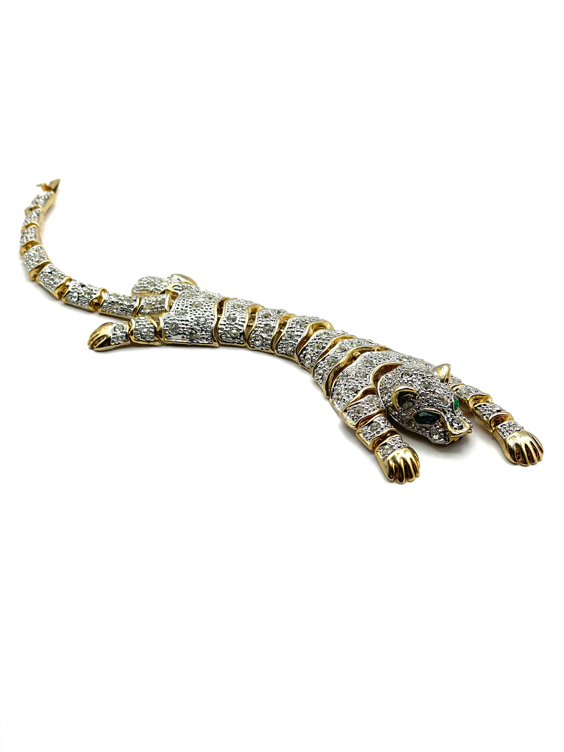 Gorgeous vintage gold-plated articulated panther bracelet. Clear rhinestones, and navette emerald green rhinestones on eyes, in perfect vintage condition.