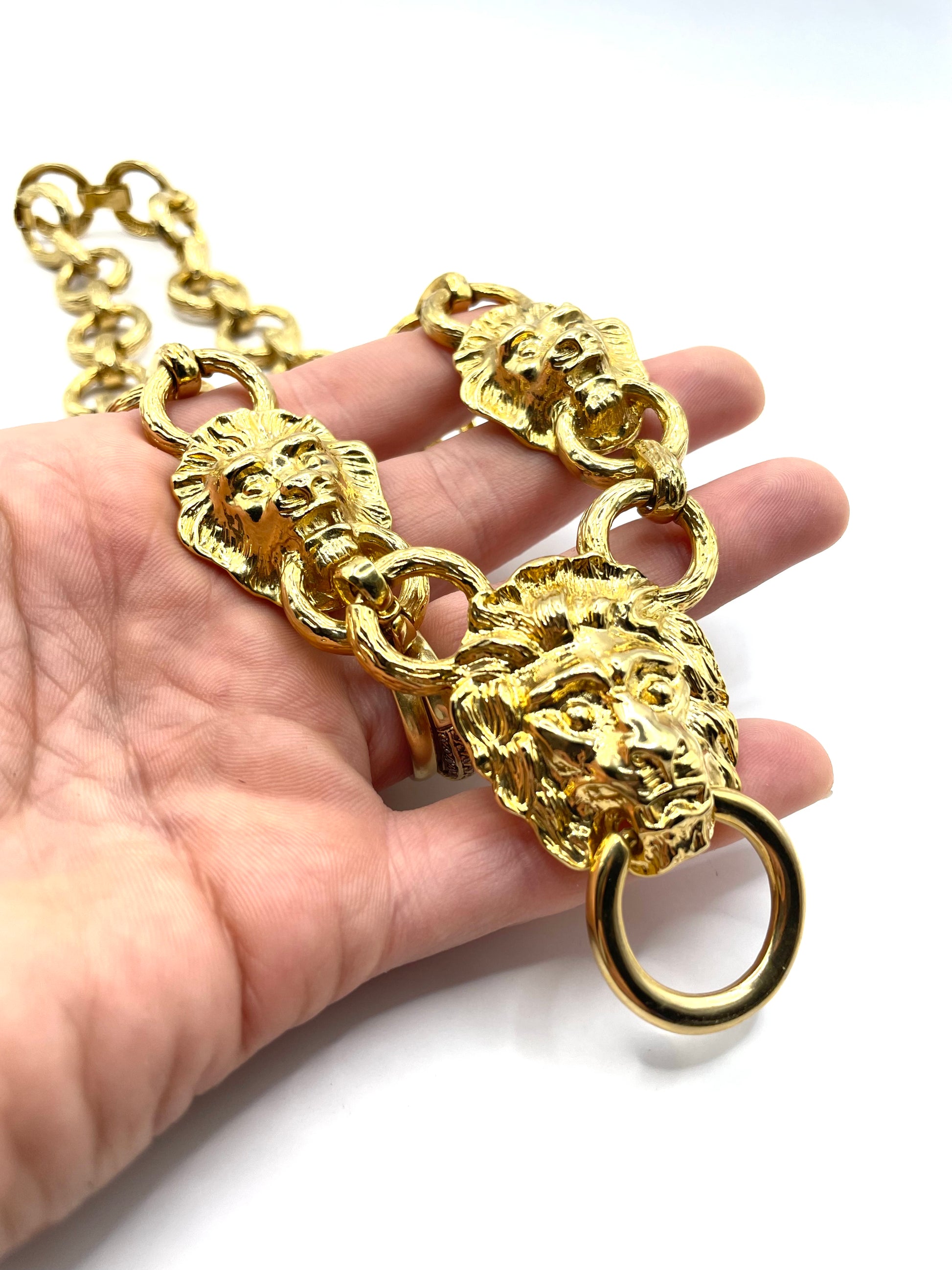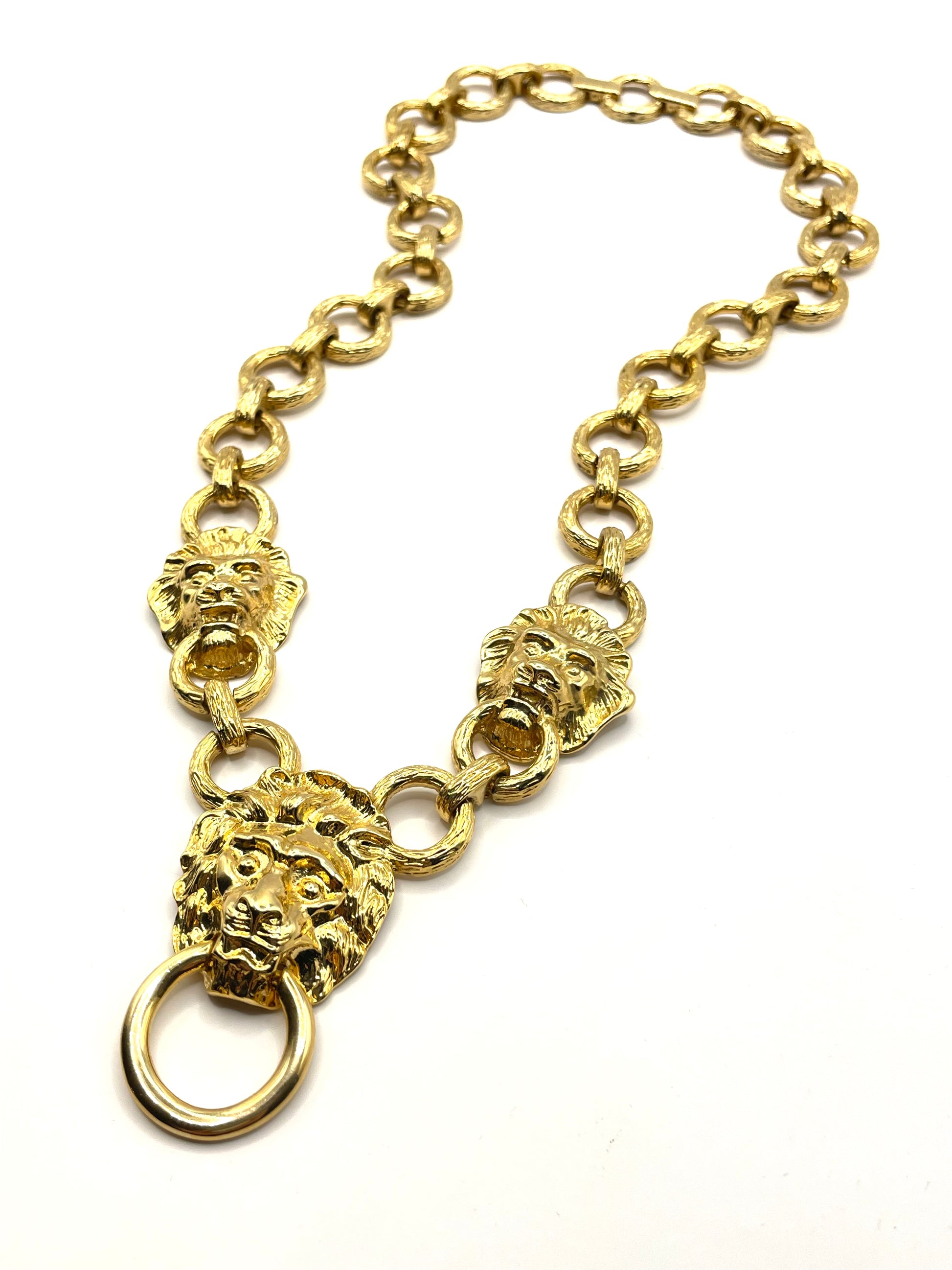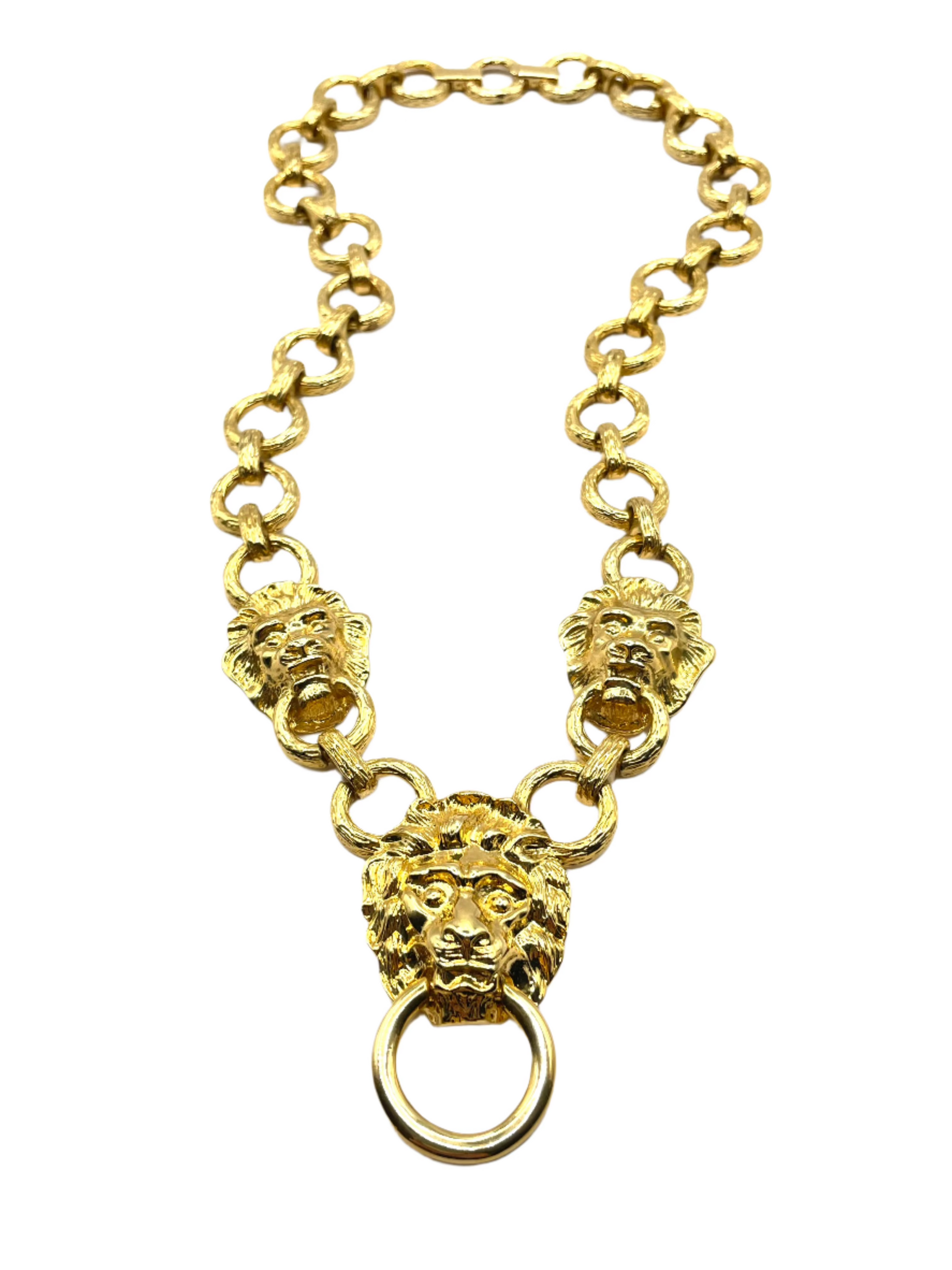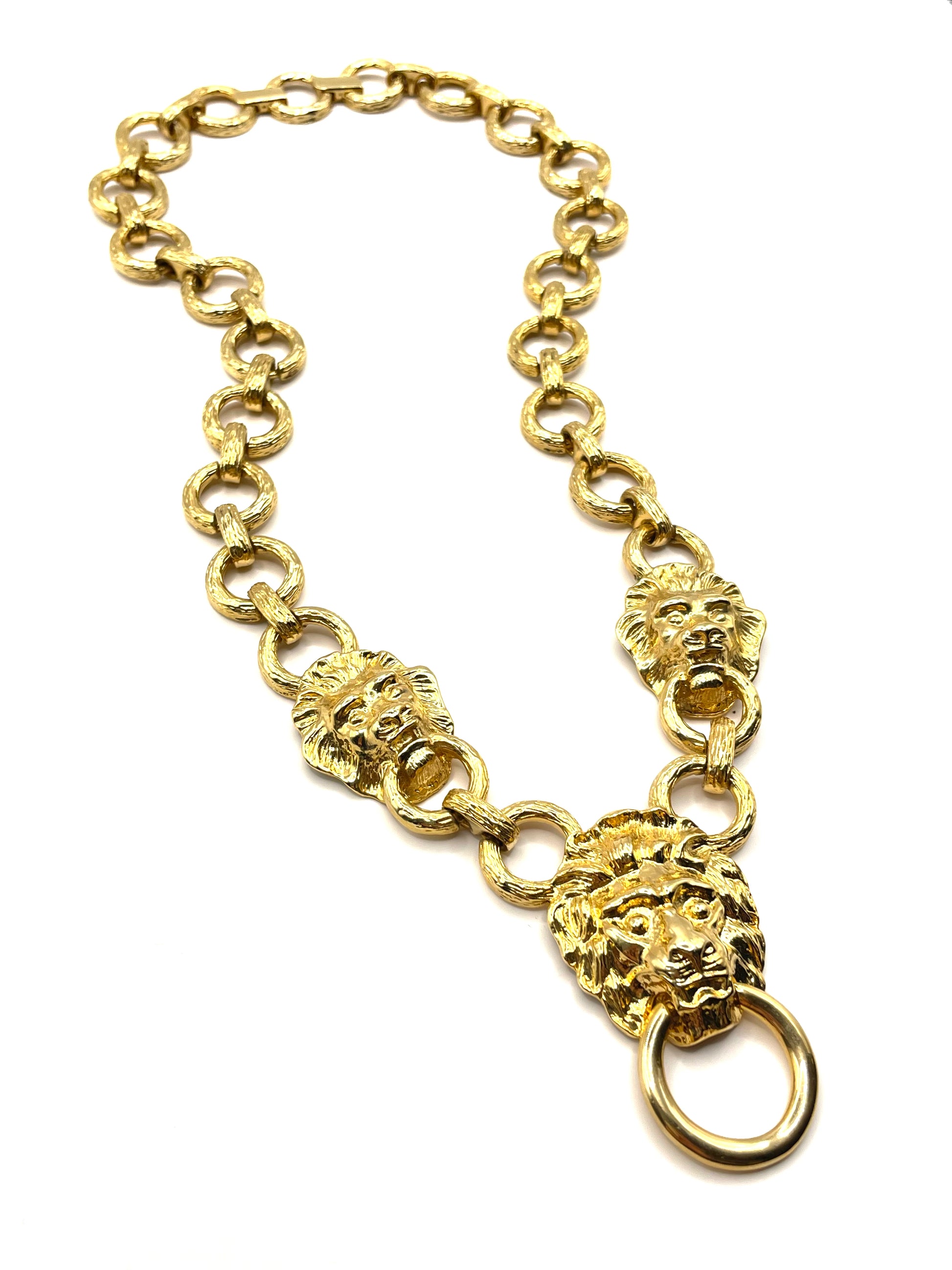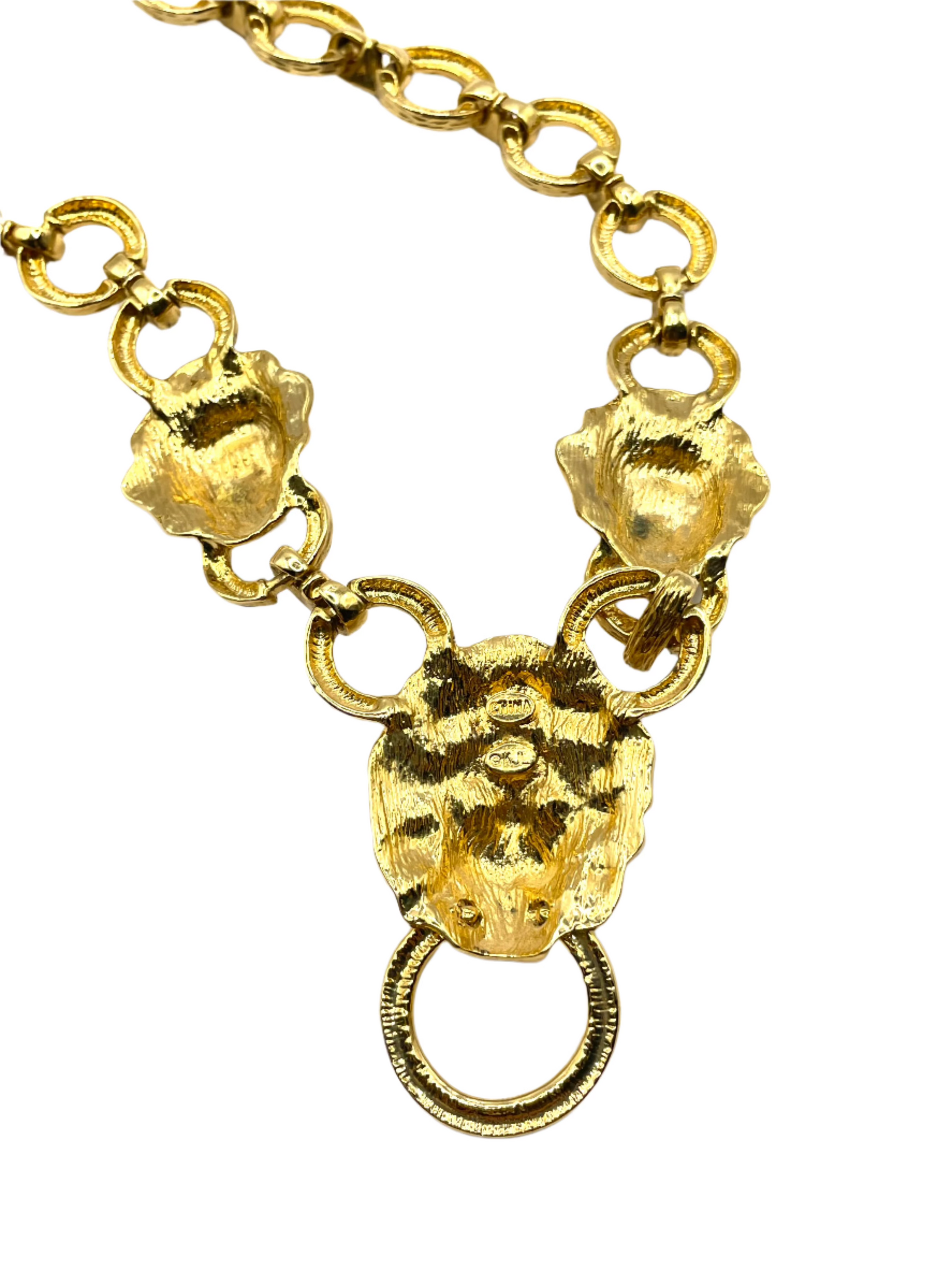 Beautiful, chunky, bold KJL necklace from the 1990s. Large lion-head door knocker center with lion heads on each side on a link chain. 22kt gold plated, fold-over clasp, and removable extension 1" long.