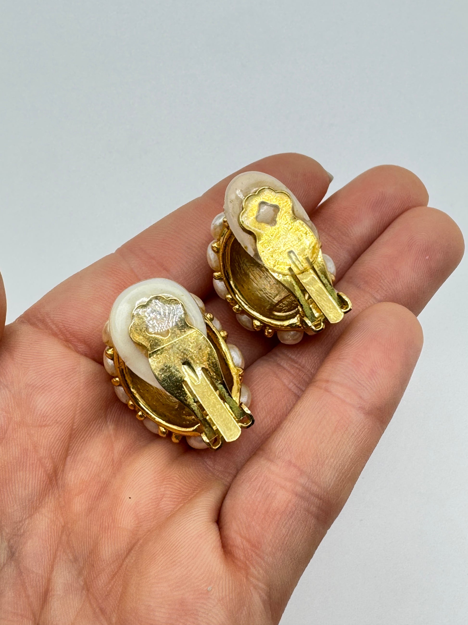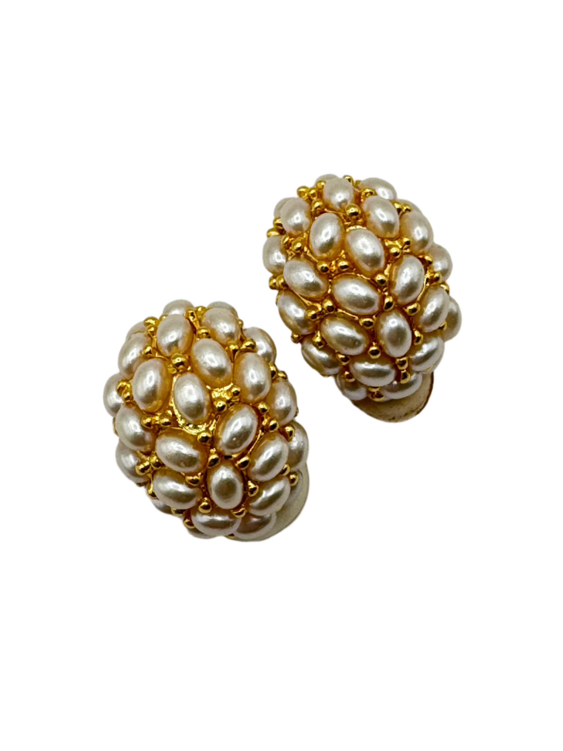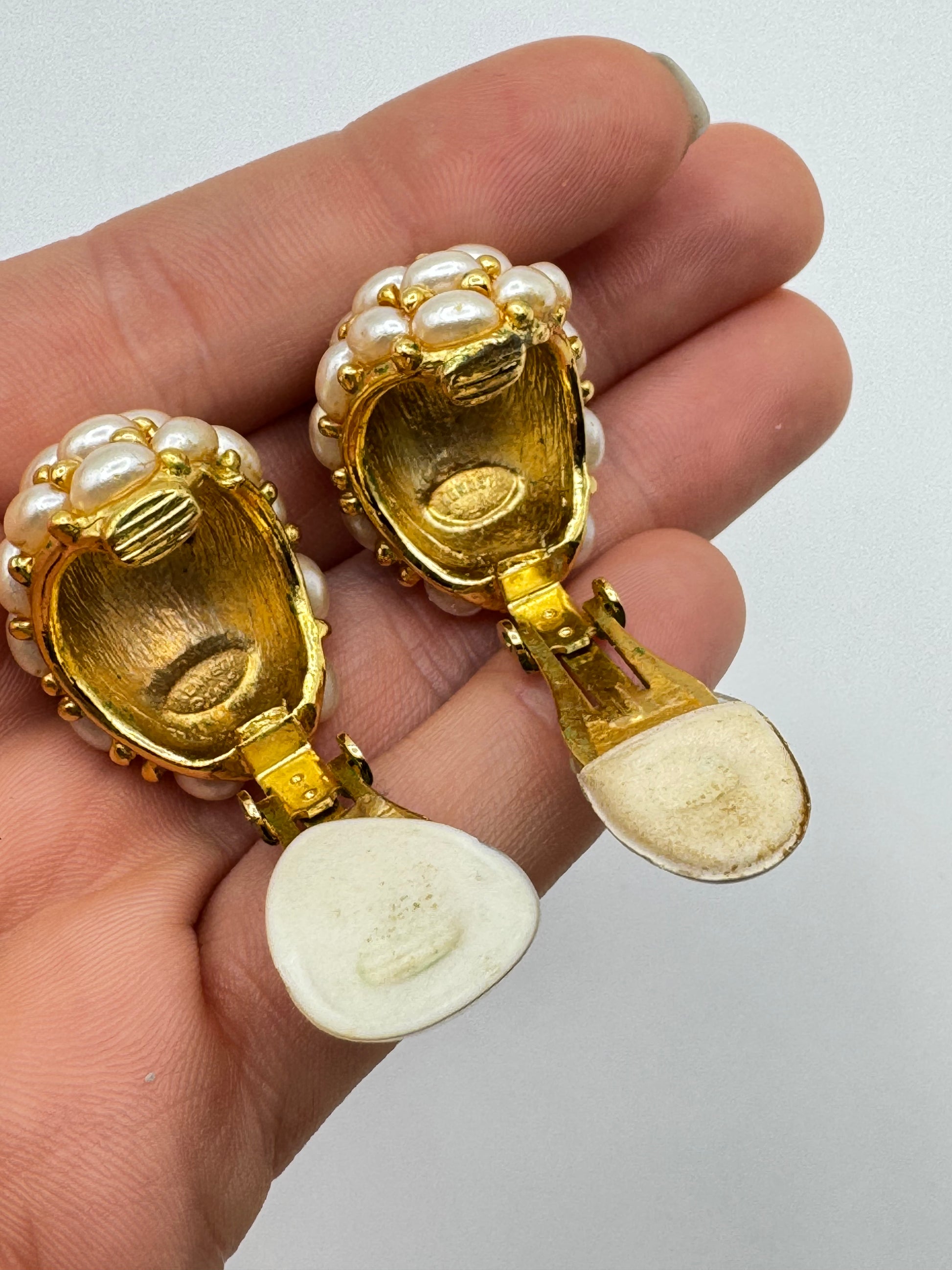 Make a bold vintage statement with these iconic Kenneth Jay Lane clip-on earrings, featuring a voluminous cluster of oval faux pearls in a rich gold-tone setting. With their sculptural, almost regal shape, these earrings channel 1980s glamour with a timeless appeal.