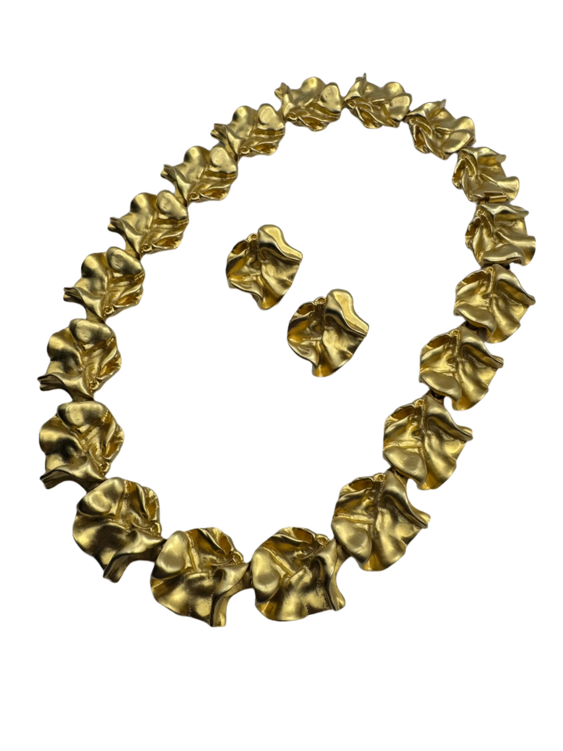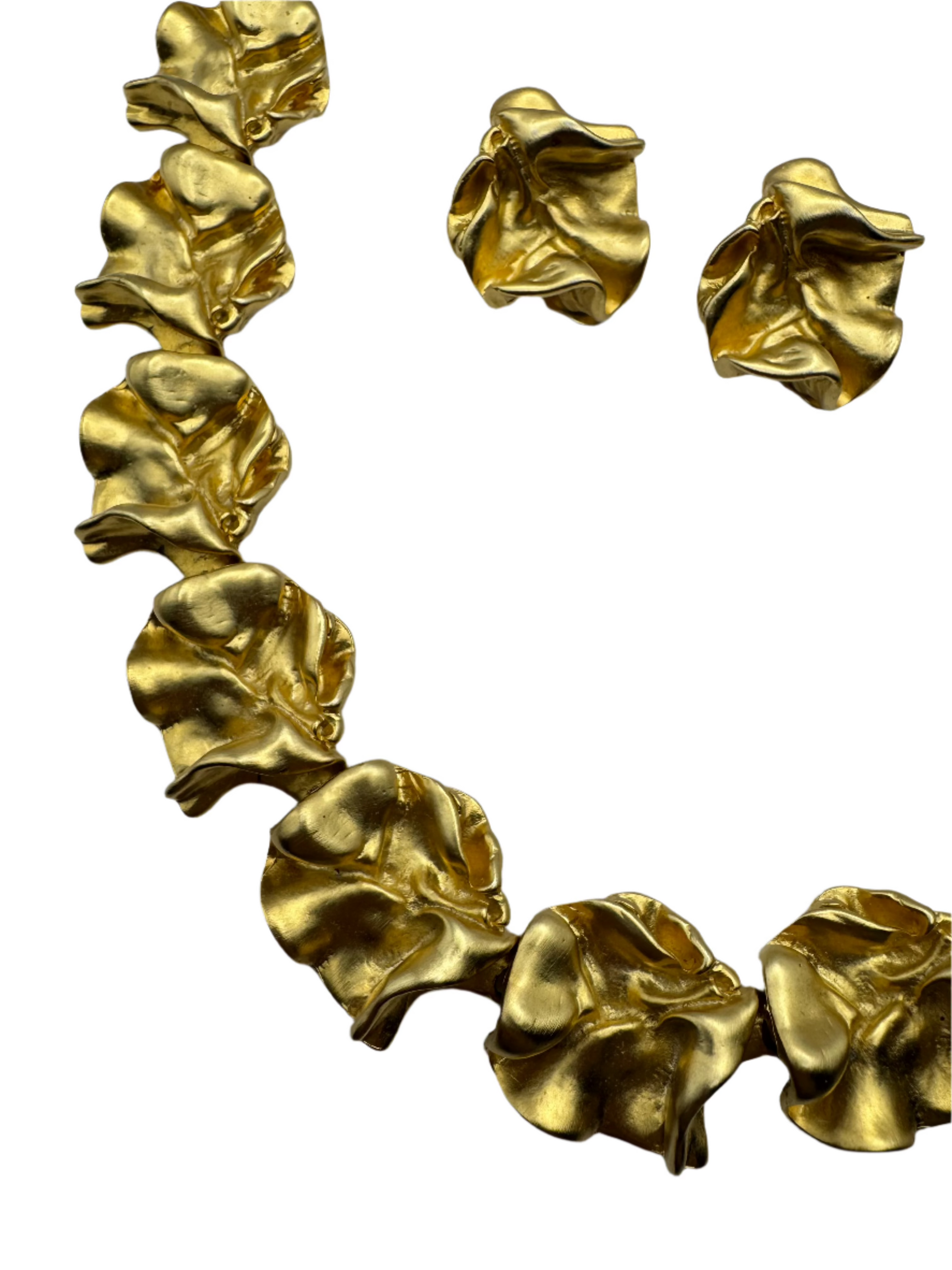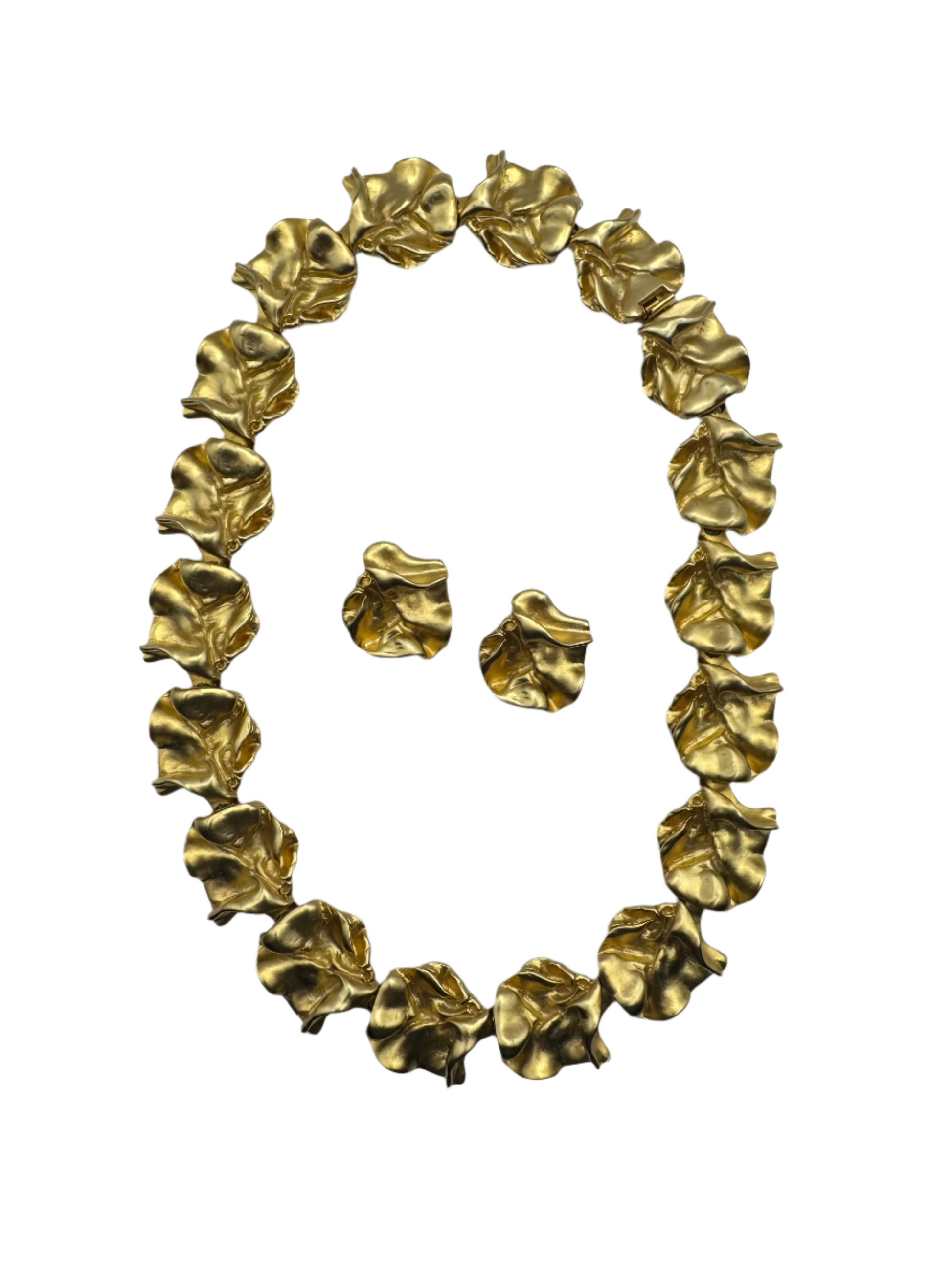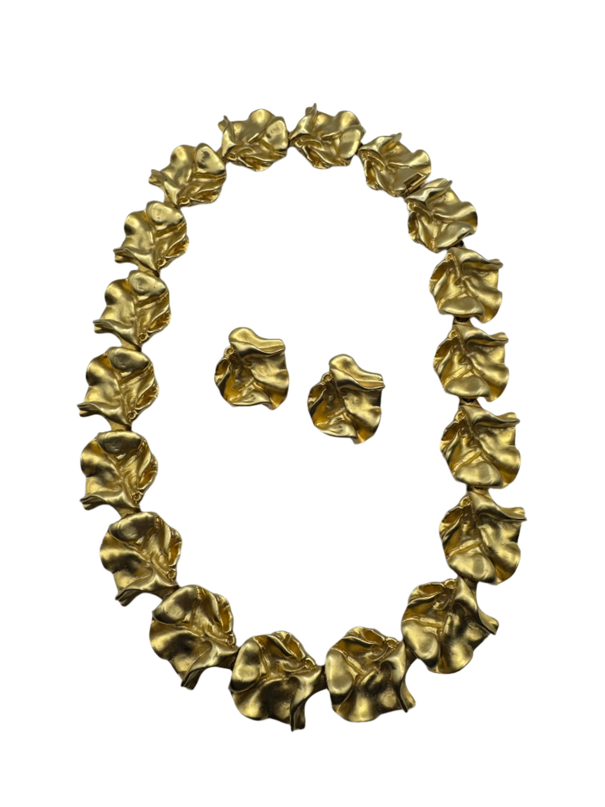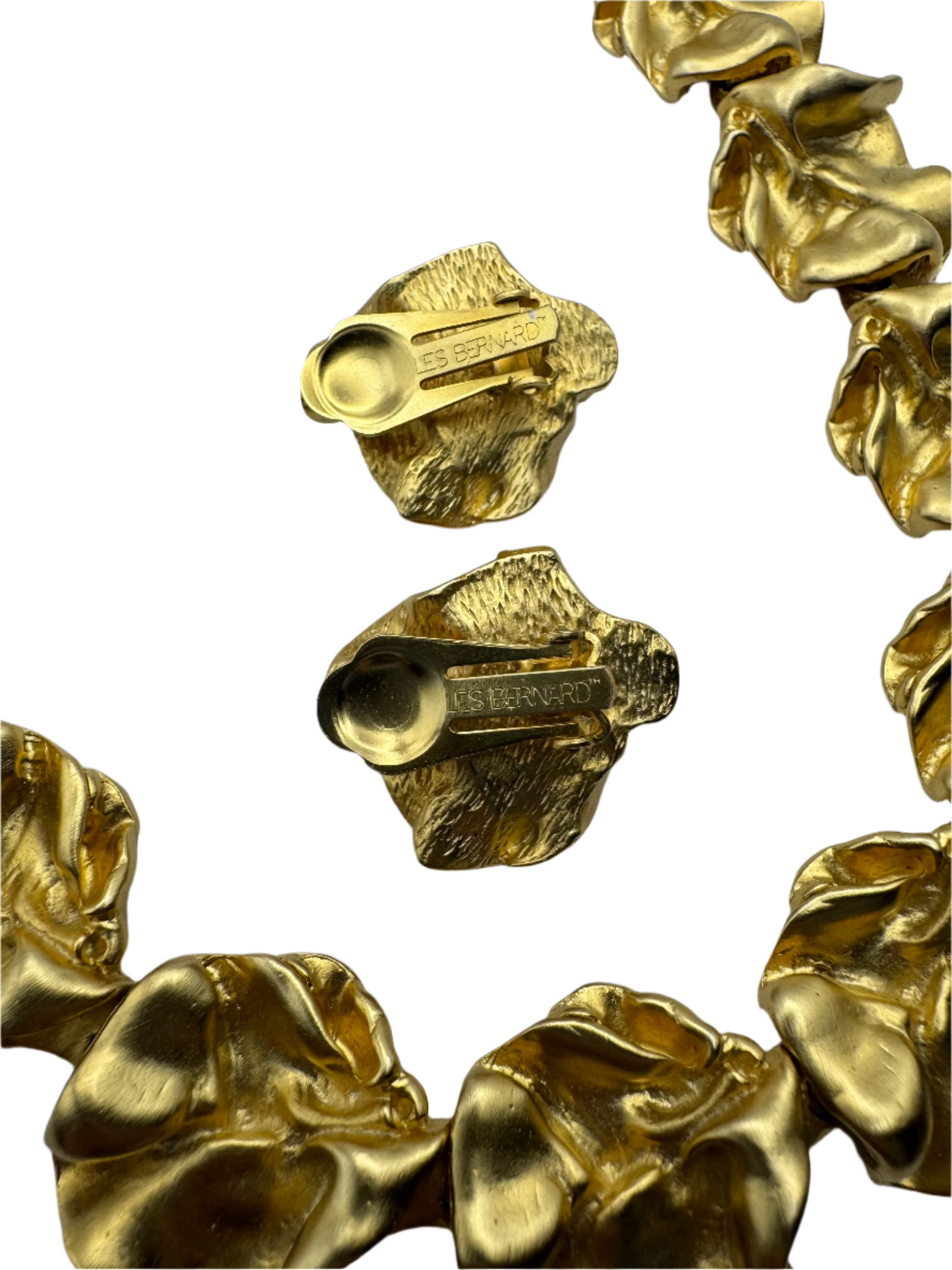 An exceptional 1980s set by Les Bernard a designer known for transforming jewelry into wearable sculpture. This matching necklace and clip-on earring duo is composed of abstract, folded gold-tone forms that resemble crumpled petals, molten fabric, or windswept metal.