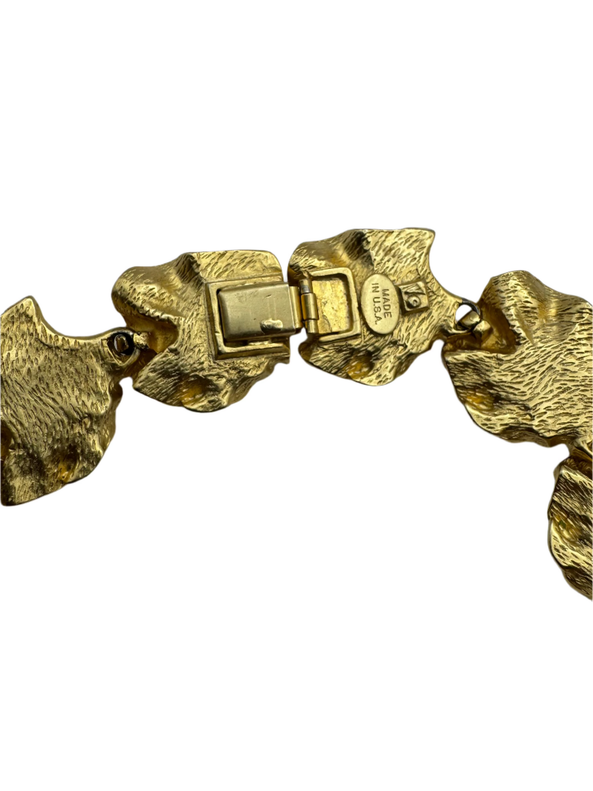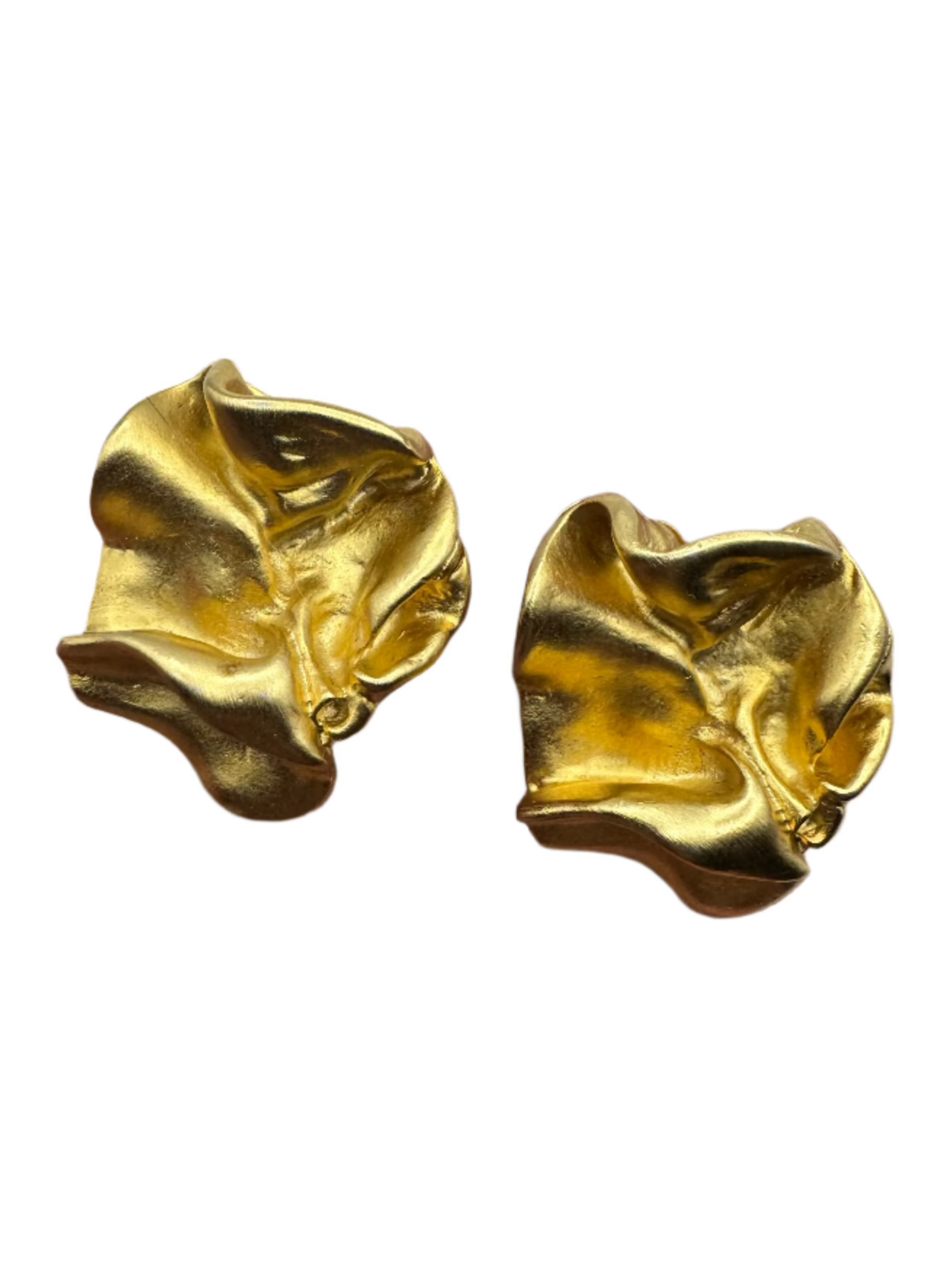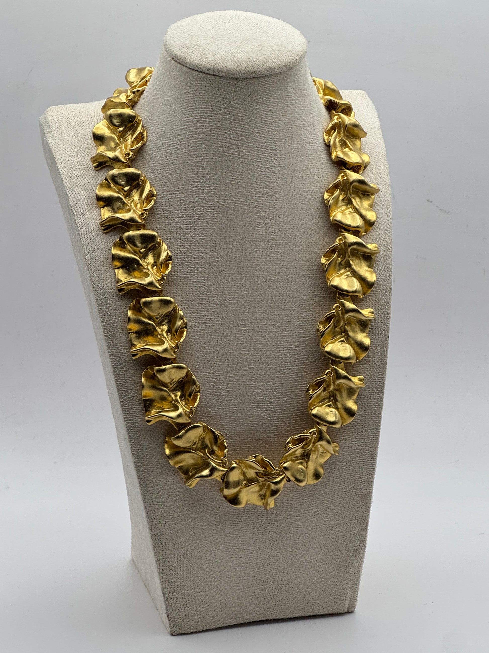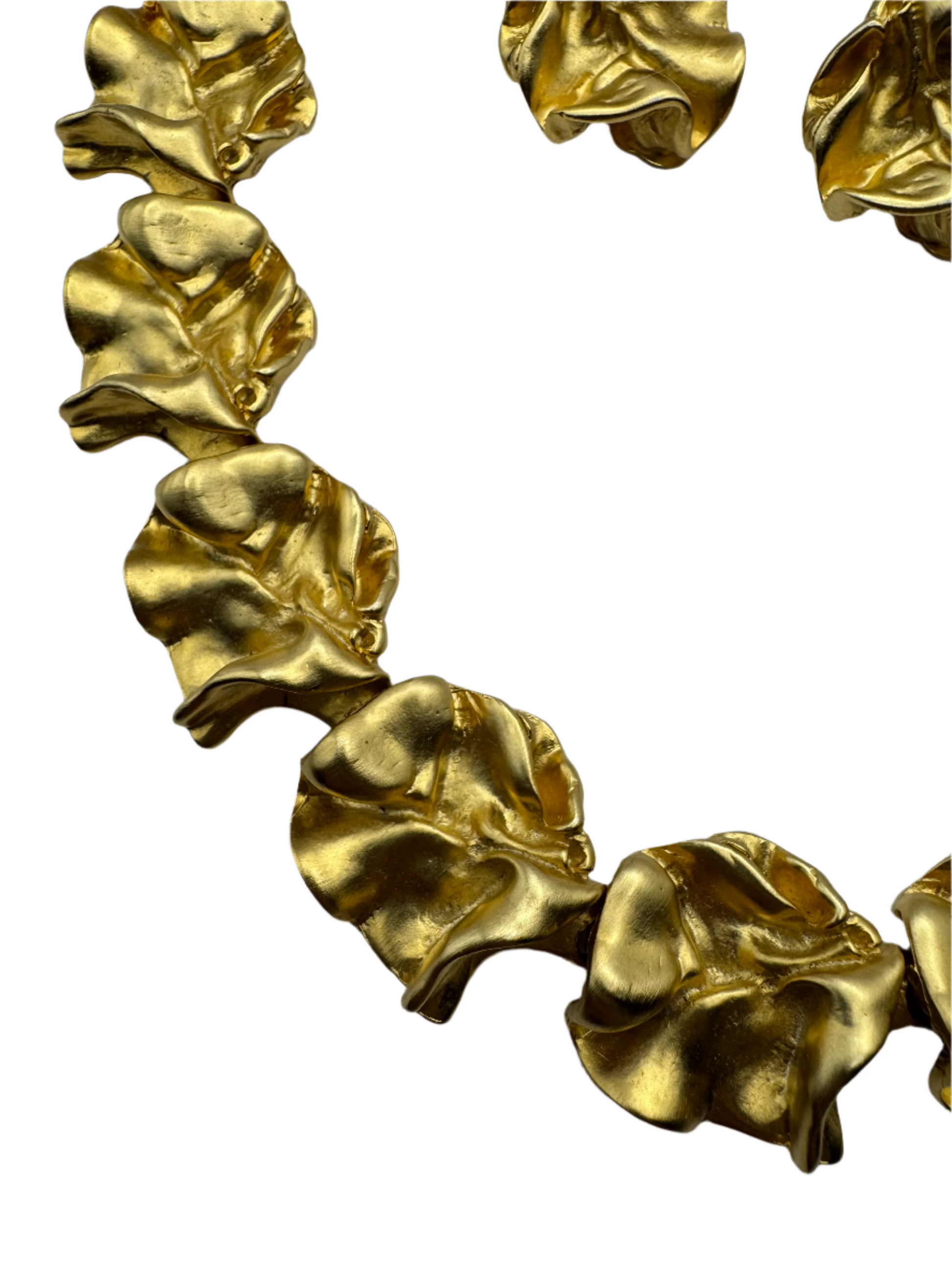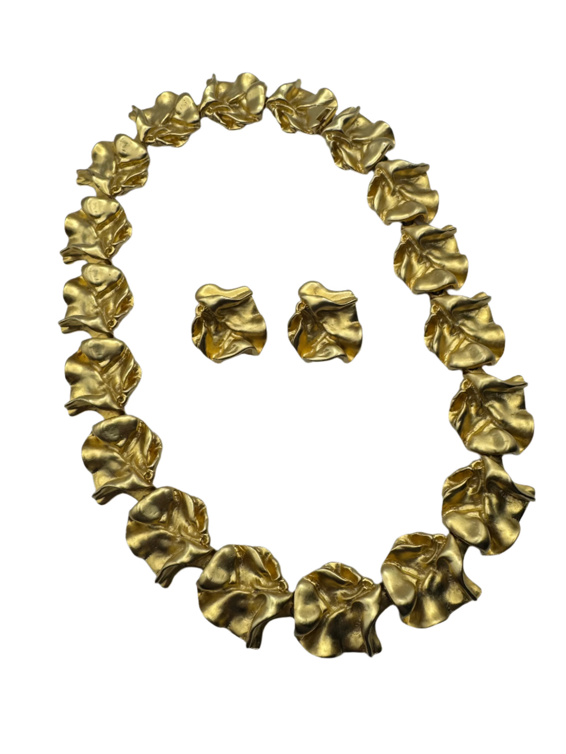 An exceptional 1980s set by Les Bernard a designer known for transforming jewelry into wearable sculpture. This matching necklace and clip-on earring duo is composed of abstract, folded gold-tone forms that resemble crumpled petals, molten fabric, or windswept metal.