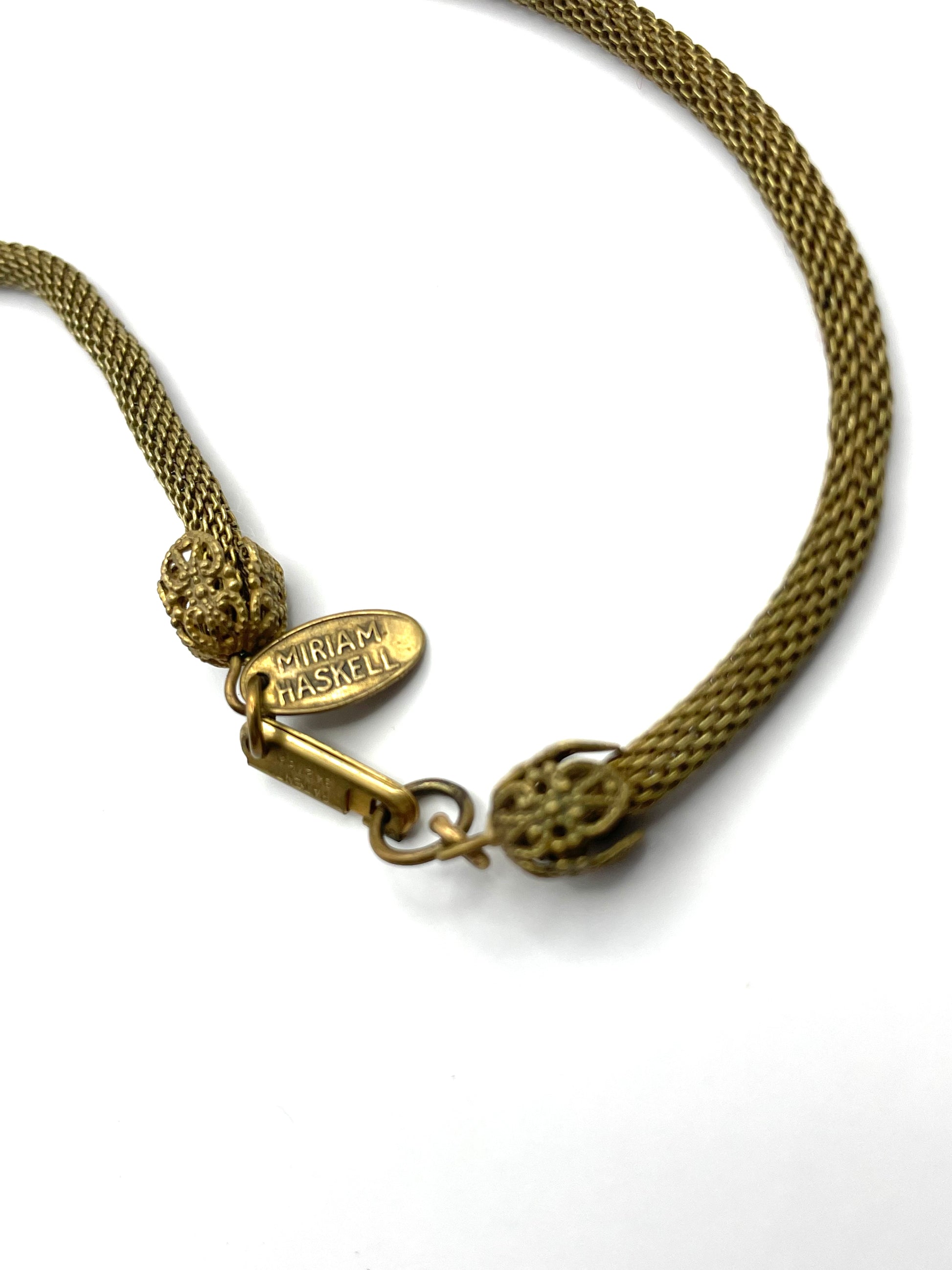 This gorgeous, rare estate piece has a double-sided sphinx figure on both sides, and measures appr 2 7/8" x 2 1/4" From top to bottom measuring 13 5/8". The necklace is decorated with four round polished gemstone beads. Between the two stones are gold-toned sphinx busts. The mesh chain has a round filigree ball at the end and a slide clasp. The clasp and metal tag are embossed "Miriam Haskell" including patent number: 3427681. Please see the detailed attached pictures.