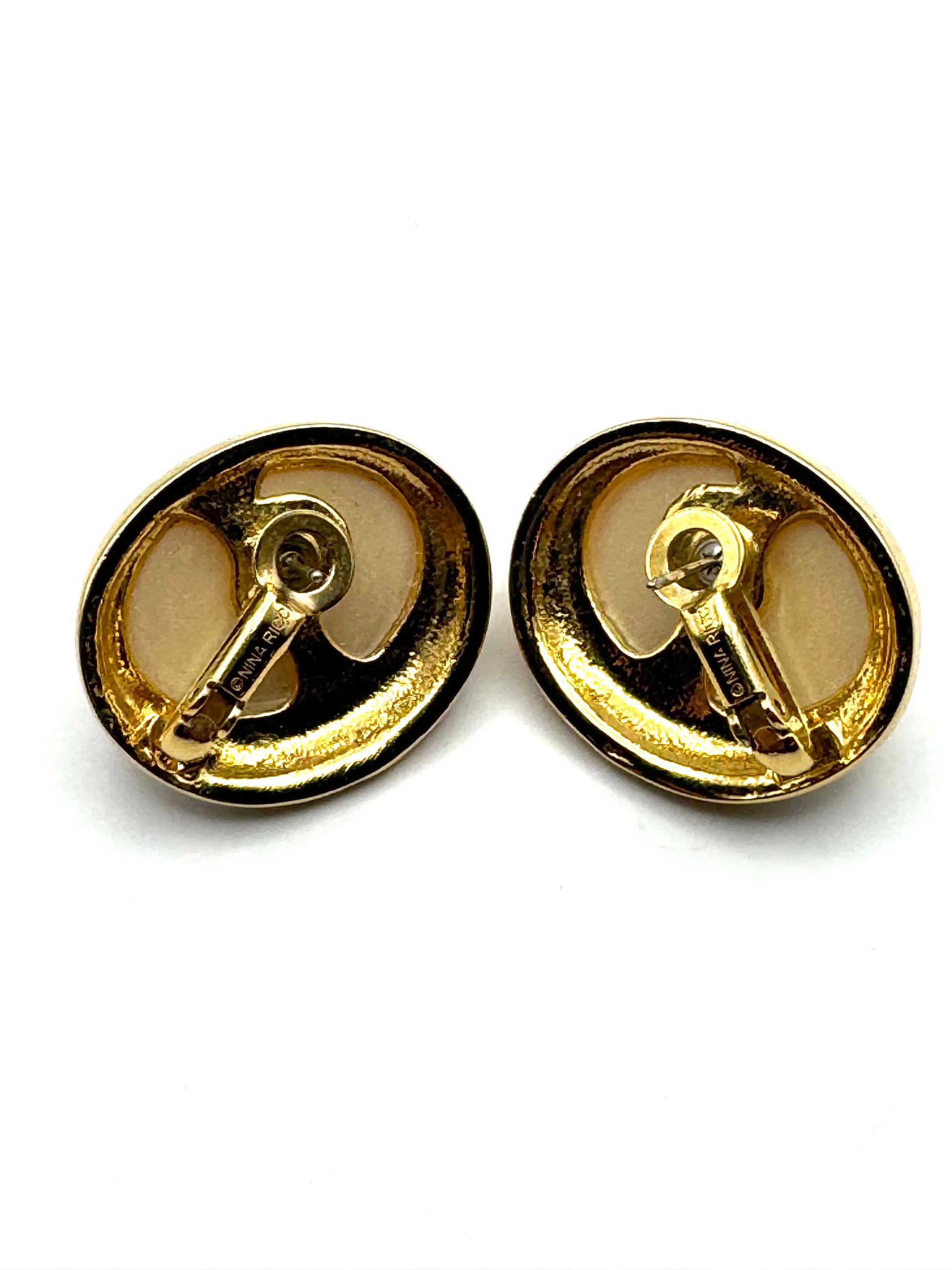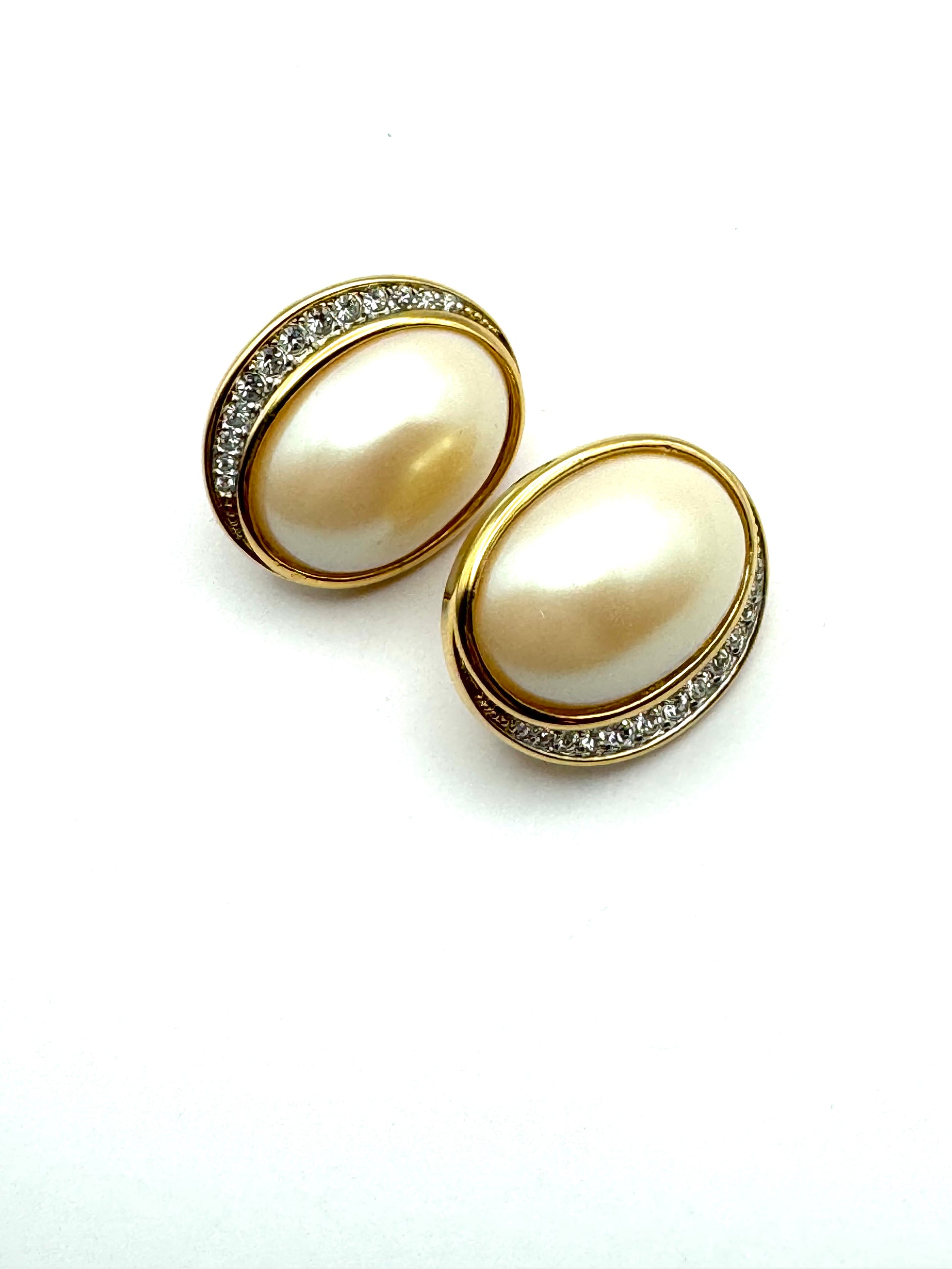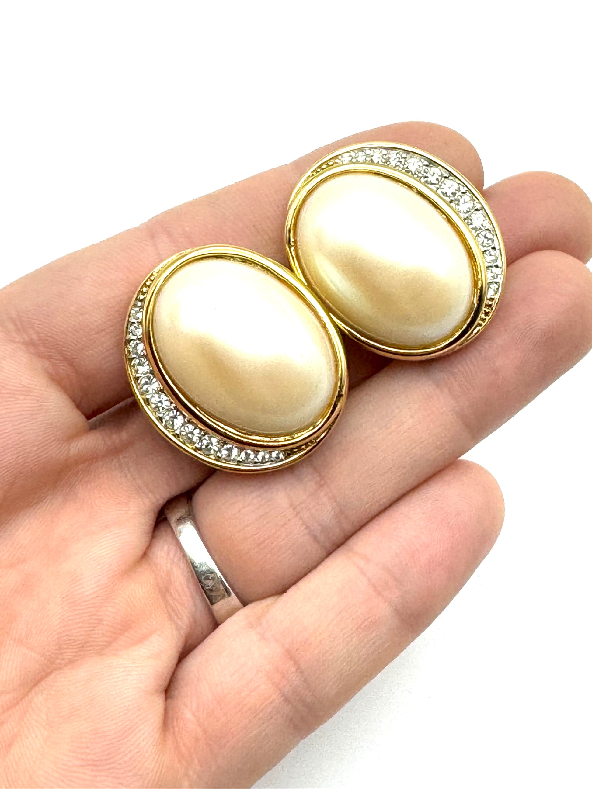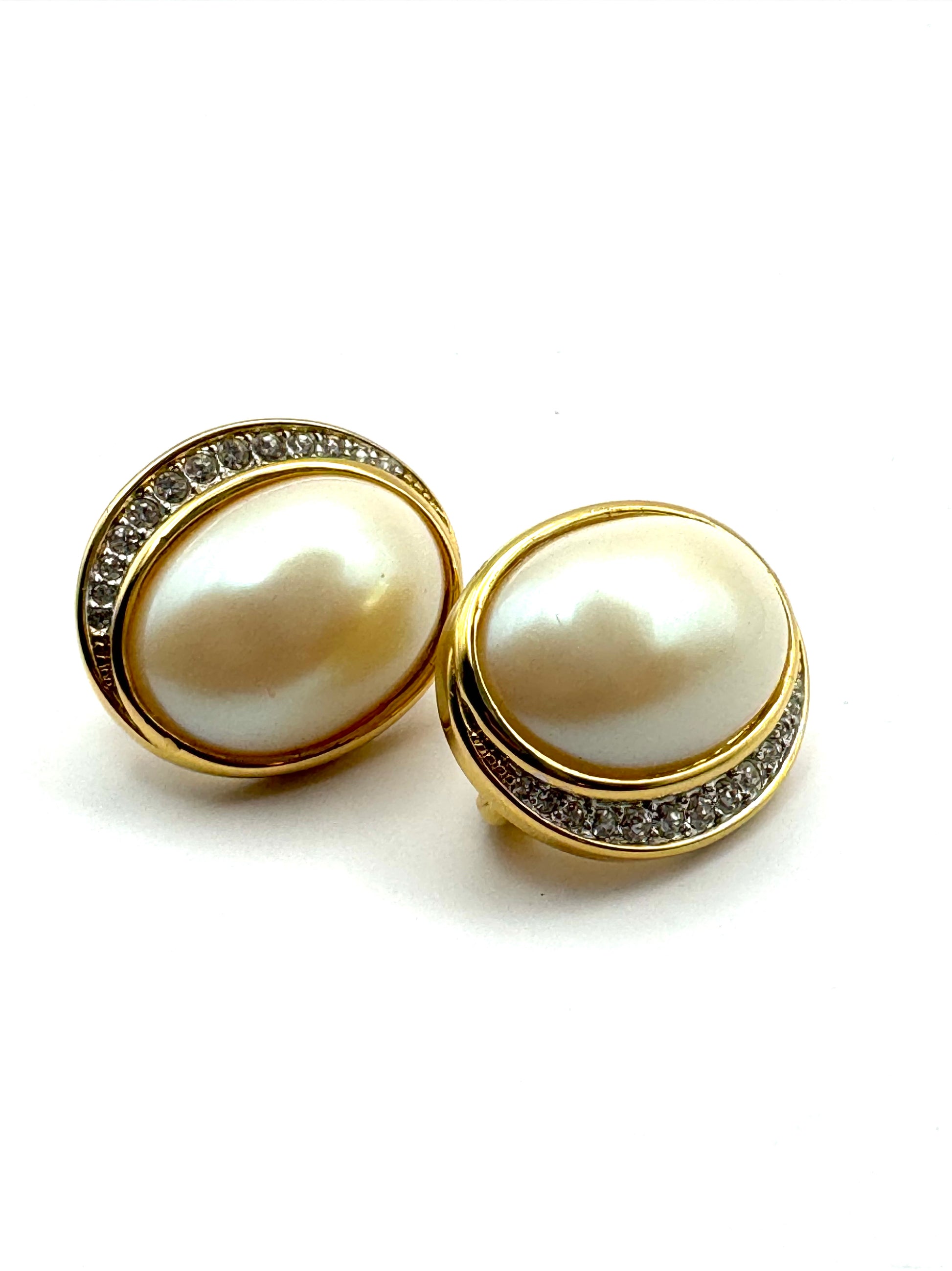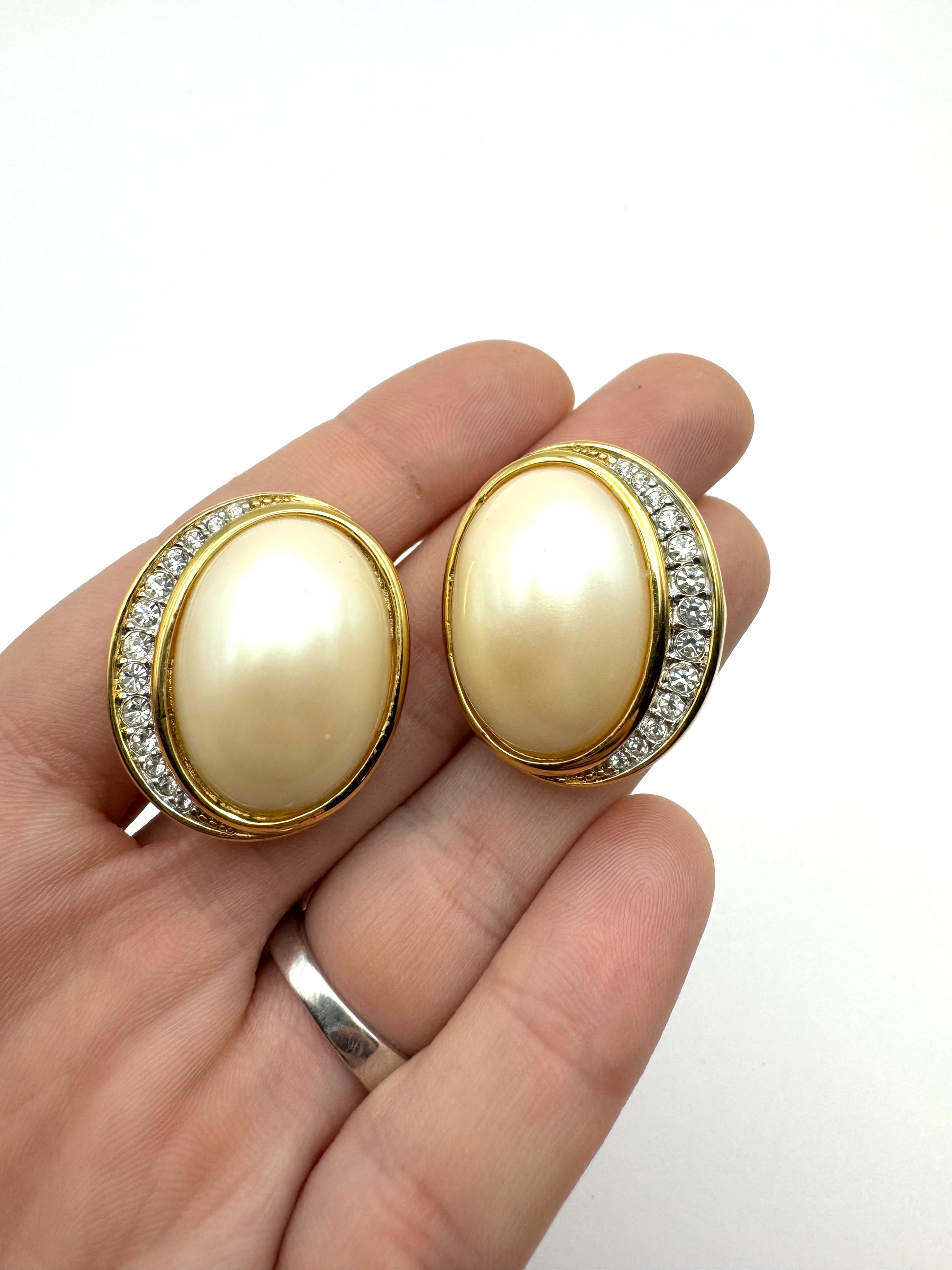 Vintage Nina Ricci Pearl Pave Swarovski Crystal Clip On Earrings