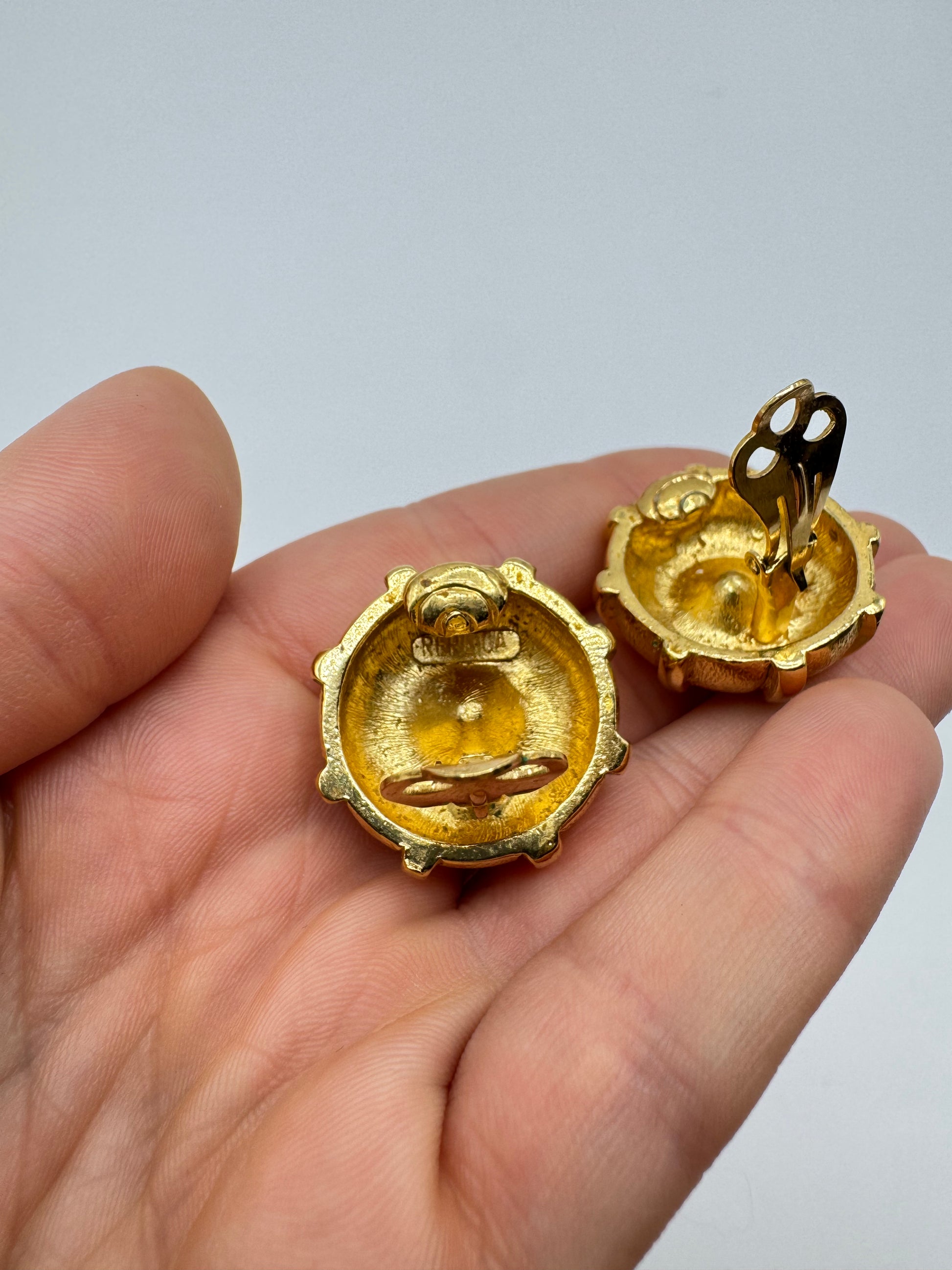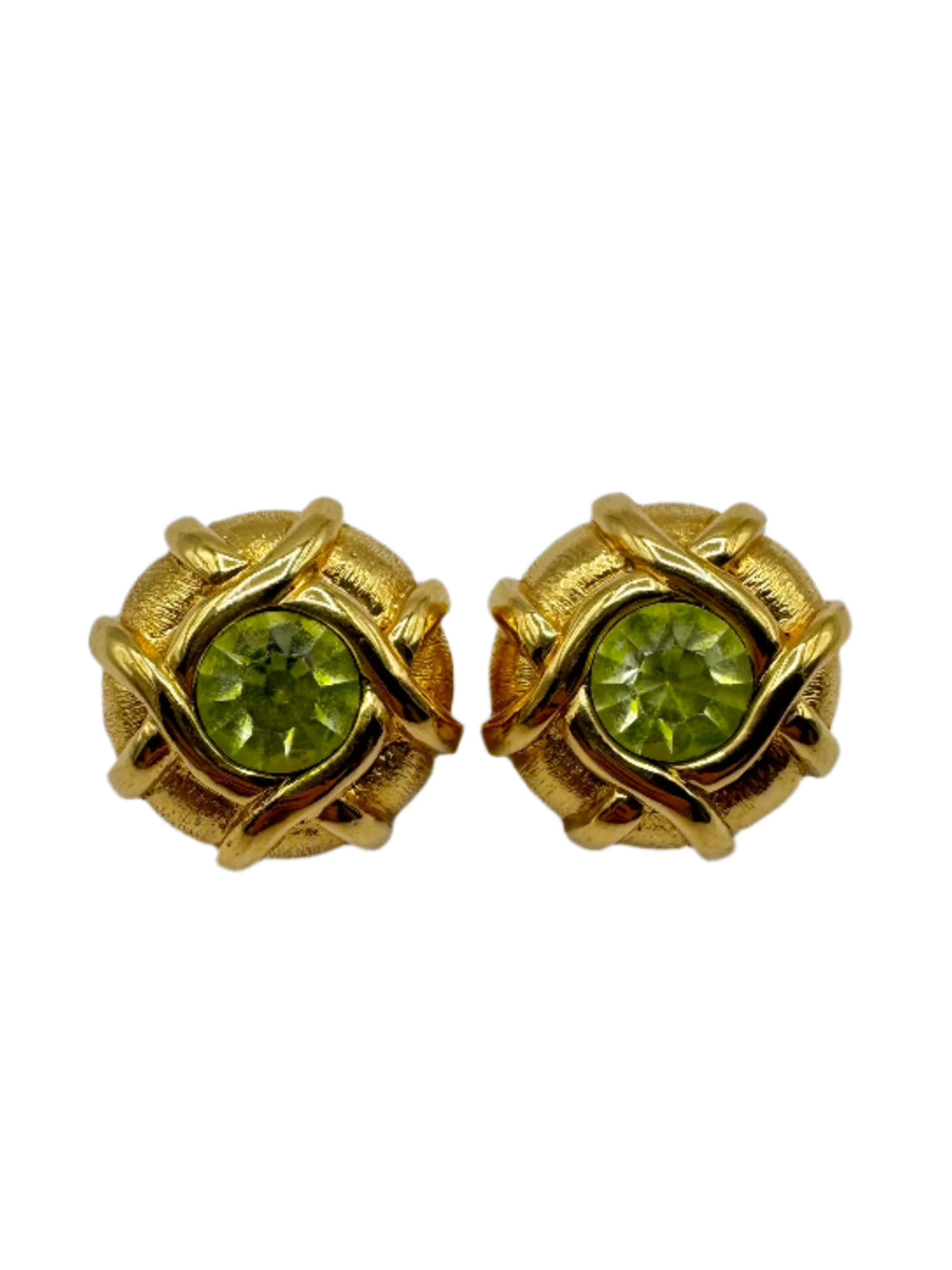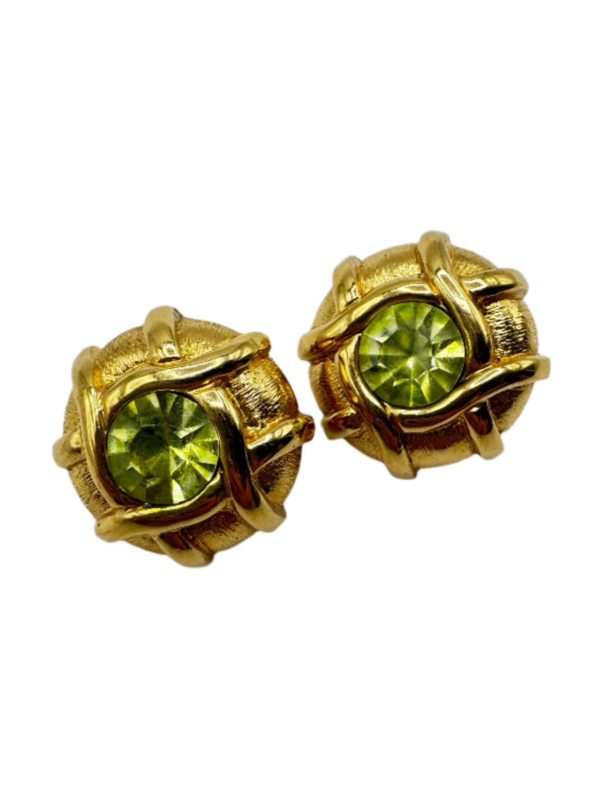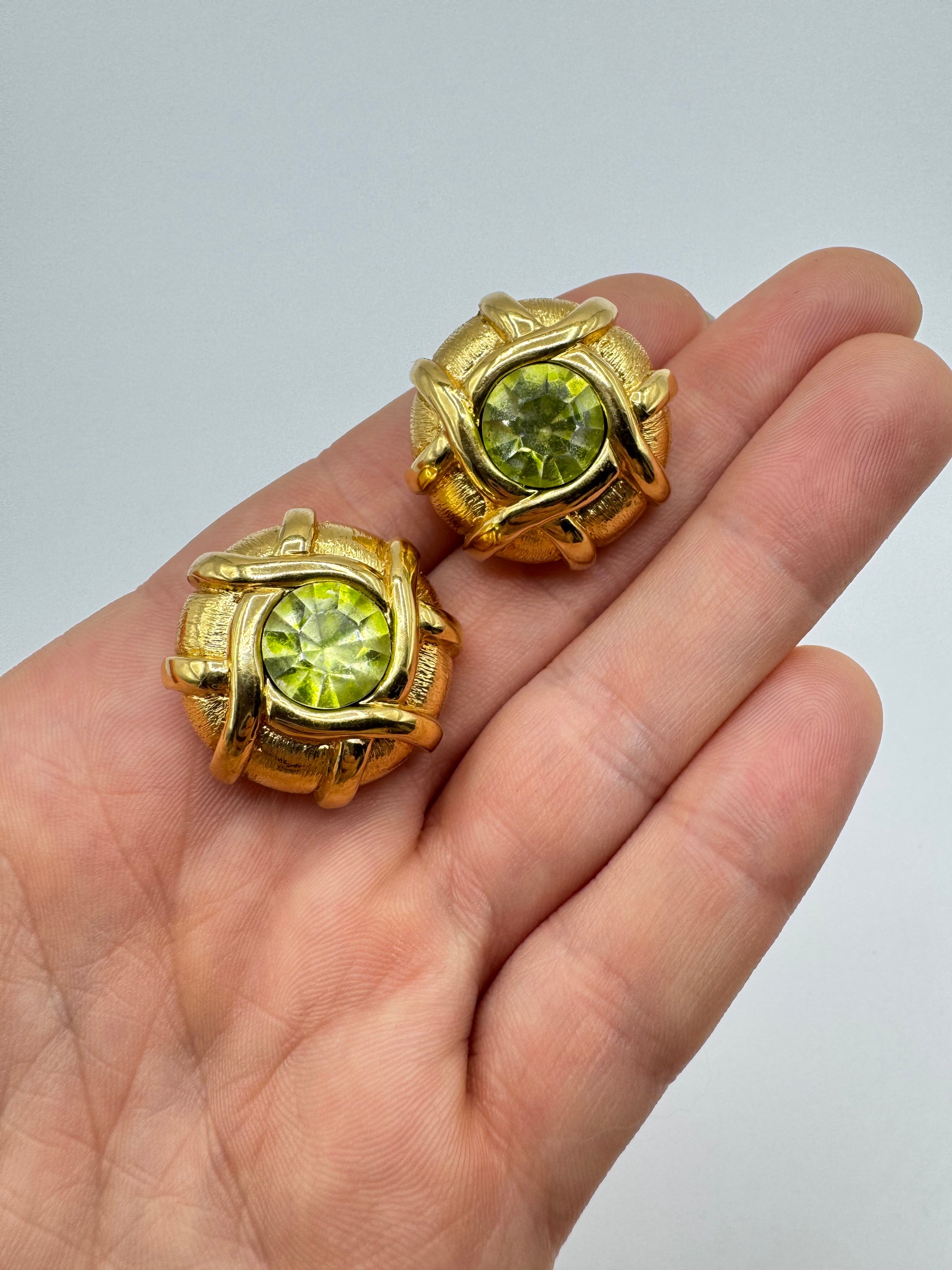A vibrant and sculptural design from Replica, these vintage clip-on earrings feature bold lime green faceted glass cabochons encased in a swirling gold-tone metal wrap. With textured backing and a radiant centerpiece, they are a standout accessory perfect for lovers of statement vintage jewelry.