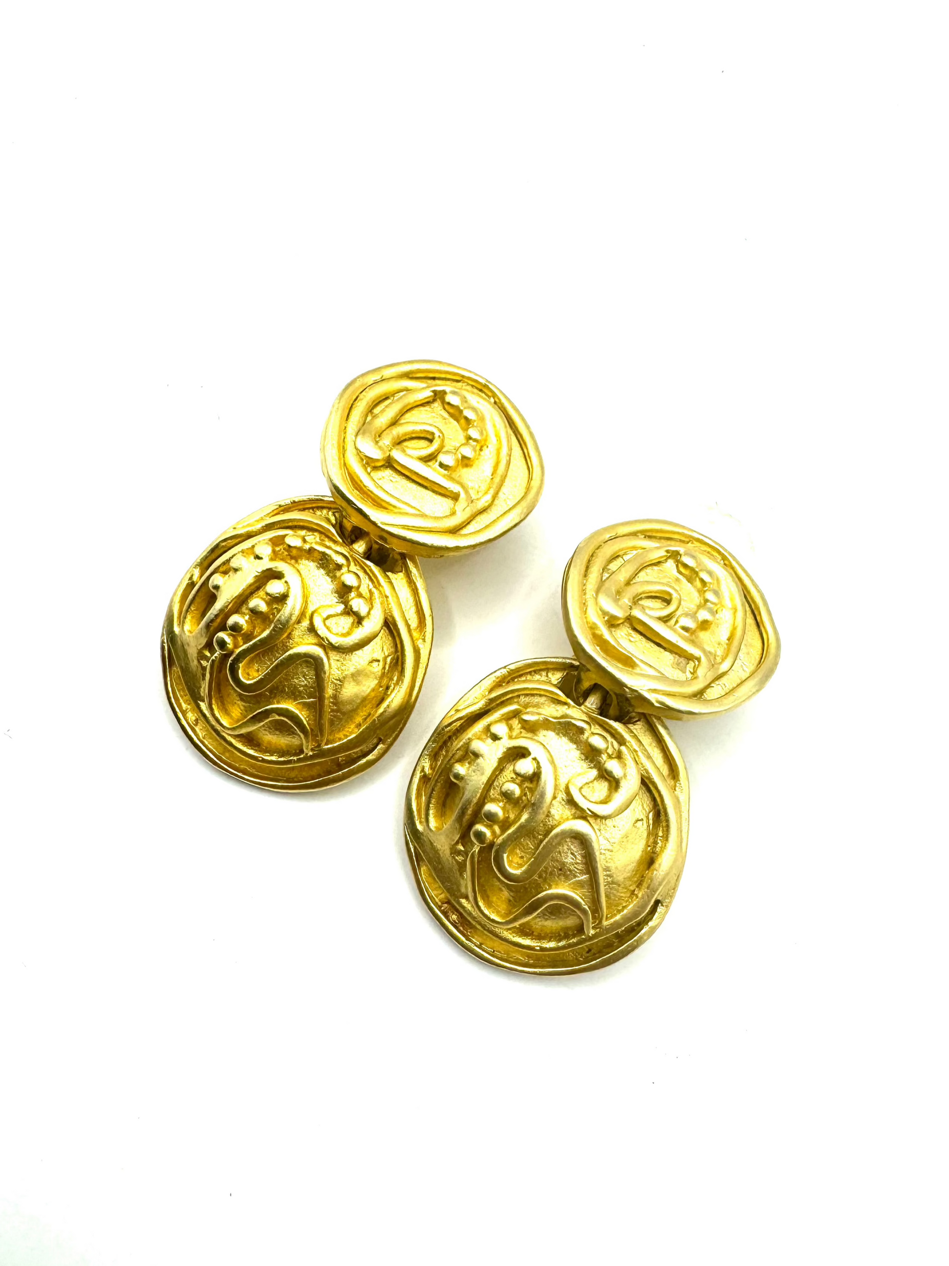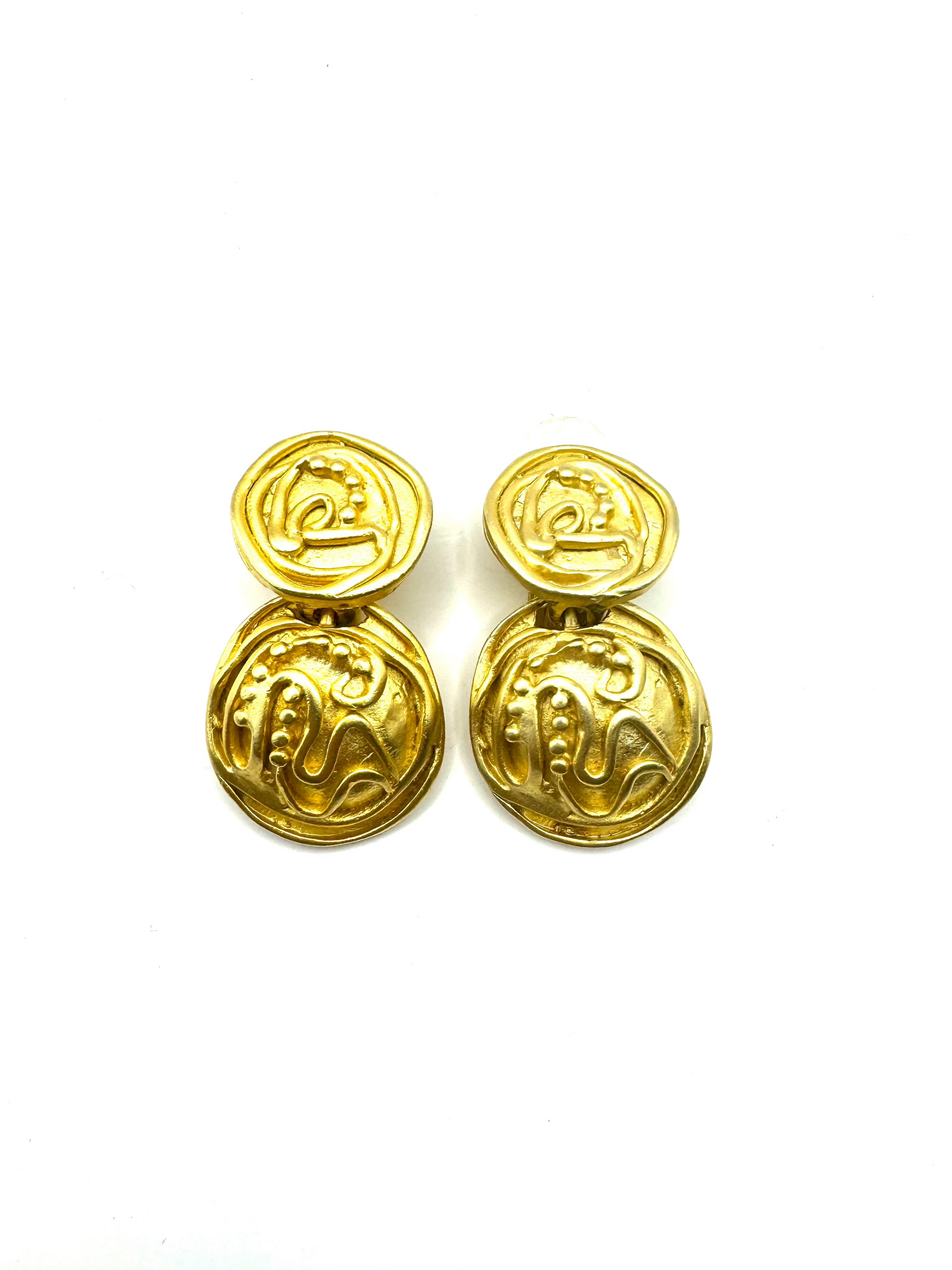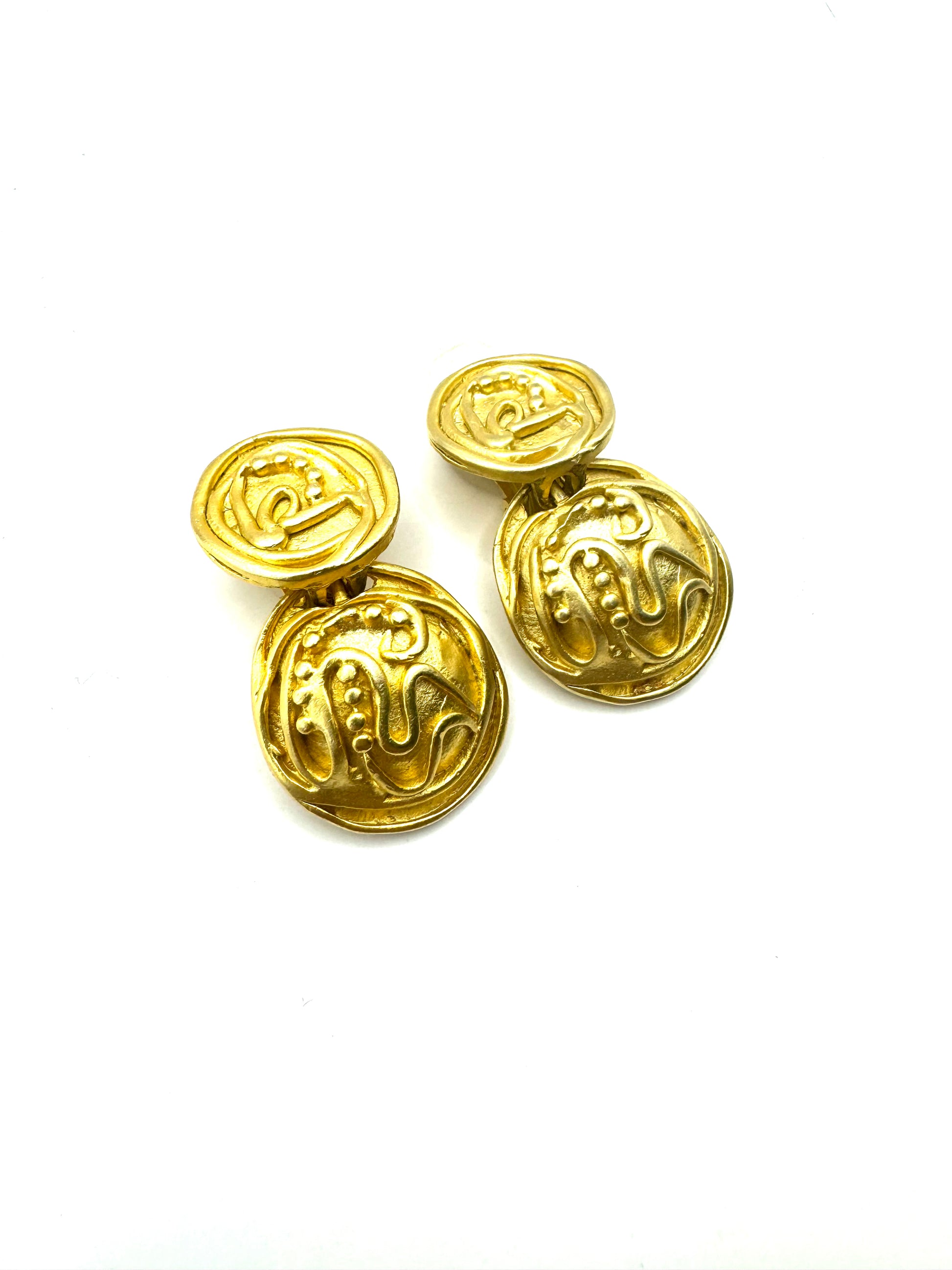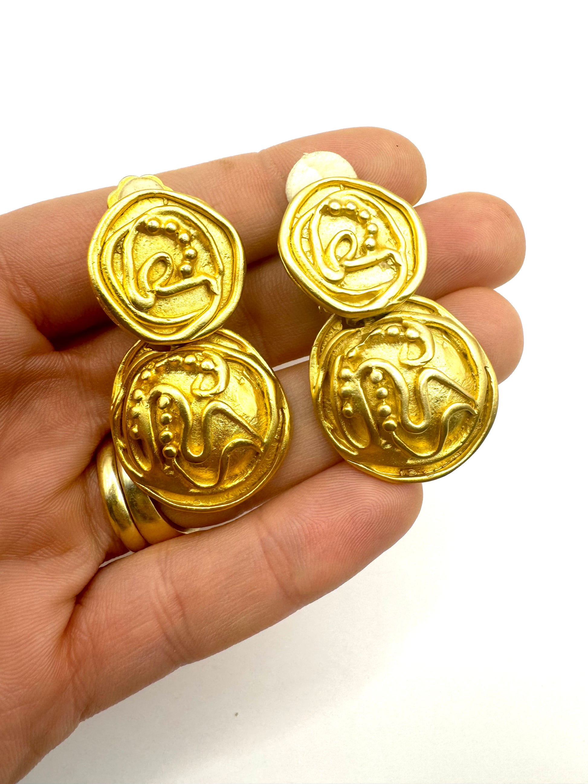 Stunning brushed gold-tone dangling earrings by Norma Jean. Featuring a modernist design and in excellent vintage condition, these earrings are incredibly chic. Perfect for pairing with blazers for an elevated everyday look or complementing your elegance at evening events. The original padding has been left intact, ensuring the earrings sit perfectly on the ear as designed.