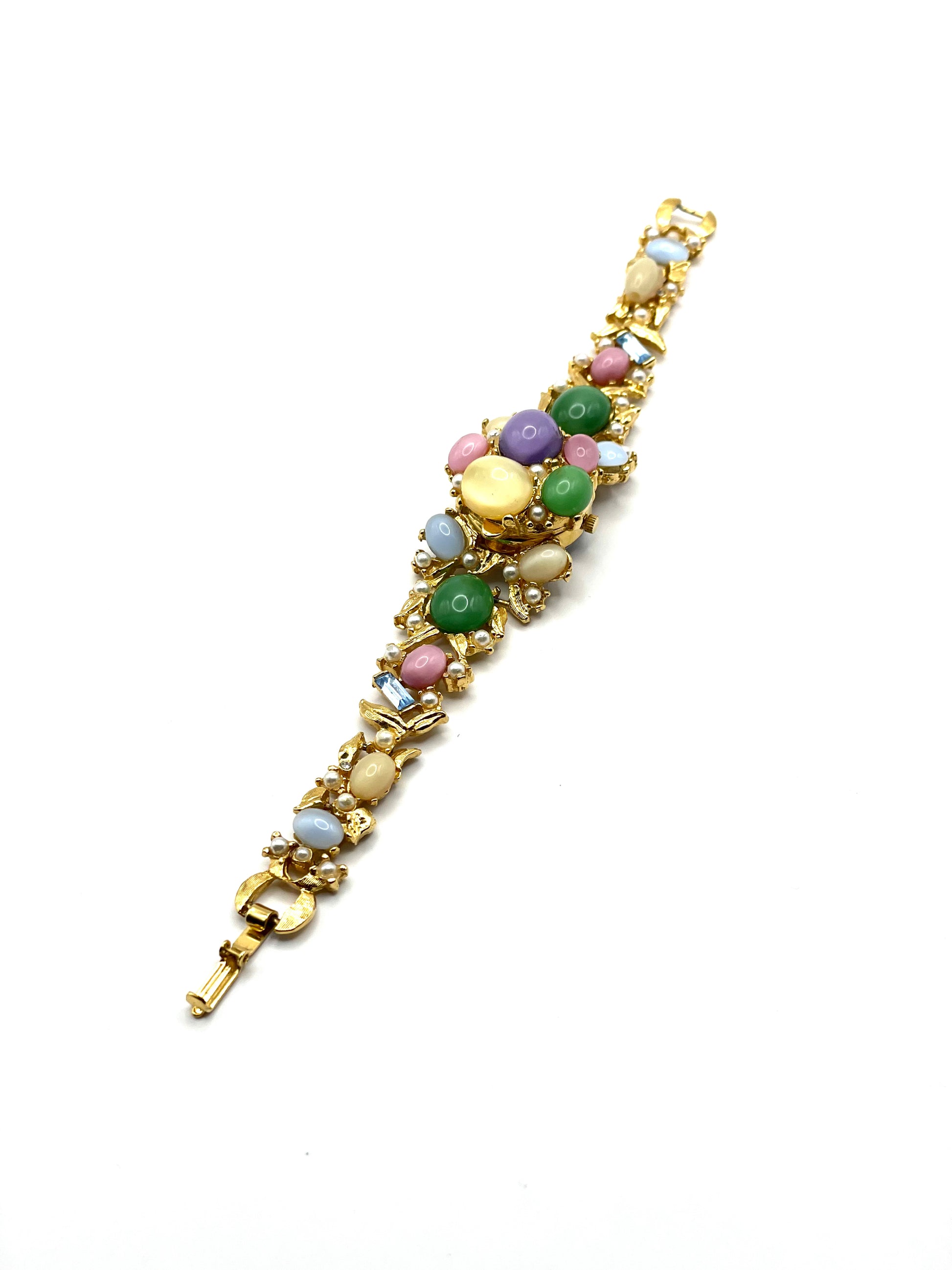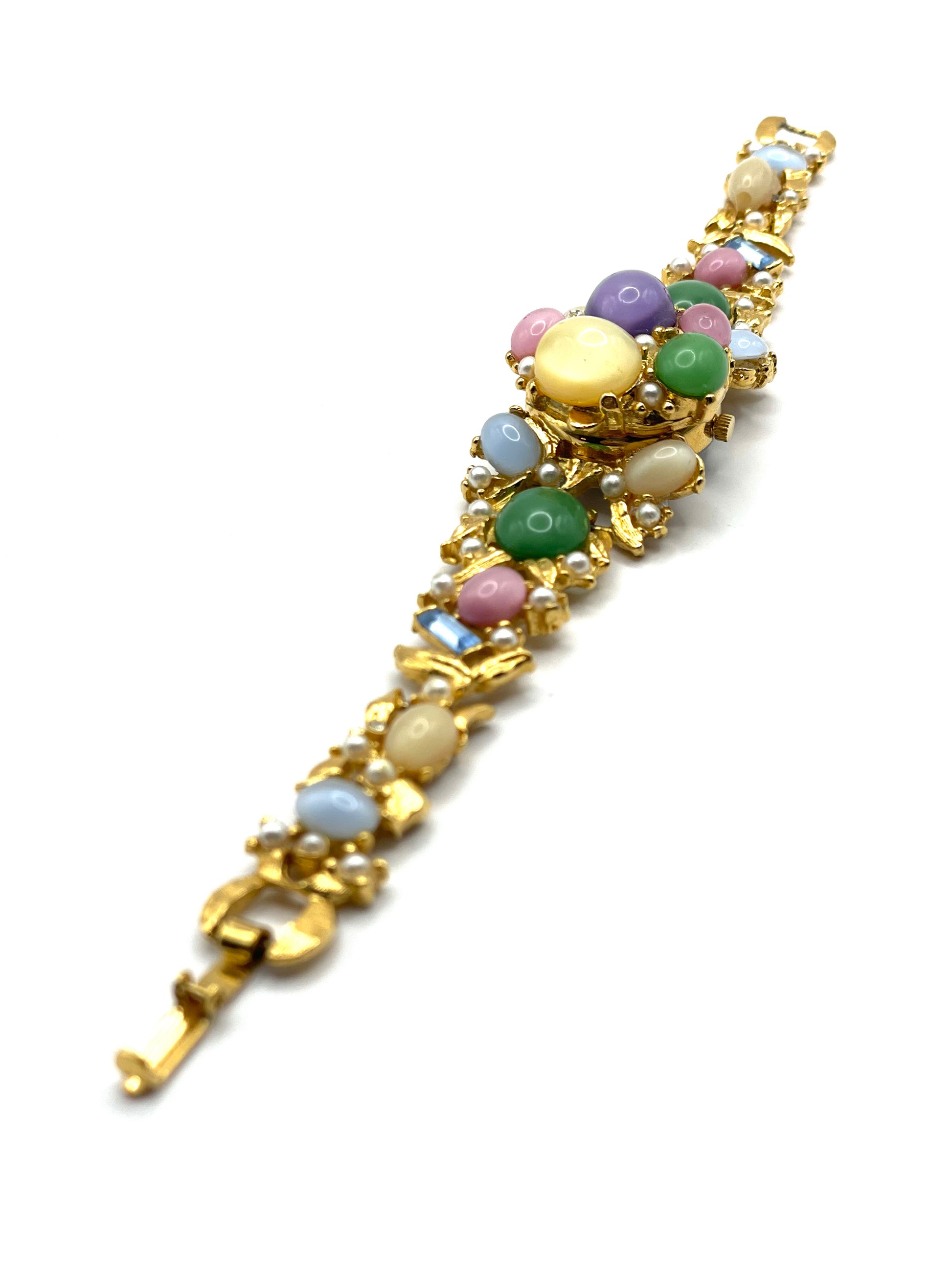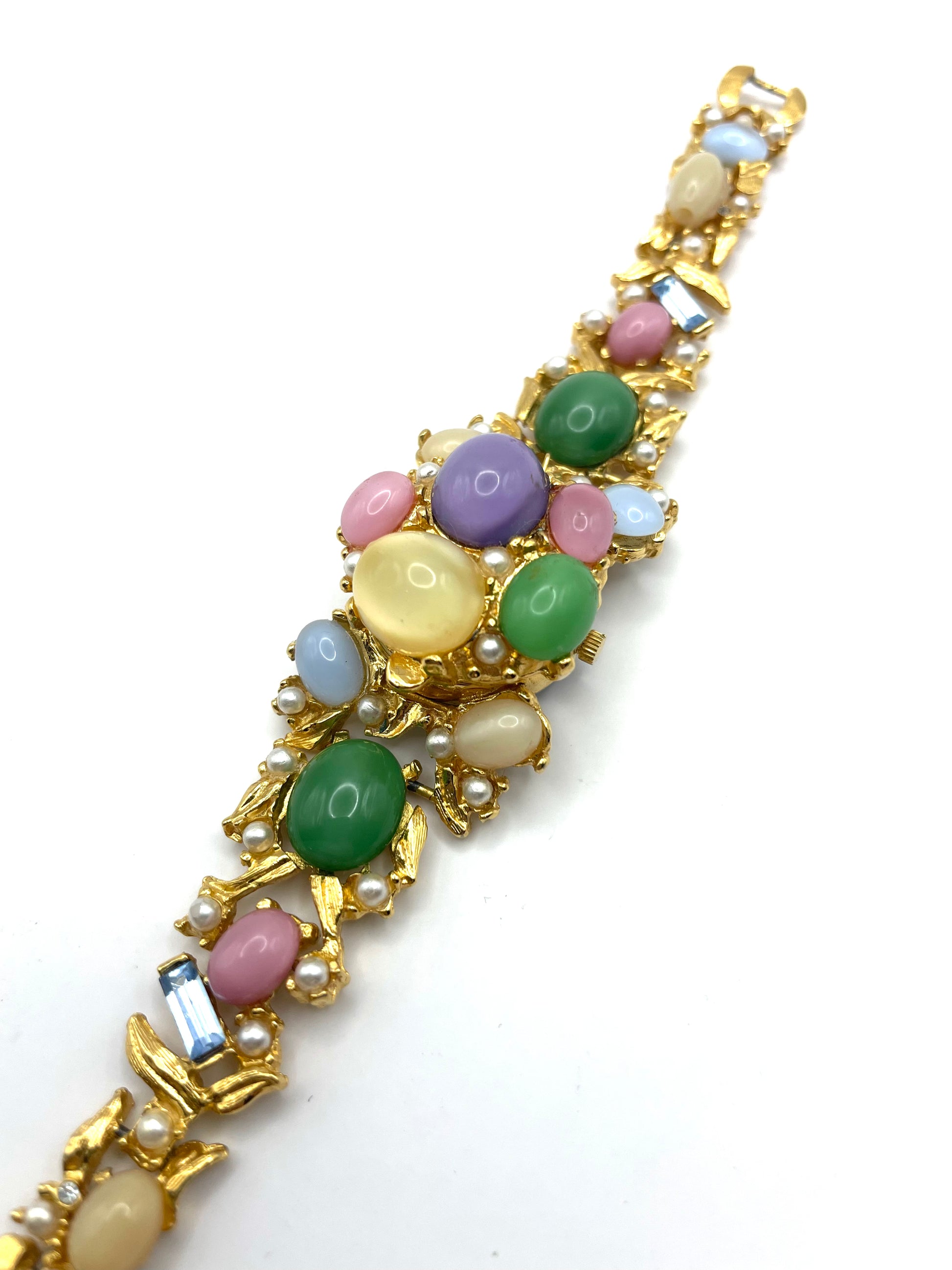 Spectacular piece. Covered with moonstone cabochons, faux seed pearls, and baguette cut blue glasses. No missing stones, in excellent vintage condition. Foldover clasp working perfectly