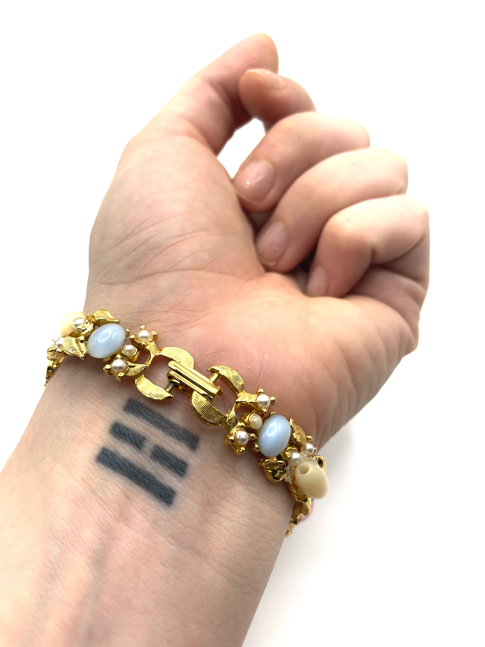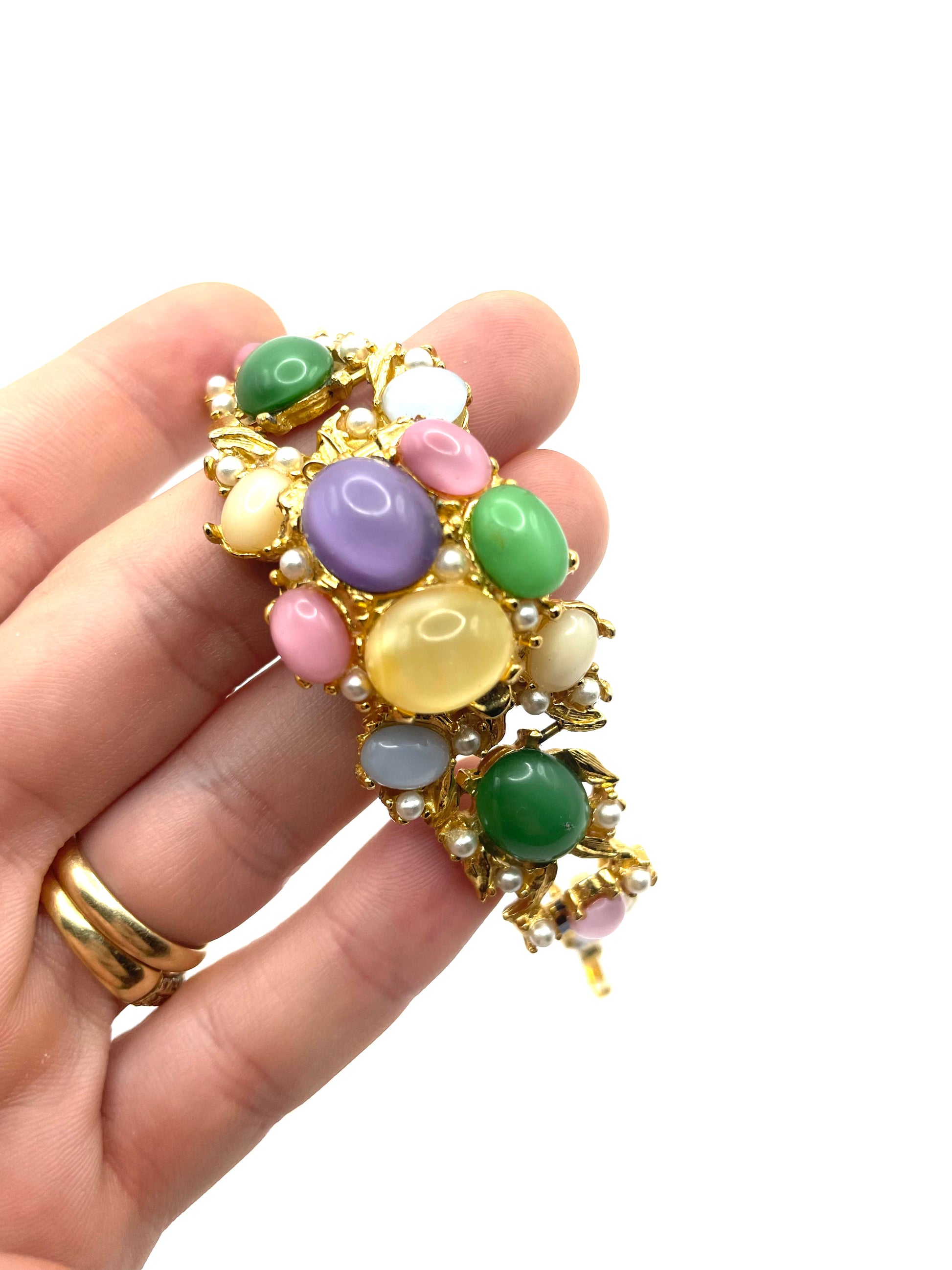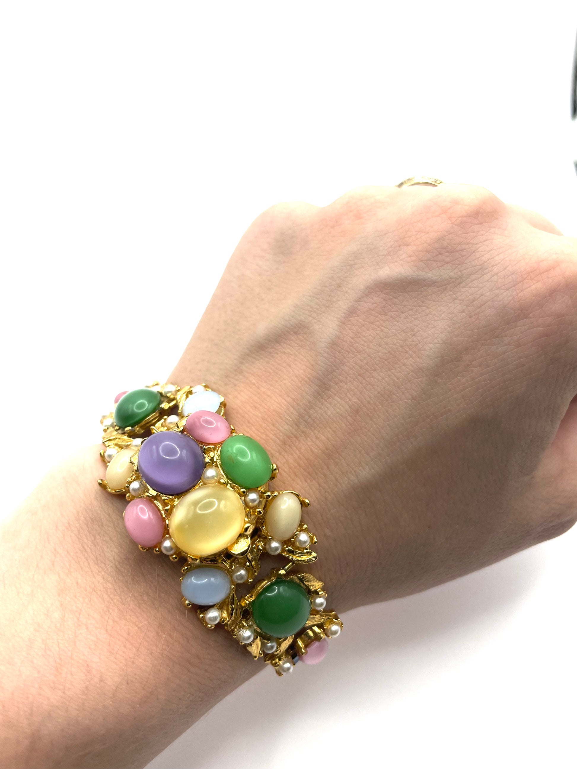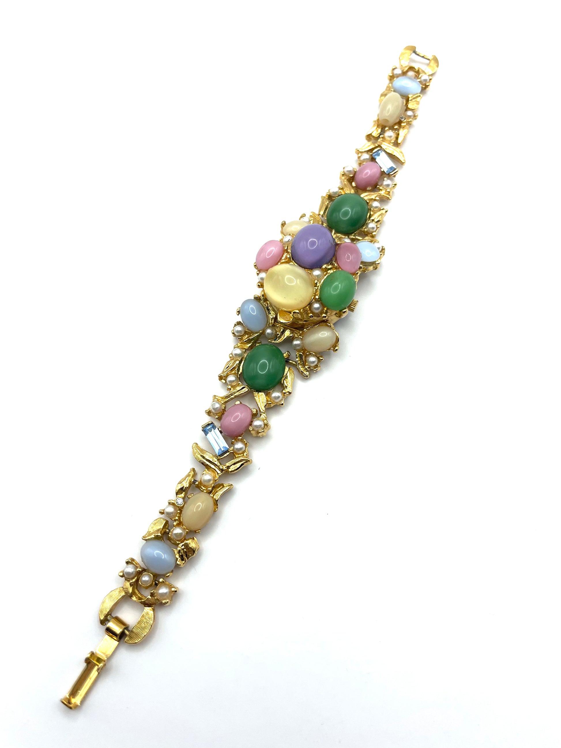 Spectacular piece. Covered with moonstone cabochons, faux seed pearls, and baguette cut blue glasses. No missing stones, in excellent vintage condition. Foldover clasp working perfectly