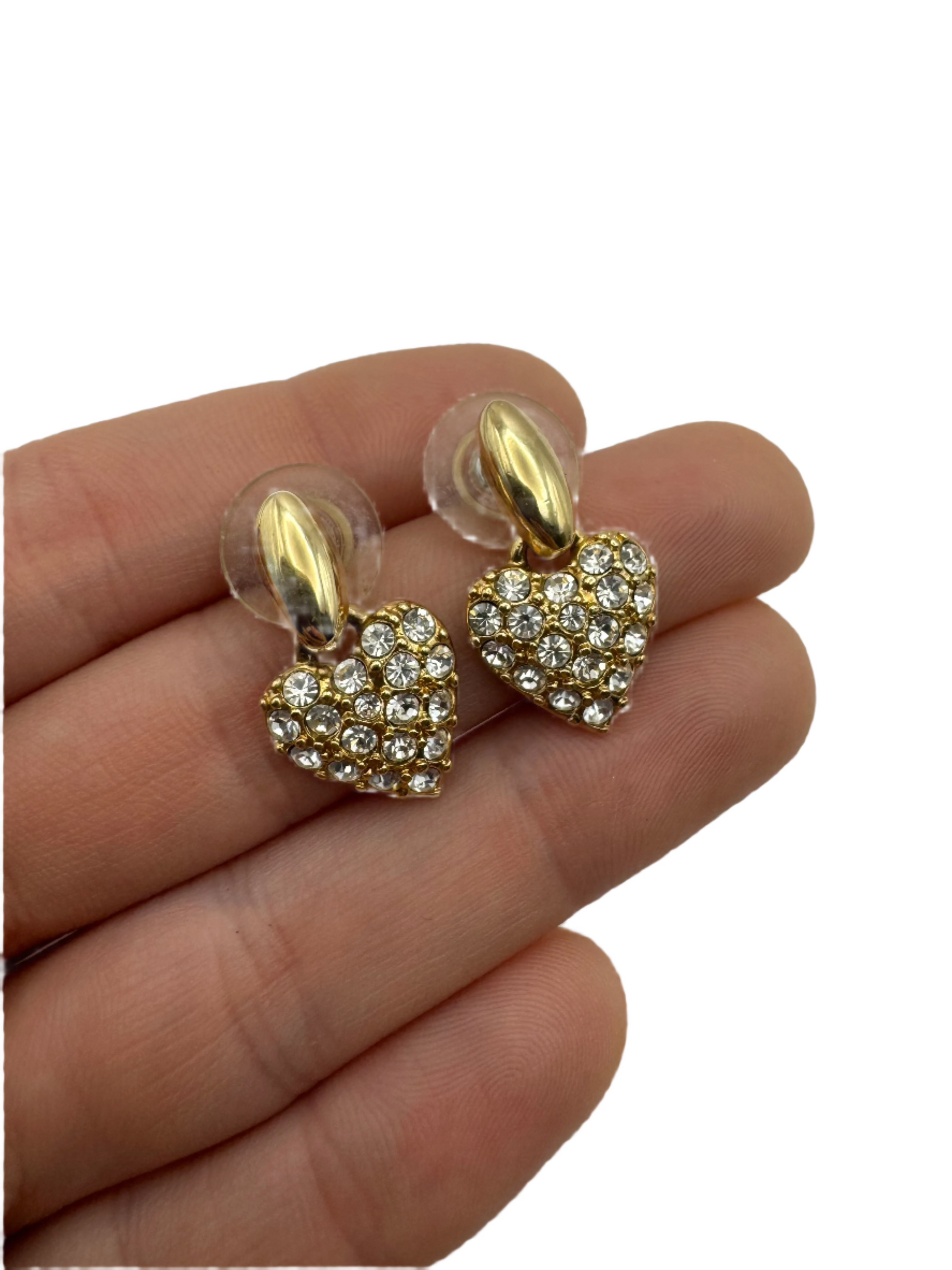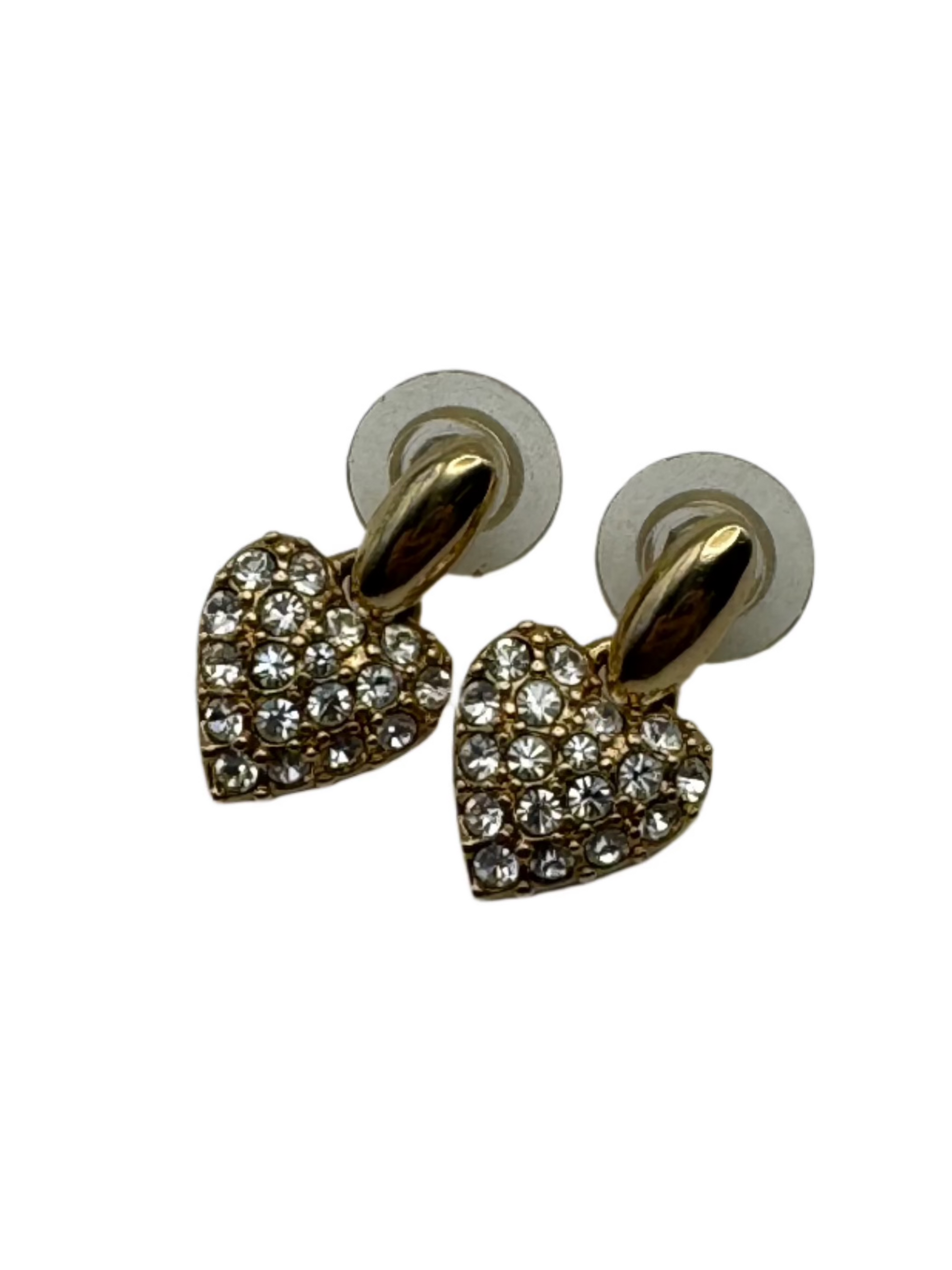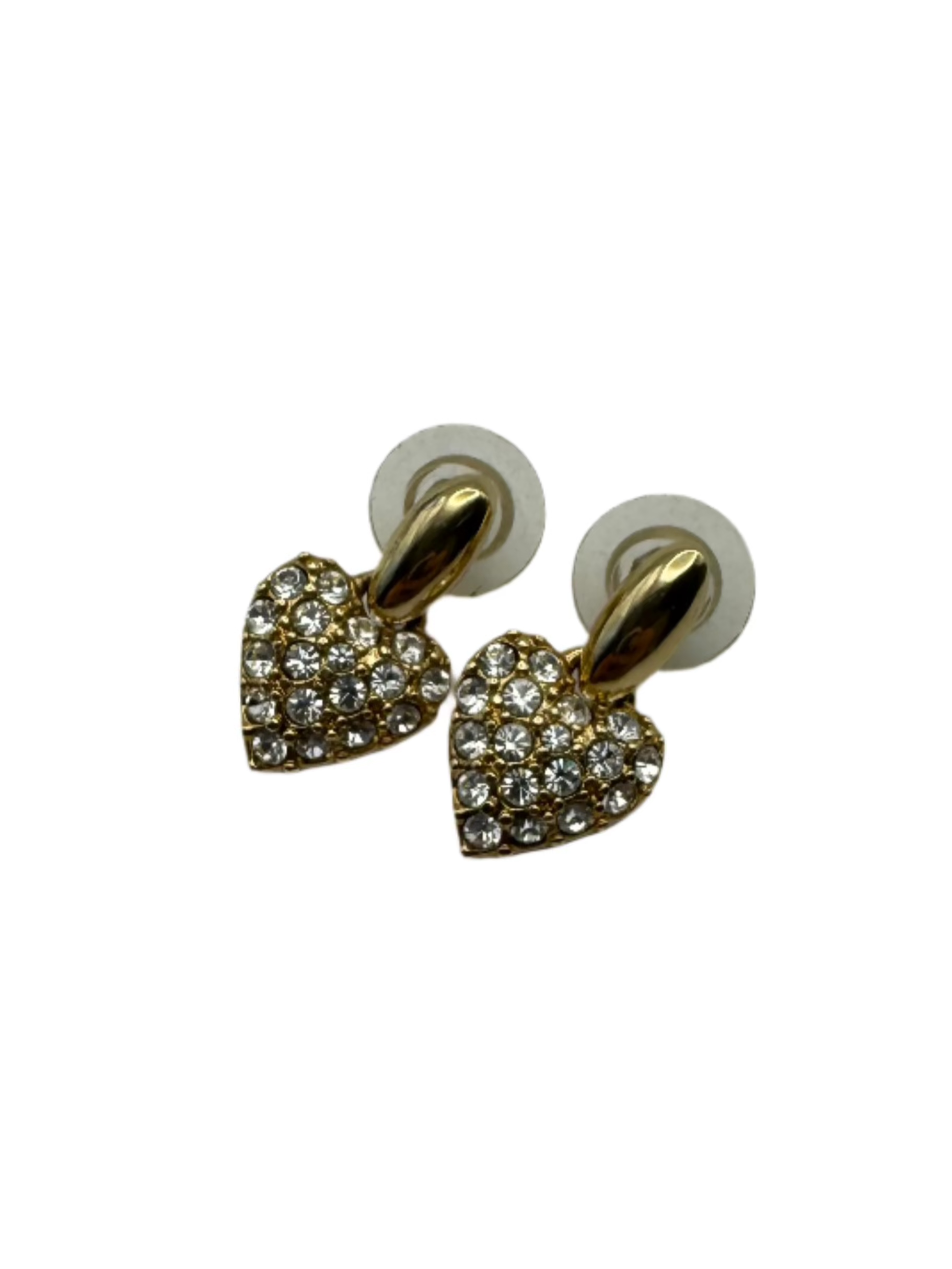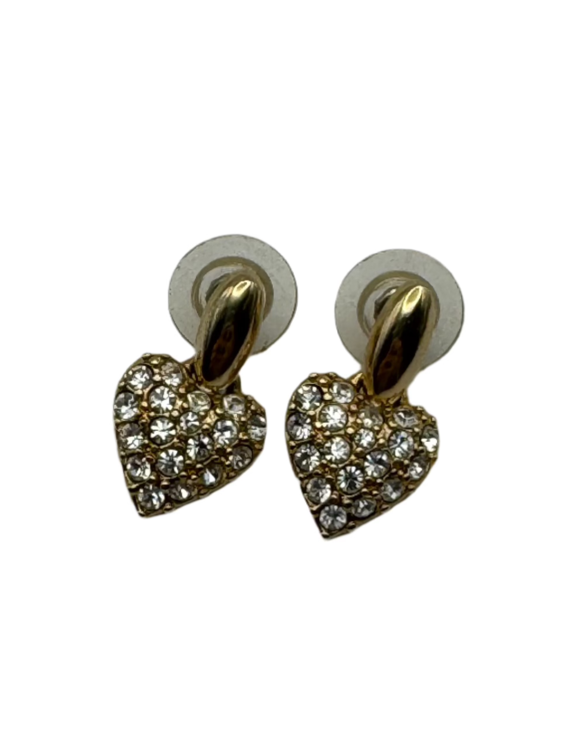 These charming vintage Swarovski earrings feature sparkling pavé-set clear crystals in heart-shaped drops suspended from sleek gold-tone studs. Elegant and playful, they carry the iconic Swarovski swan logo on the back—indicating production from the late 1980s to 1990s. Perfect for collectors or anyone who loves romantic, high-quality vintage sparkle.