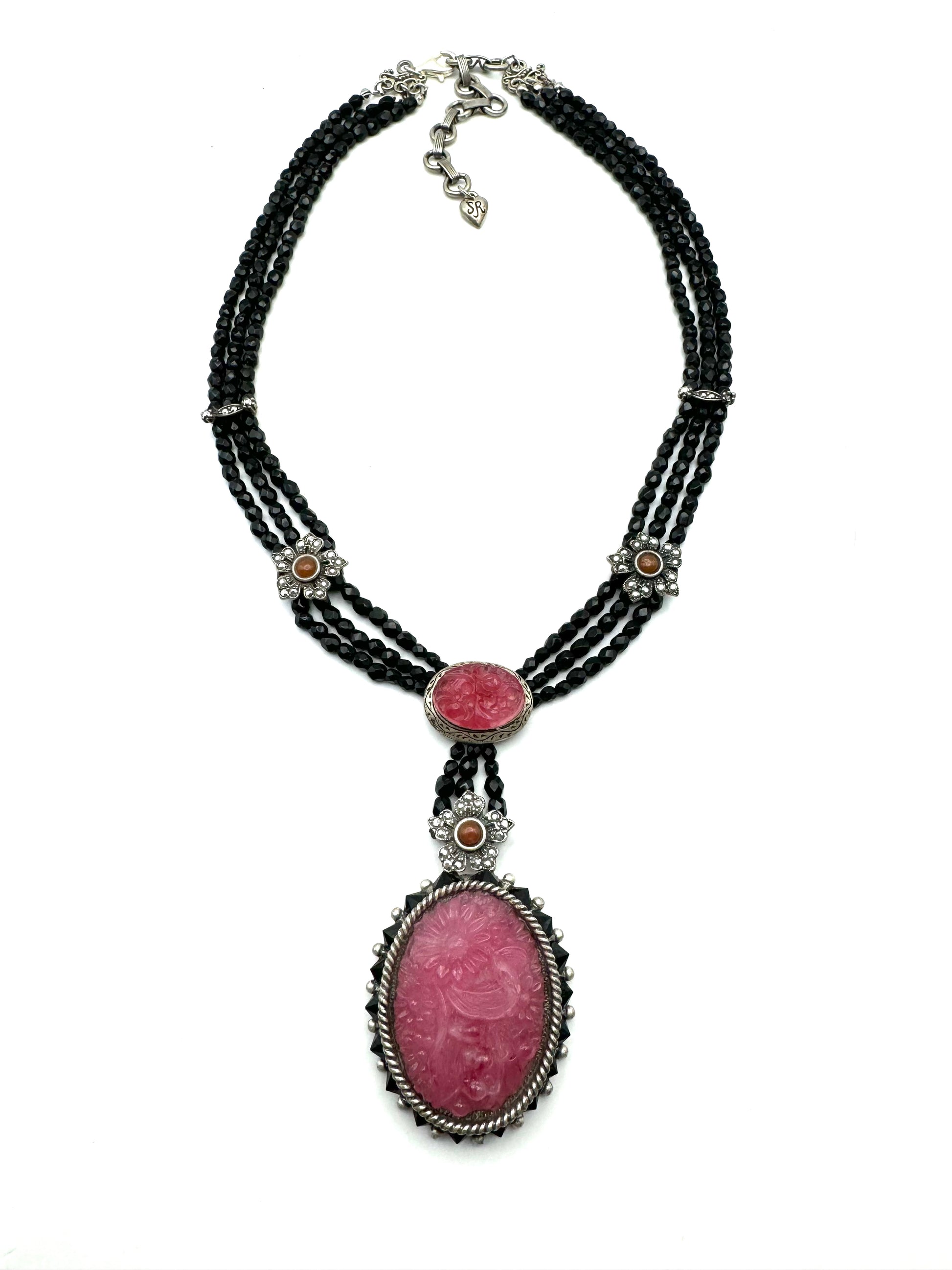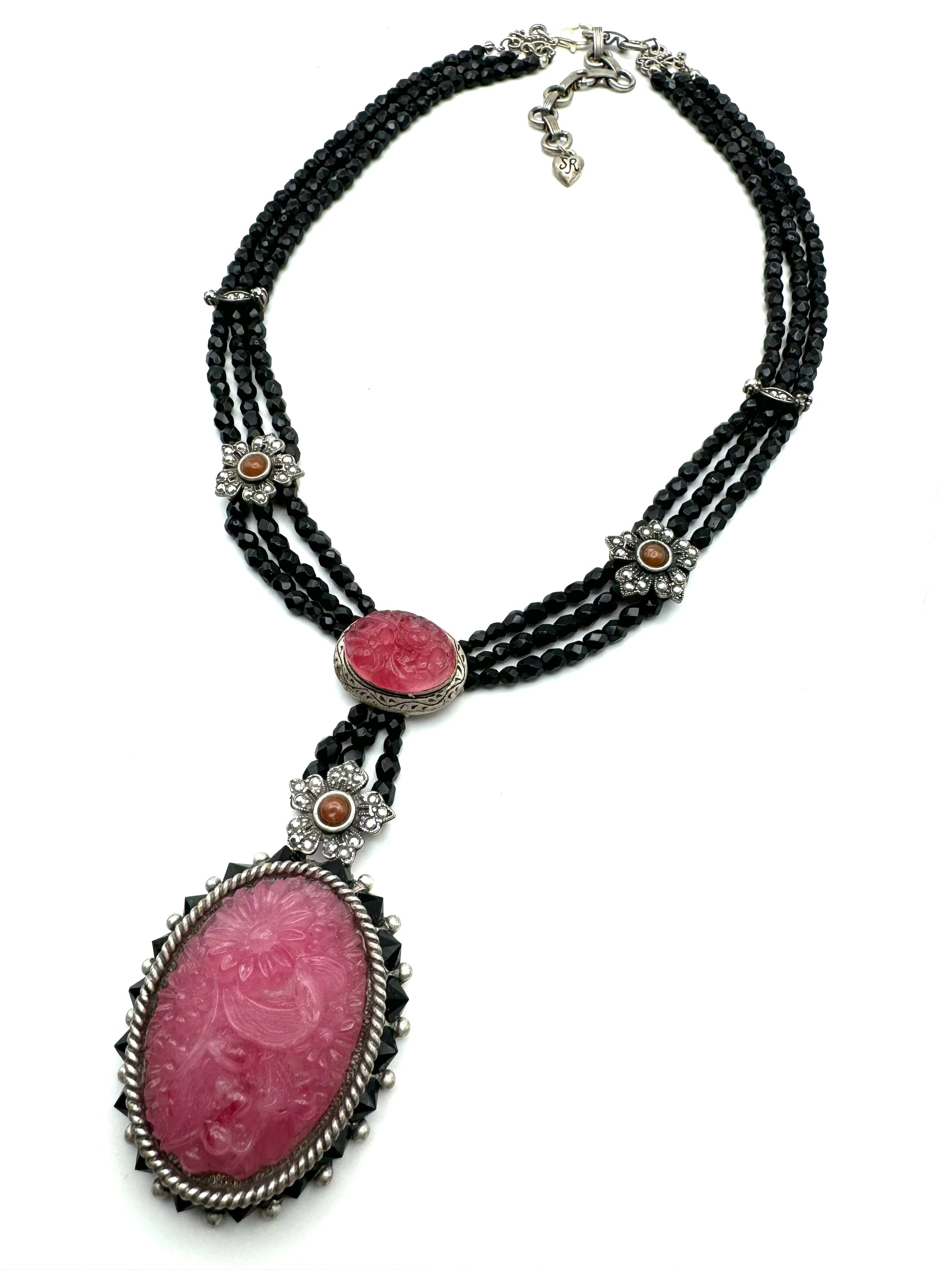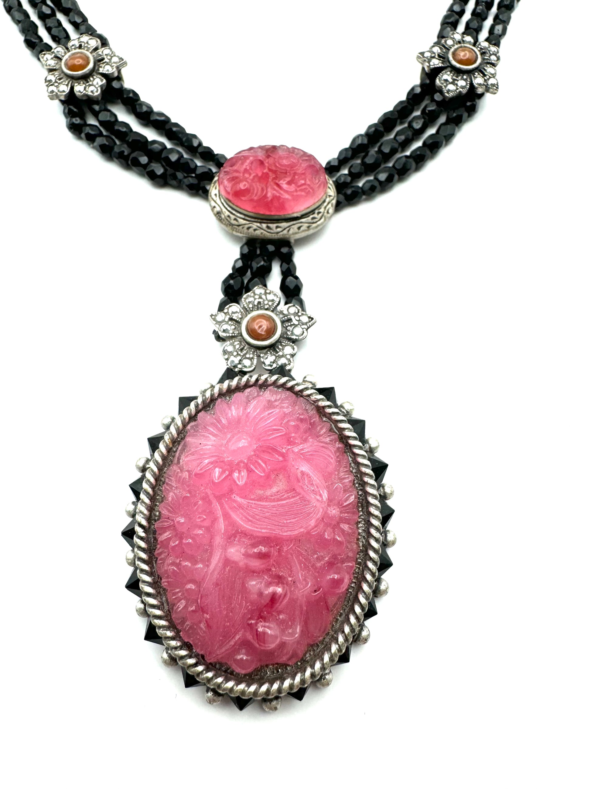 "Demure and totally Art Deco in form, color and elements...Three strands of faceted jet beads create a gently draped 'Y' silhouette. The two glass floral ovals are gorgeous vintage elements circa 1930s. They were created to appear as carved rose quartz, with detail in high relief and mottled coloration. The large oval rests in an open setting with a border of jet crystal and hematite flower. Exquisite, detailed metalwork, layered in burnished sterling silver, brings this design to life."