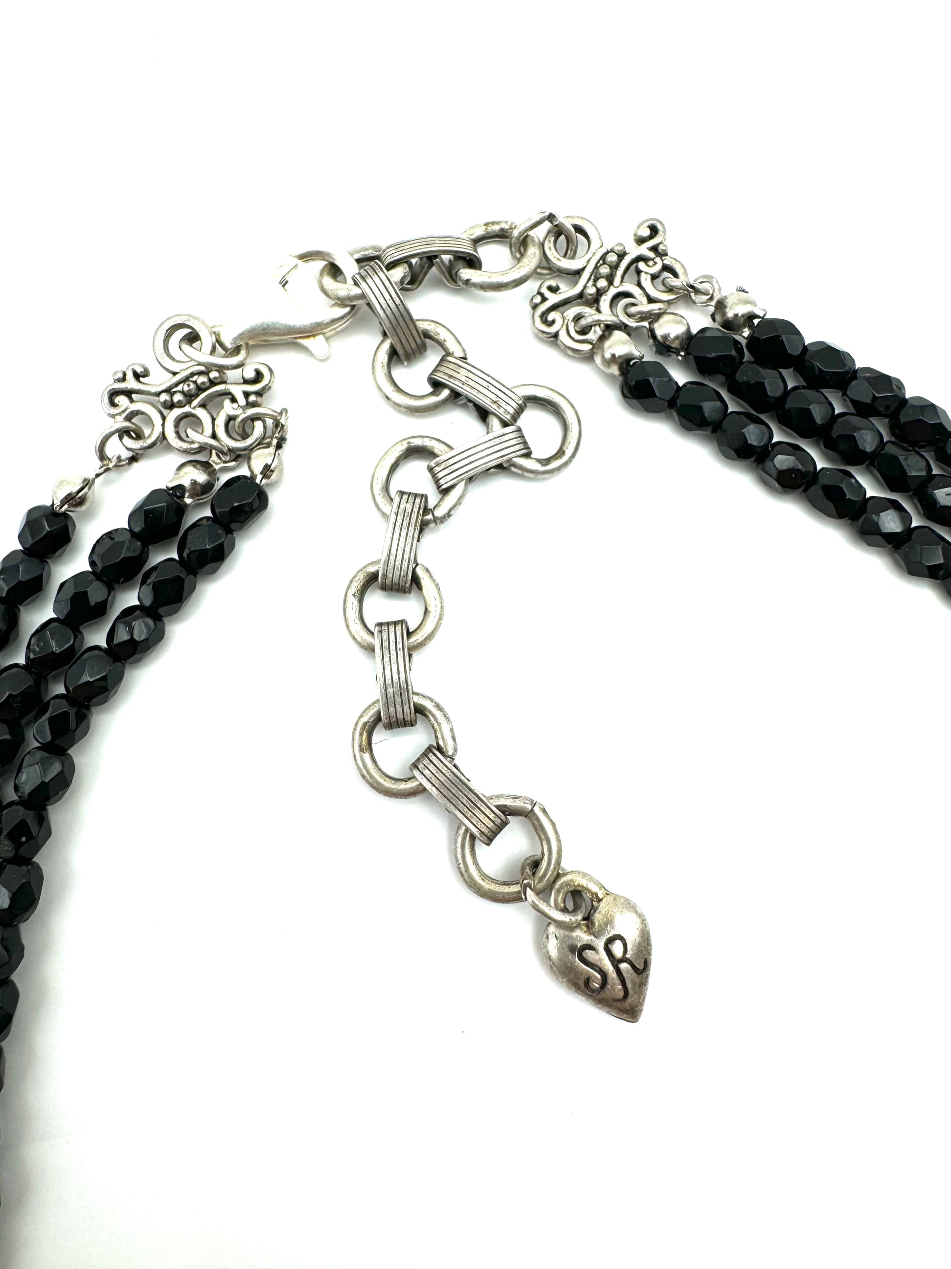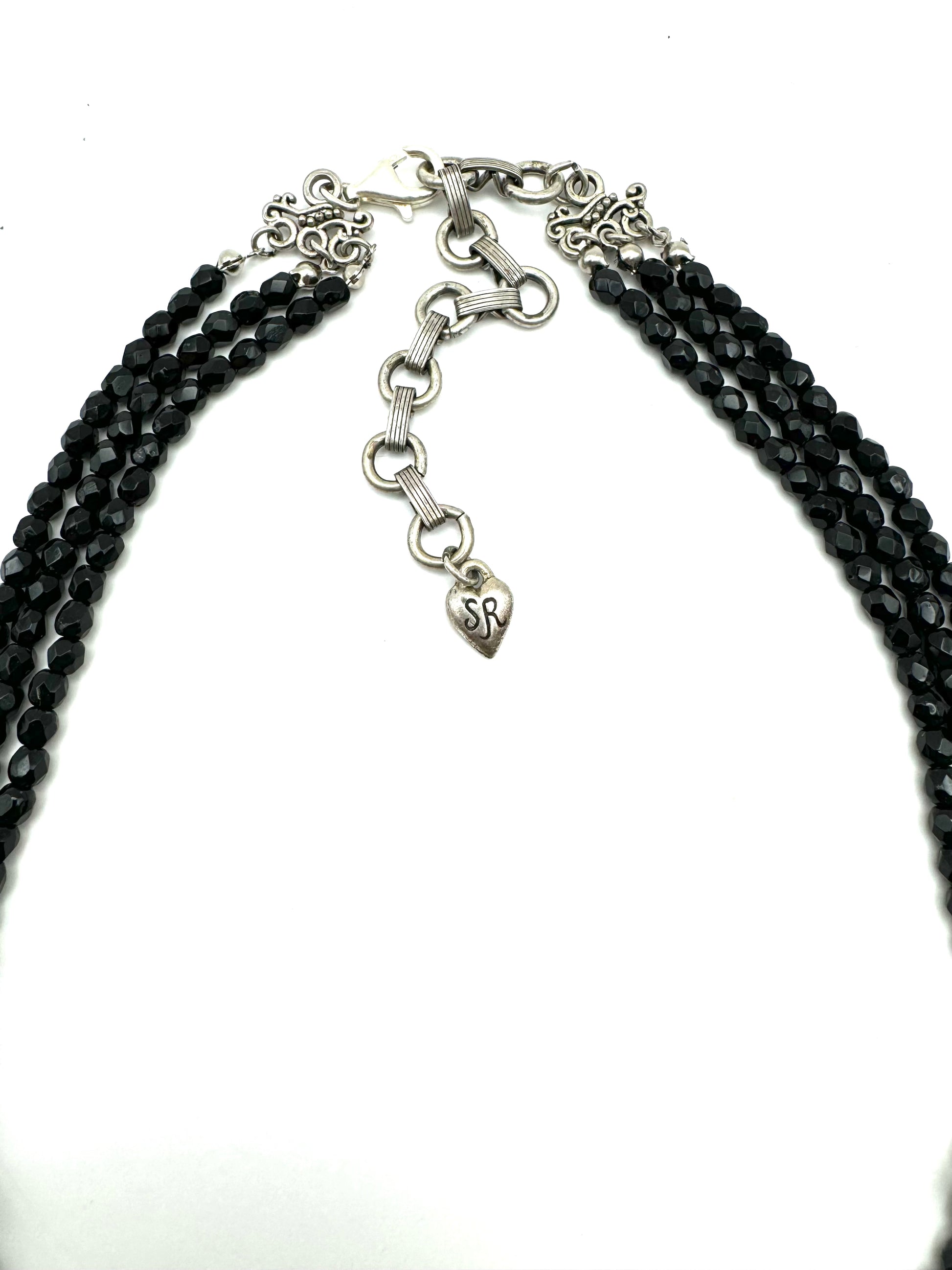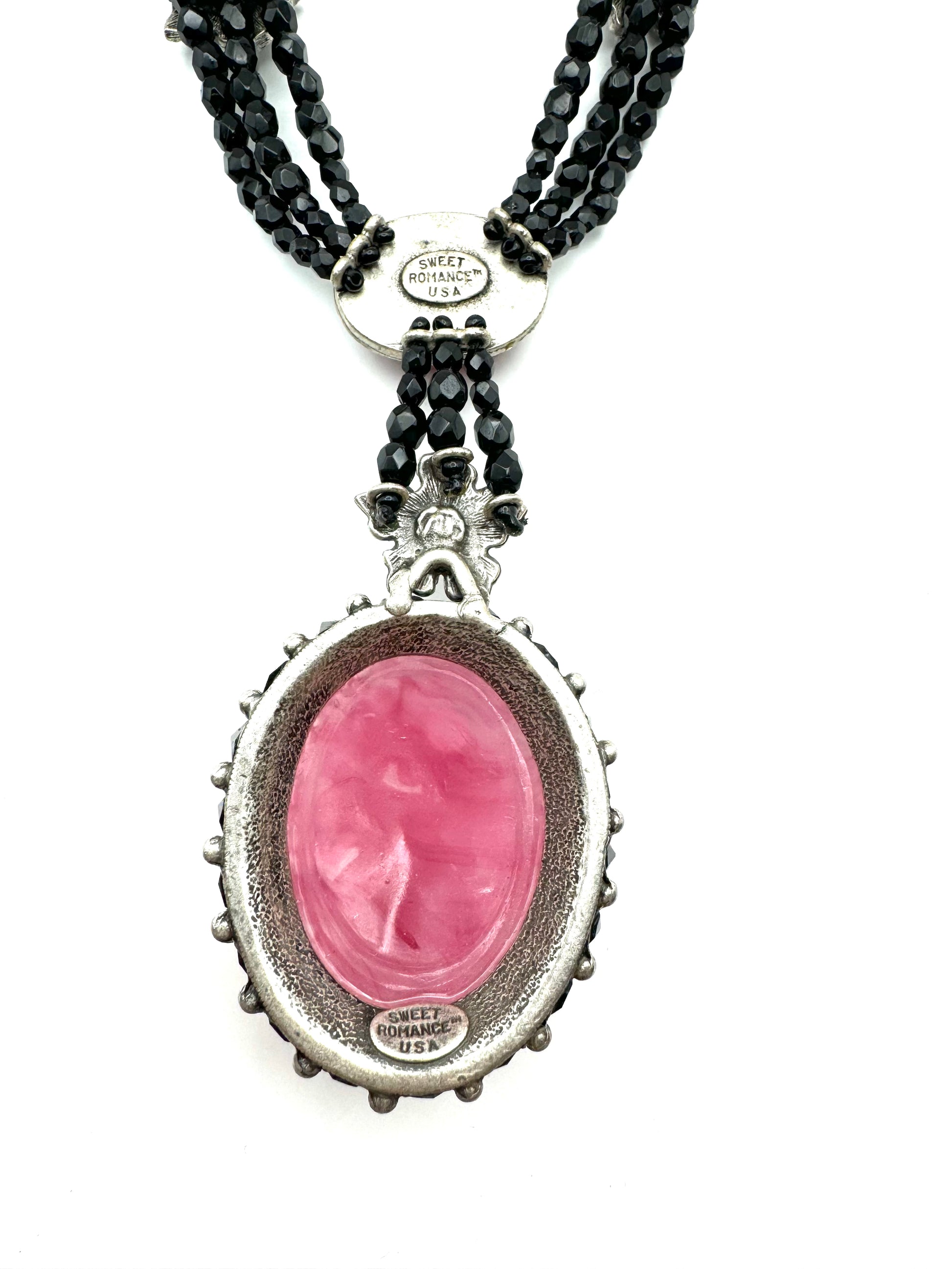 "Demure and totally Art Deco in form, color and elements...Three strands of faceted jet beads create a gently draped 'Y' silhouette. The two glass floral ovals are gorgeous vintage elements circa 1930s. They were created to appear as carved rose quartz, with detail in high relief and mottled coloration. The large oval rests in an open setting with a border of jet crystal and hematite flower. Exquisite, detailed metalwork, layered in burnished sterling silver, brings this design to life."