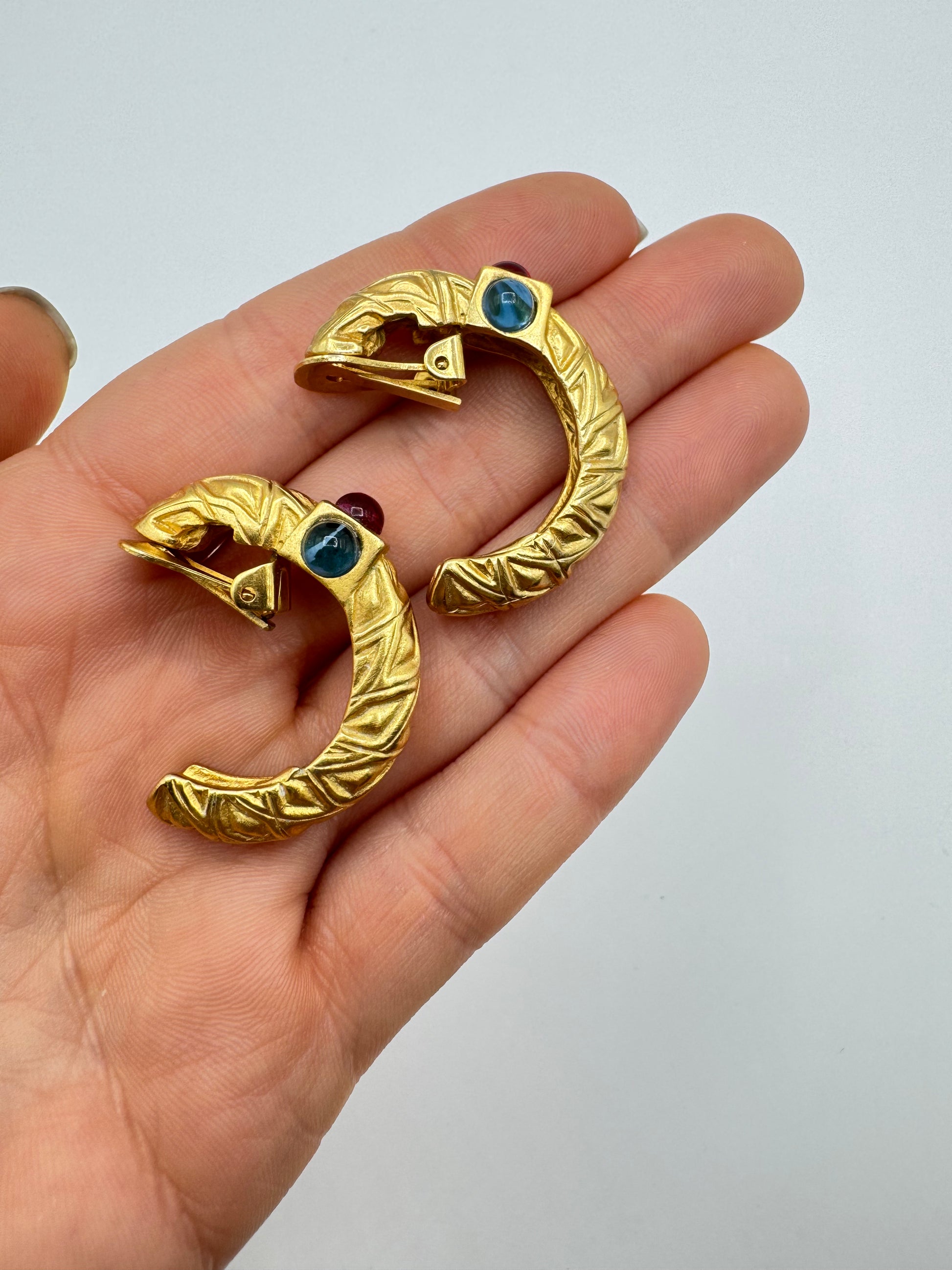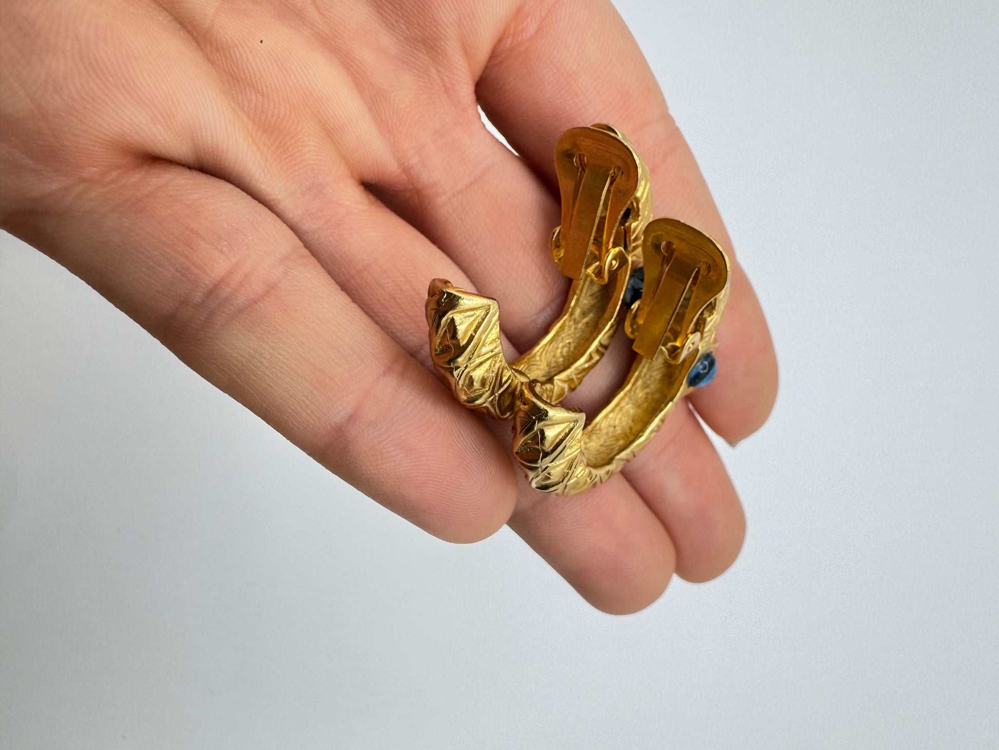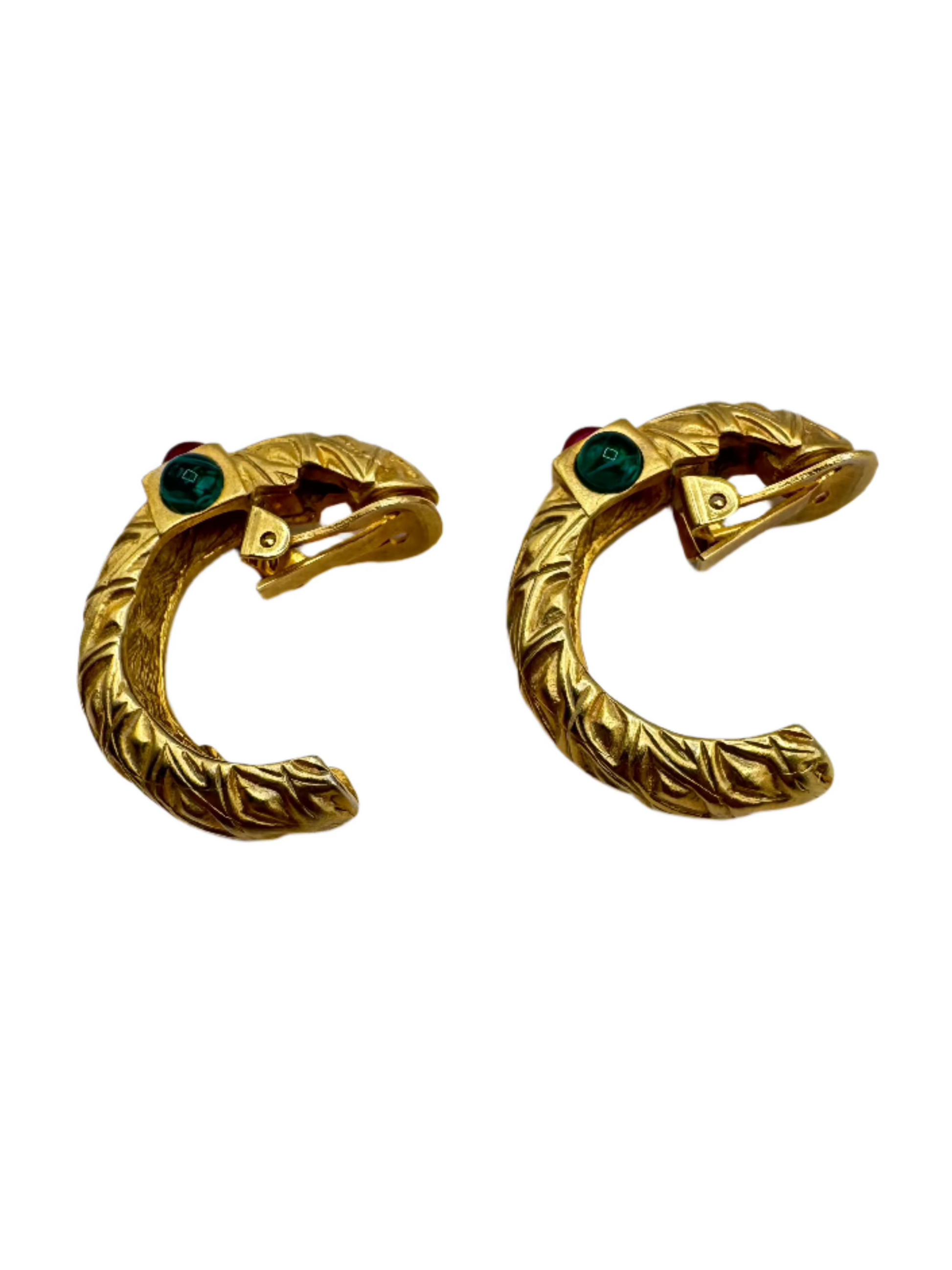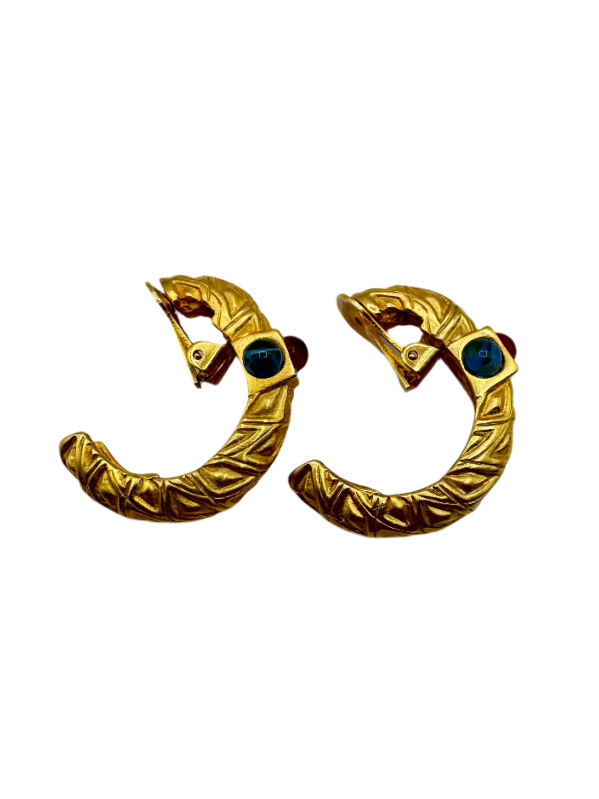 These striking vintage clip-on earrings feature a sculptural crescent shape with deeply textured gold-tone metal and colorful cabochon glass accents. The vivid jewel tones—blue,red and green—add a pop of color to the bold matte gold design. Though unsigned, they reflect the iconic statement styles of the 1980s costume jewelry era.