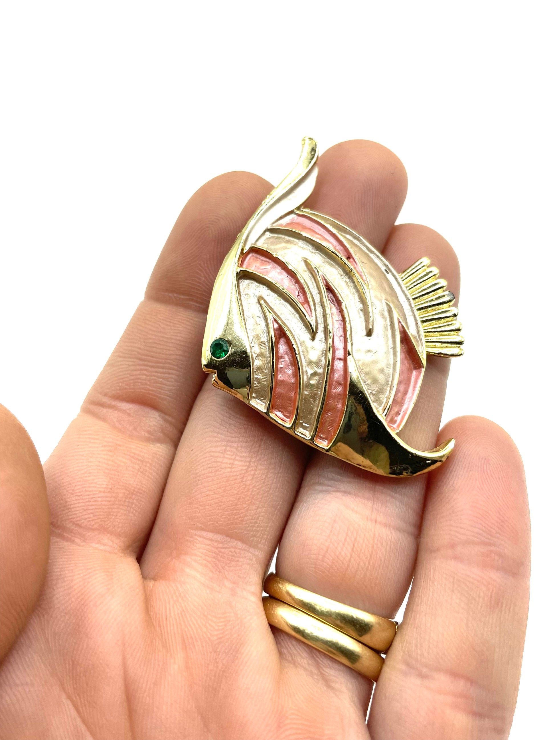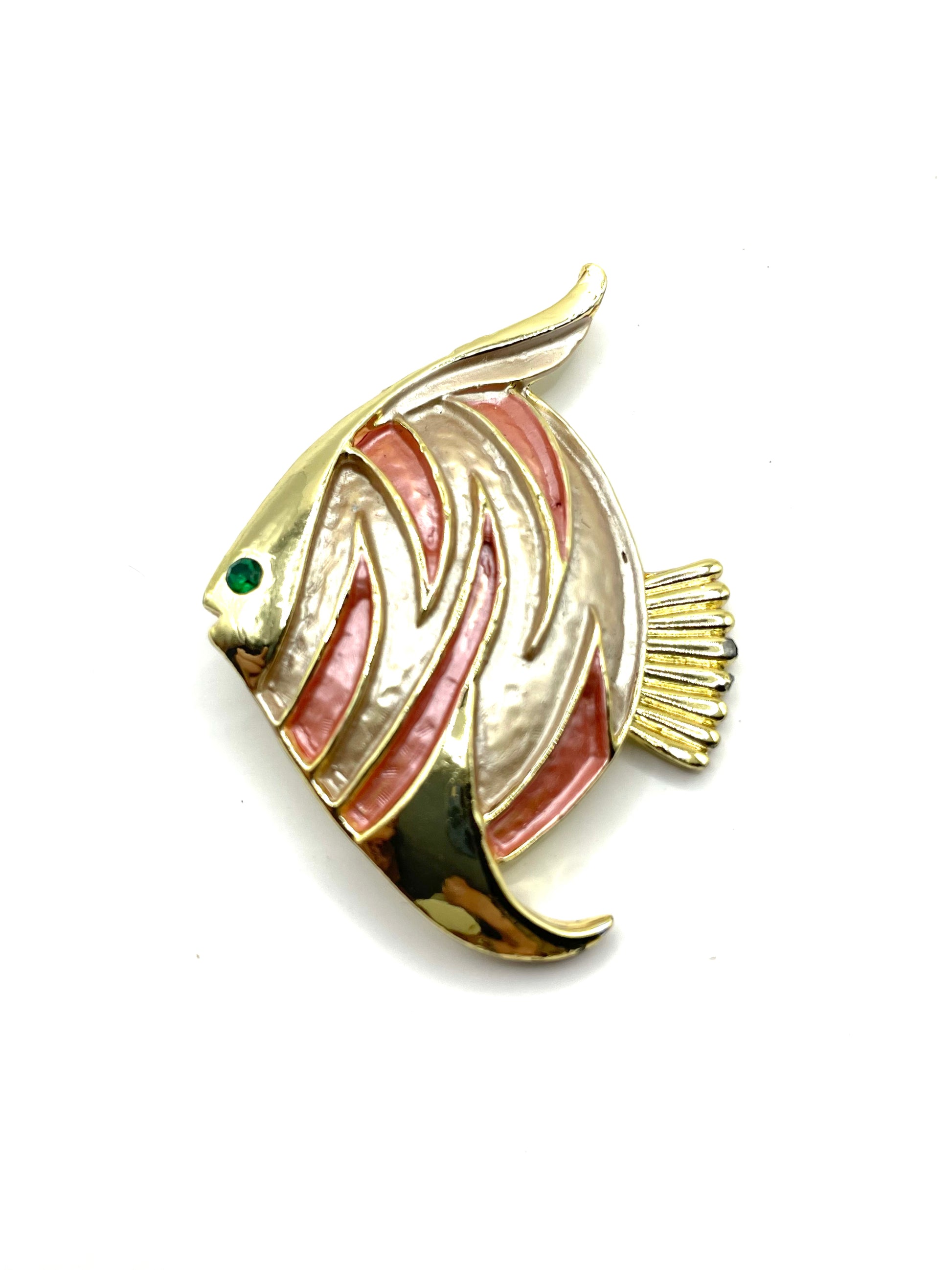 Vintage Gold Tone Pink Enamel Angel Fish with Rhinestone Brooch Pin