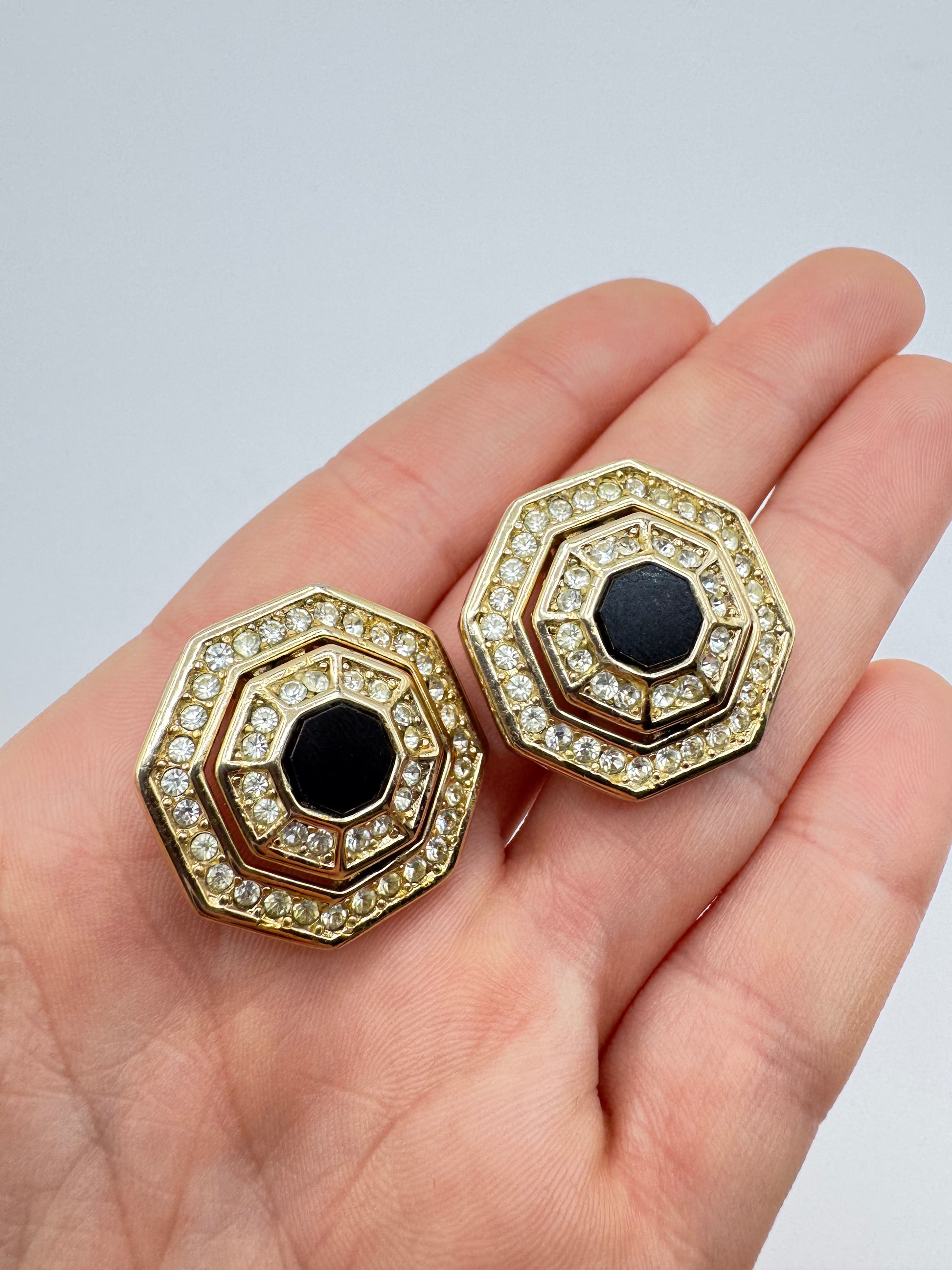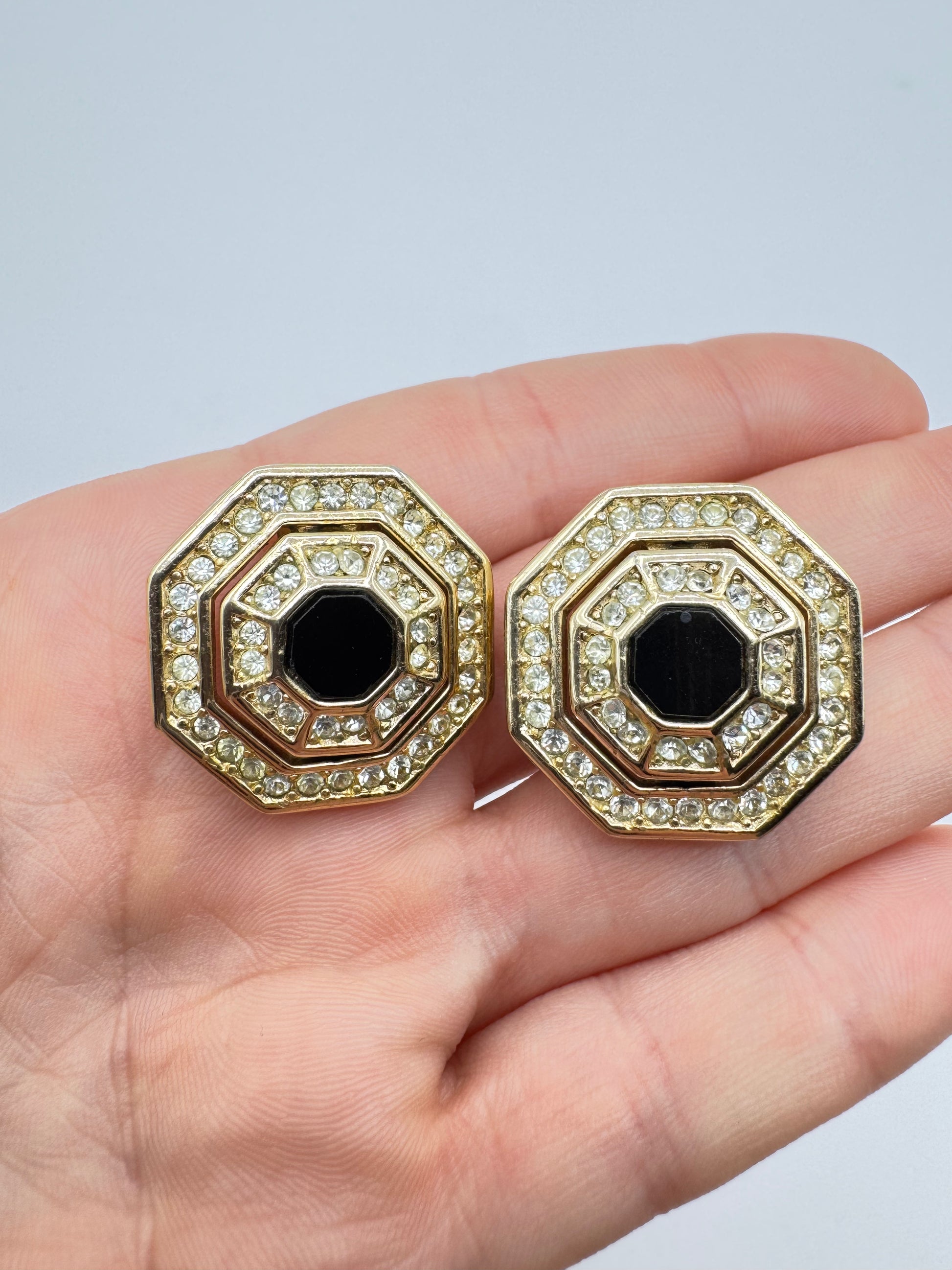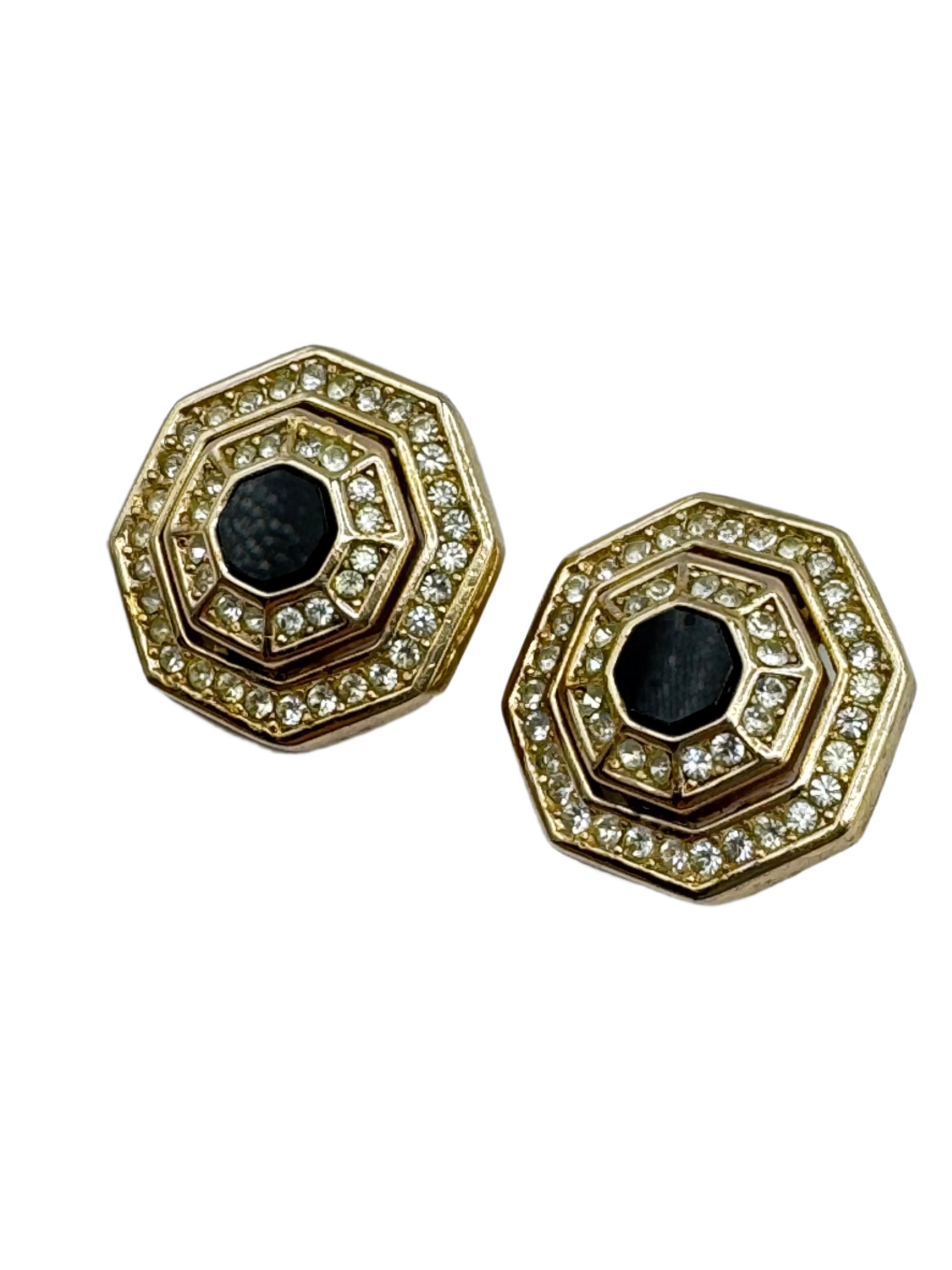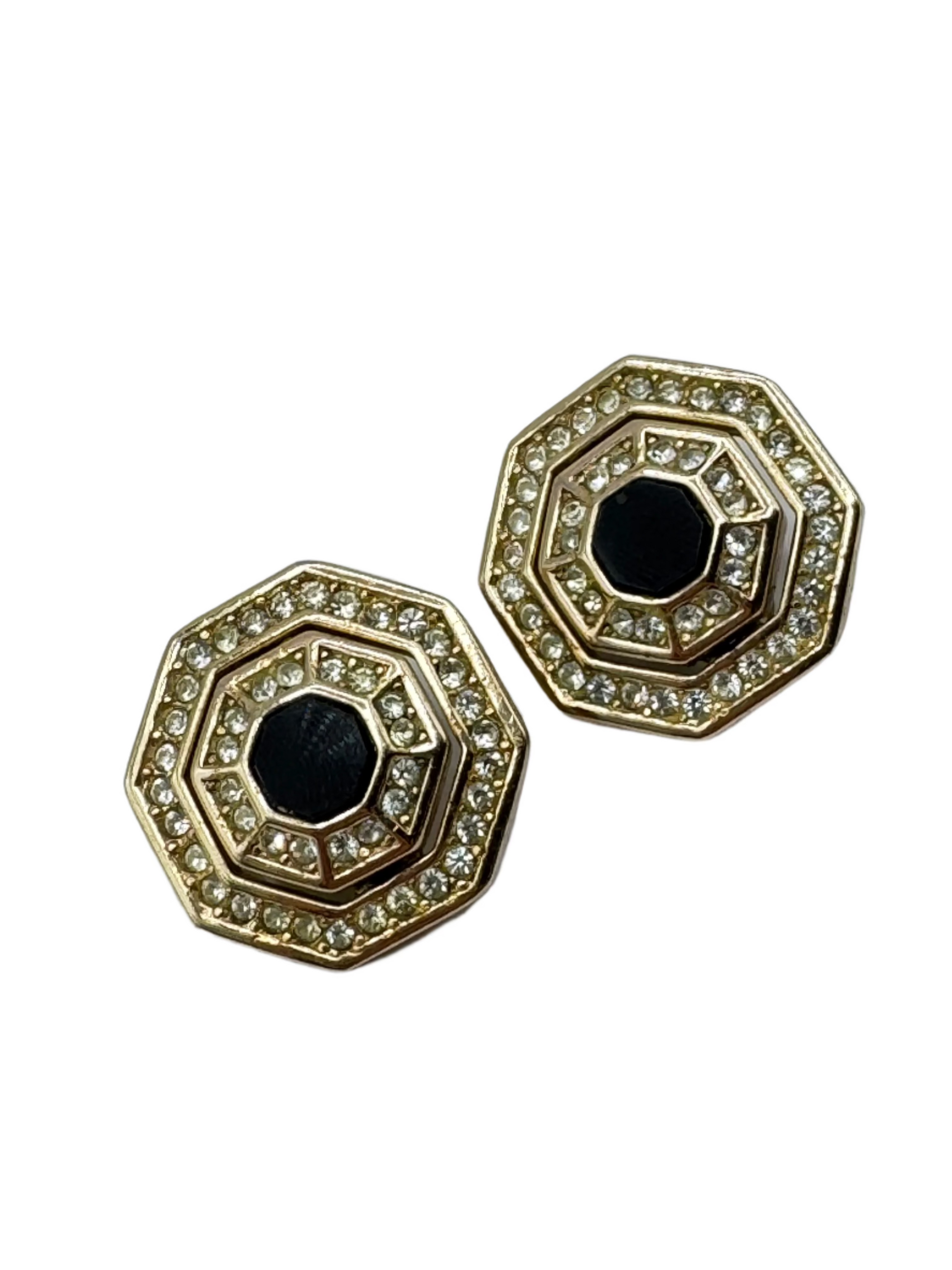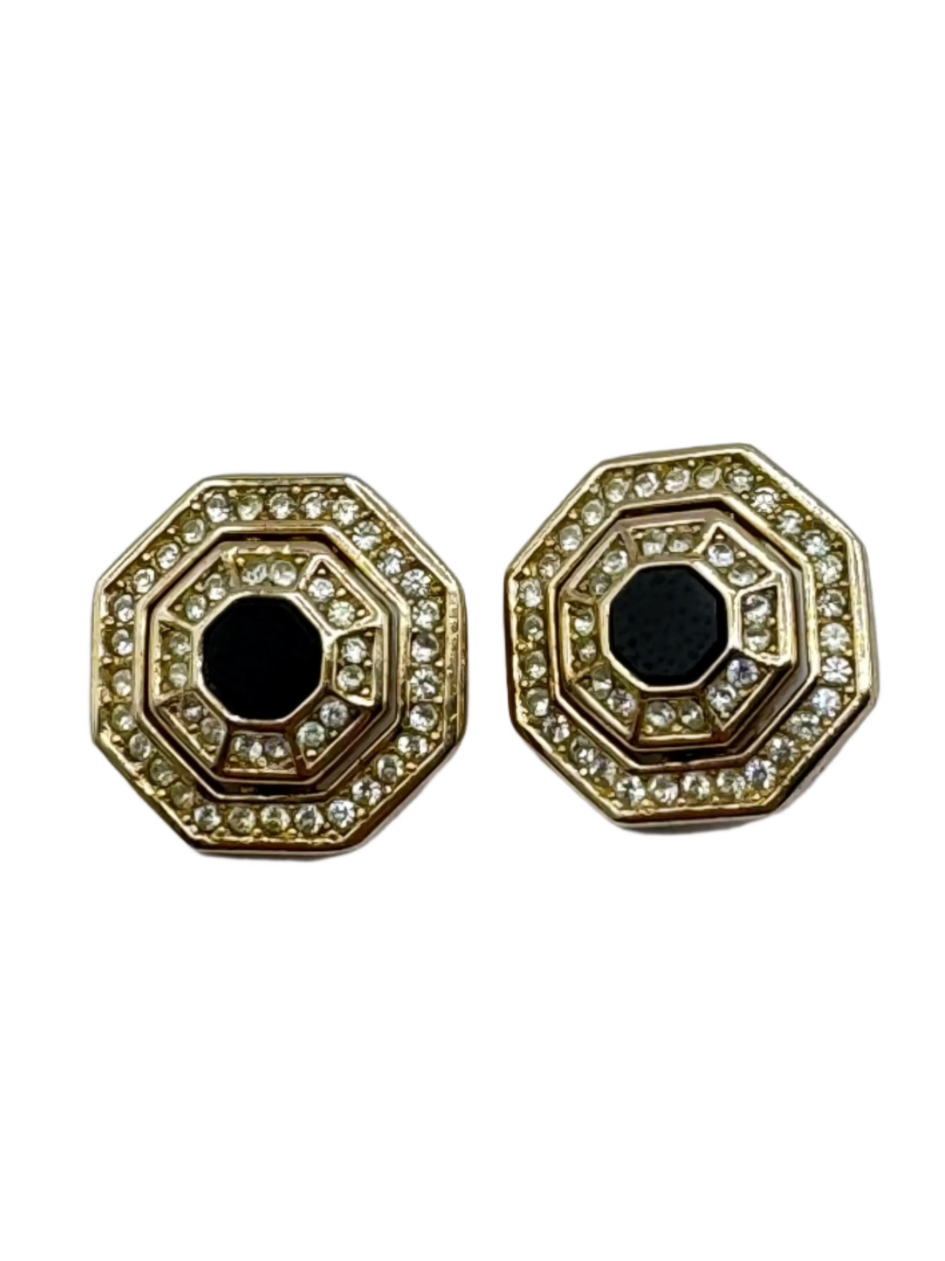 Elegant and geometric, these vintage Grosse earrings showcase a bold octagonal silhouette with a jet-black glass center, framed by two rows of brilliant clear rhinestones. The gold-tone finish adds warmth and richness to the design, creating a timeless accessory that echoes the glamour of Art Deco with a modern edge.