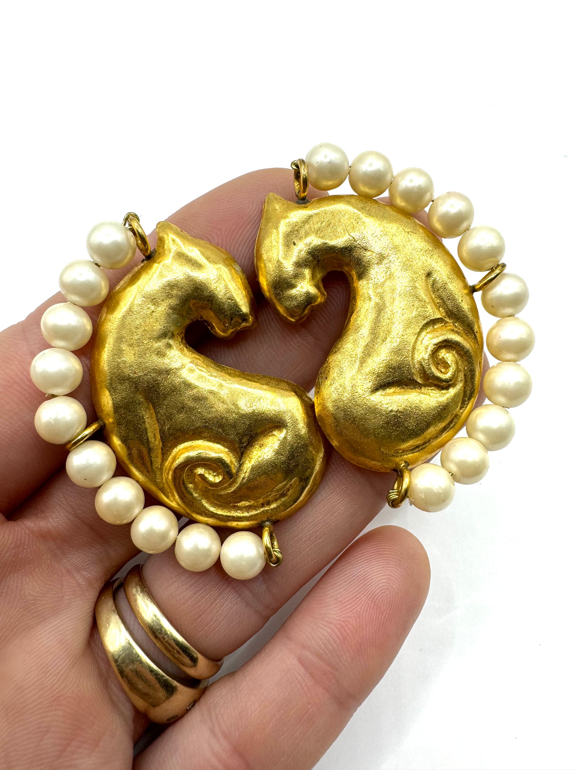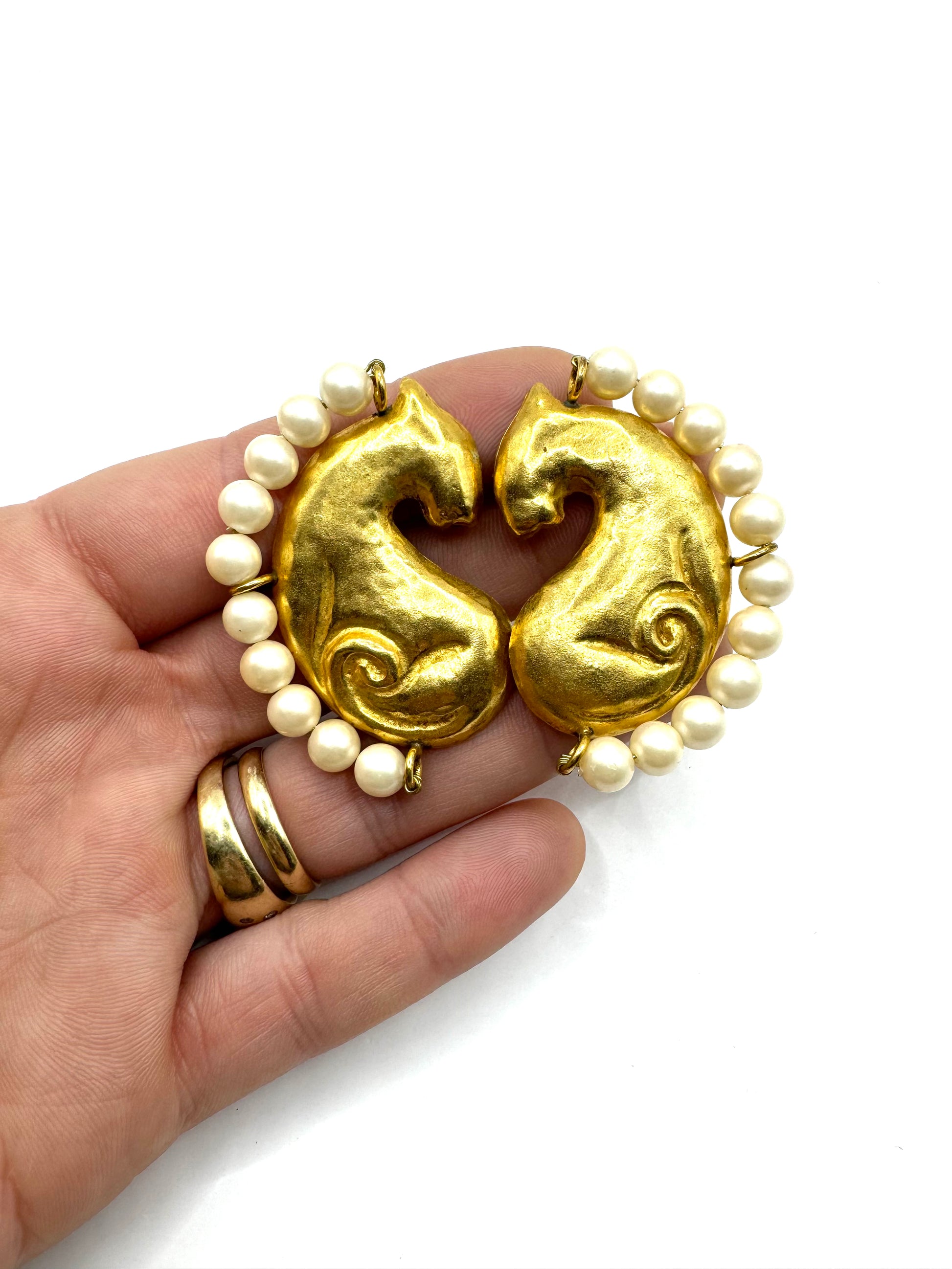 Here you are looking at this wonderful vintage piece attributed to the French designer Jacques An Lanh. I couldn't find precise information about the exact date of the piece, but I believe it belongs to the boldness of the 80s. It features a seated female lion adorned with faux pearls, creating a fantastic design. From what I can see, there doesn't appear to be any tarnishing. Please examine the detailed photographs. The dimensions of the piece are 2 inches in length and 1 inch in width. I strongly recommend adding this strikingly patterned collectible to your collection.