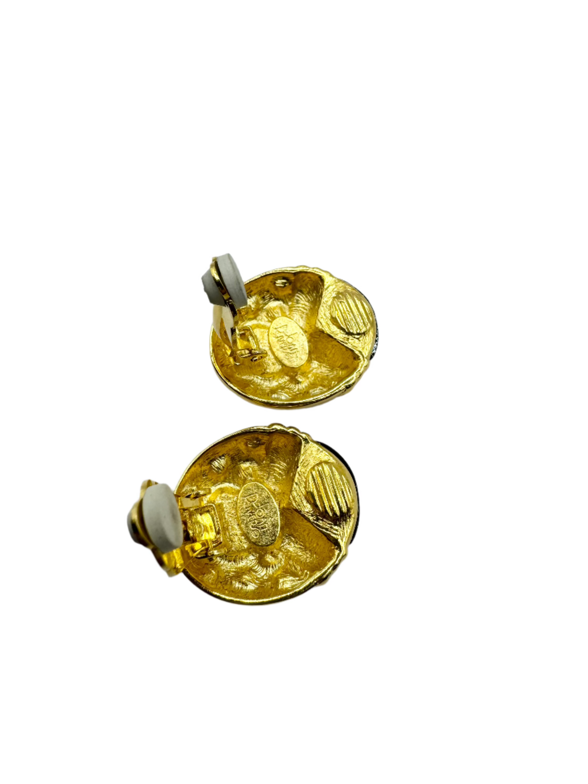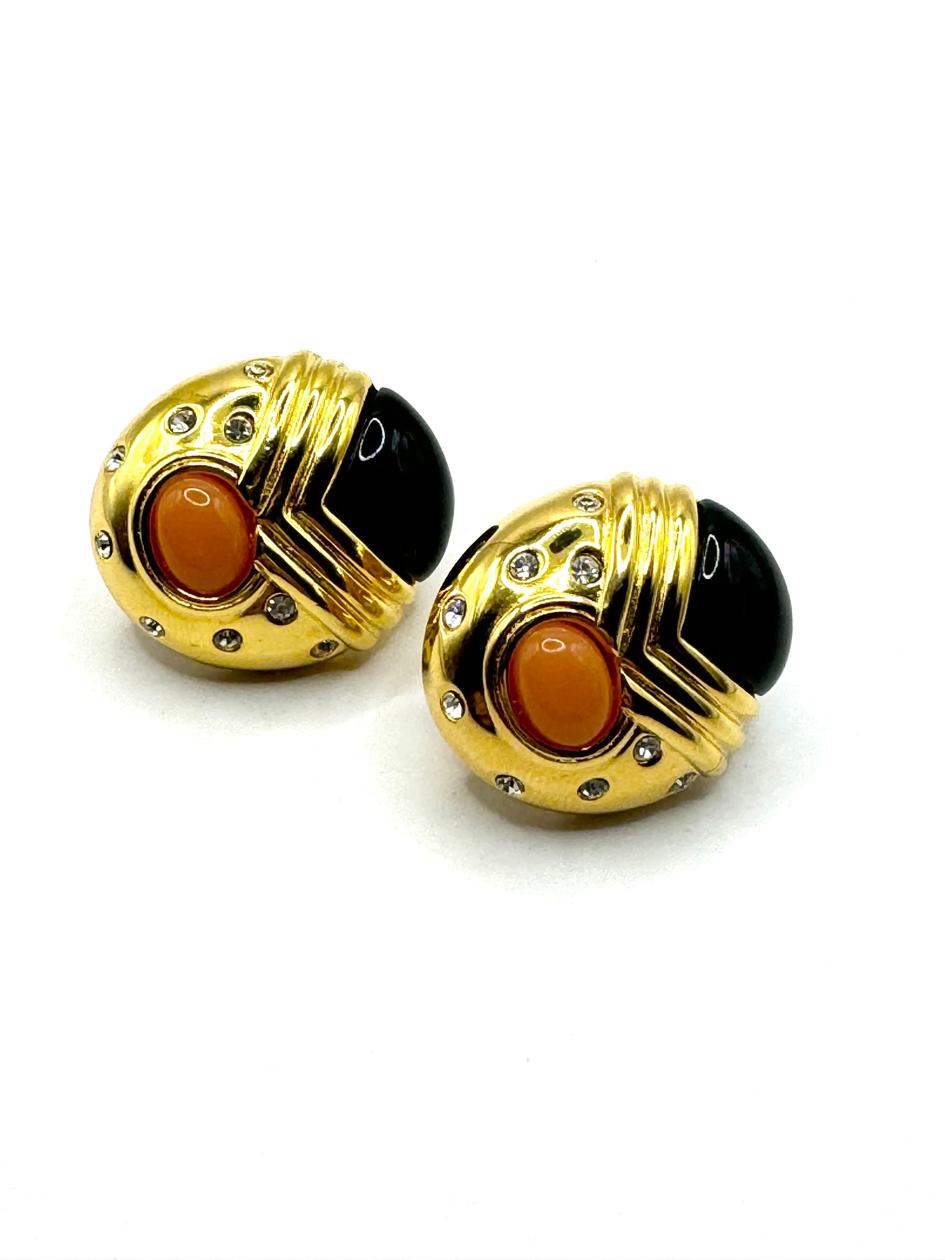 Vintage Joan Rivers Gold Tone Enamel Lucite Cabochon Rhinestone Clip on Earrings