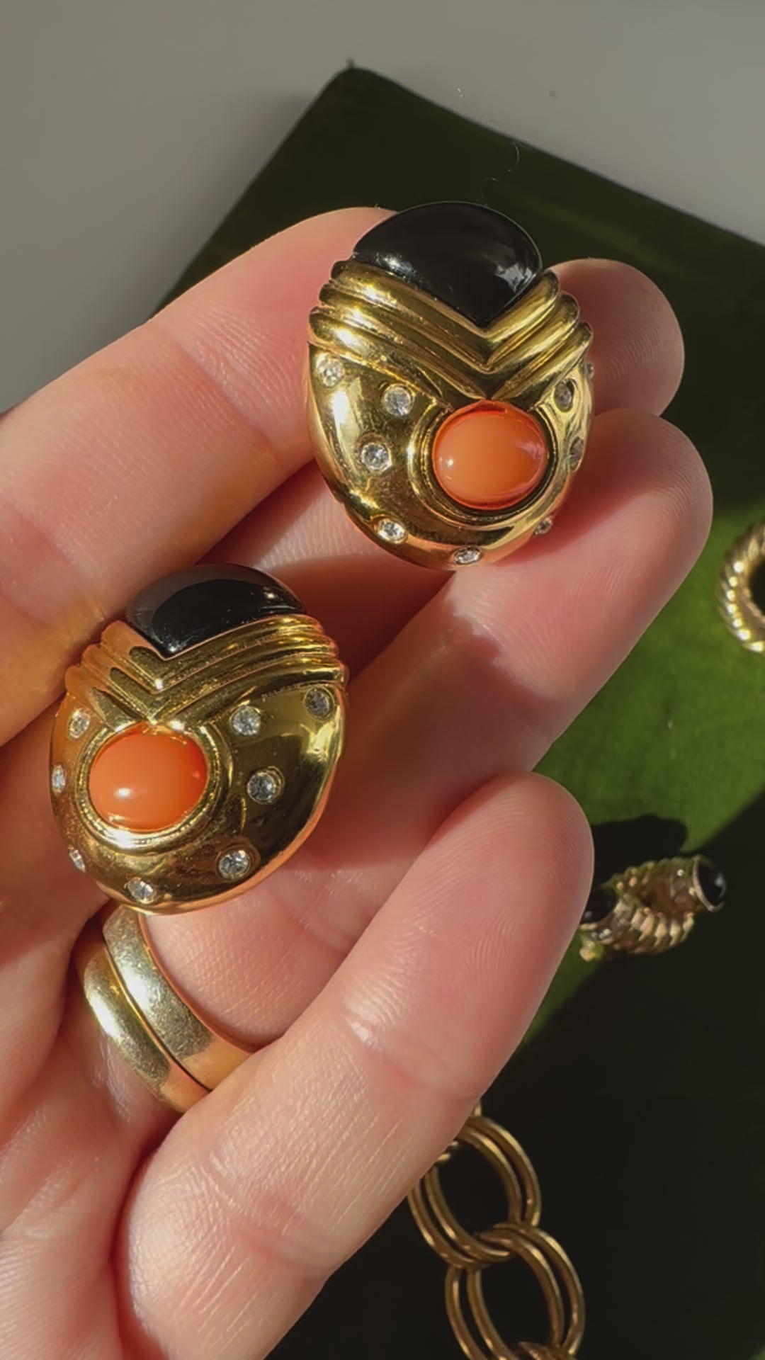 A chic and elegant piece from Joan Rivers Jewelry. Featuring black enamel with a gold-tone chevron detail, beautifully followed by coral-colored Lucite cabochons. The design is accented with scattered Austrian crystals, creating a stunning color combination. Perfect for completing a blazer look, especially if you're a fan of Joan Rivers Jewelry. The clips work flawlessly, and the earrings are in excellent vintage condition.