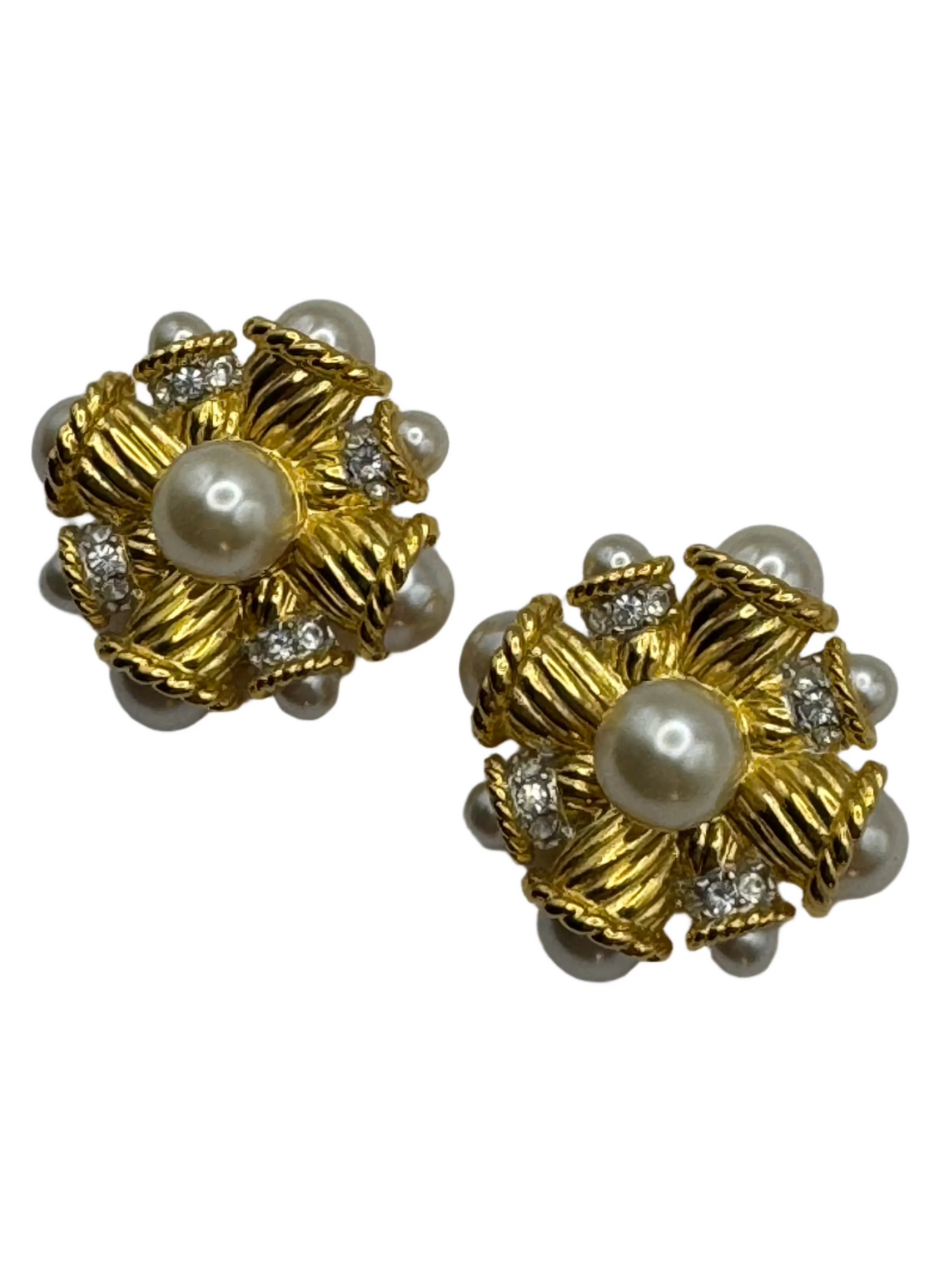 Stunning vintage Kenneth Jay Lane clip on earrings featuring an intricate gold tone design. These elegant statement earrings are adorned with luminous faux pearls at the center and surrounding edges, beautifully accented with sparkling clear crystals. The textured gold detailing adds depth and sophistication making them a timeless addition to any jewelry collection.
